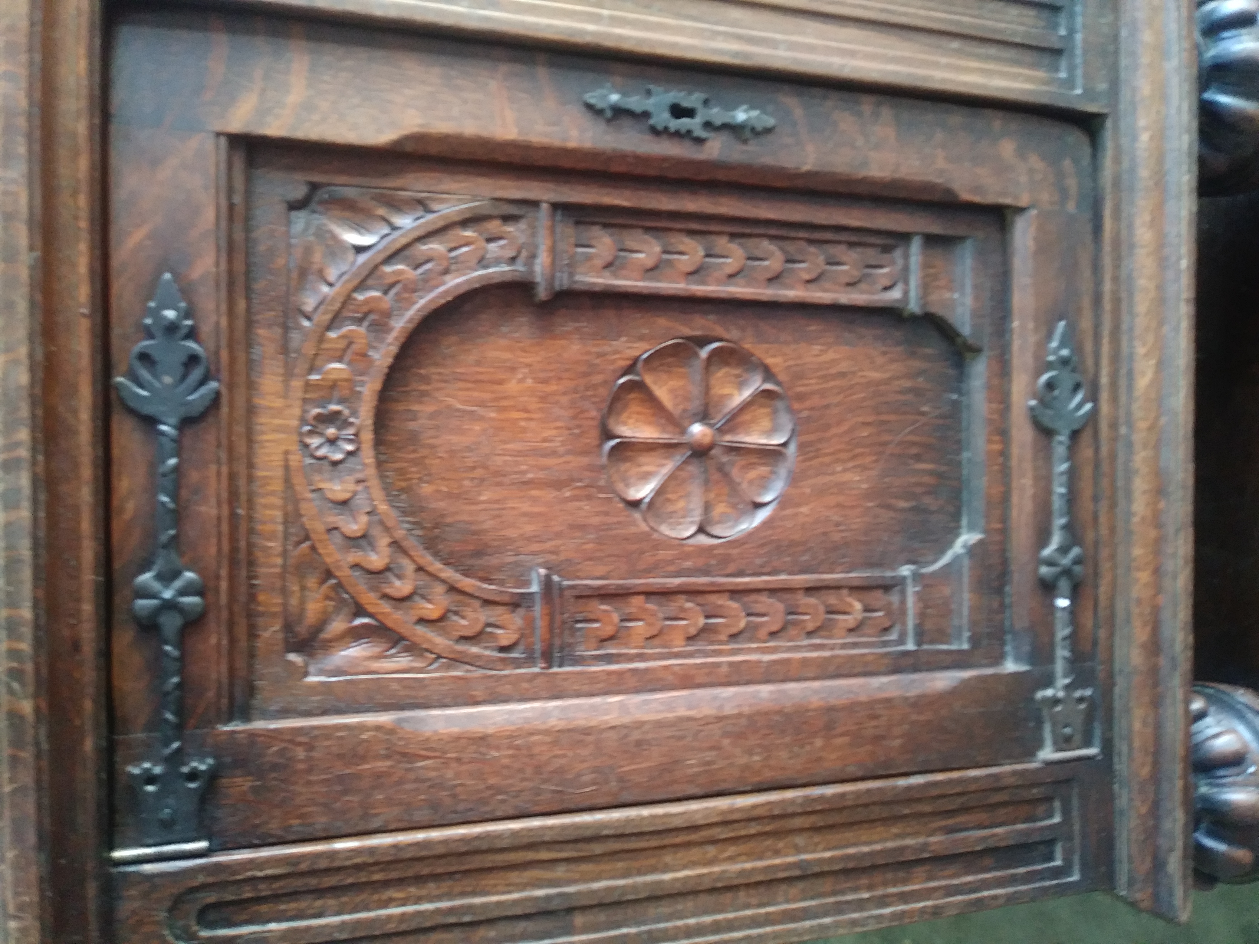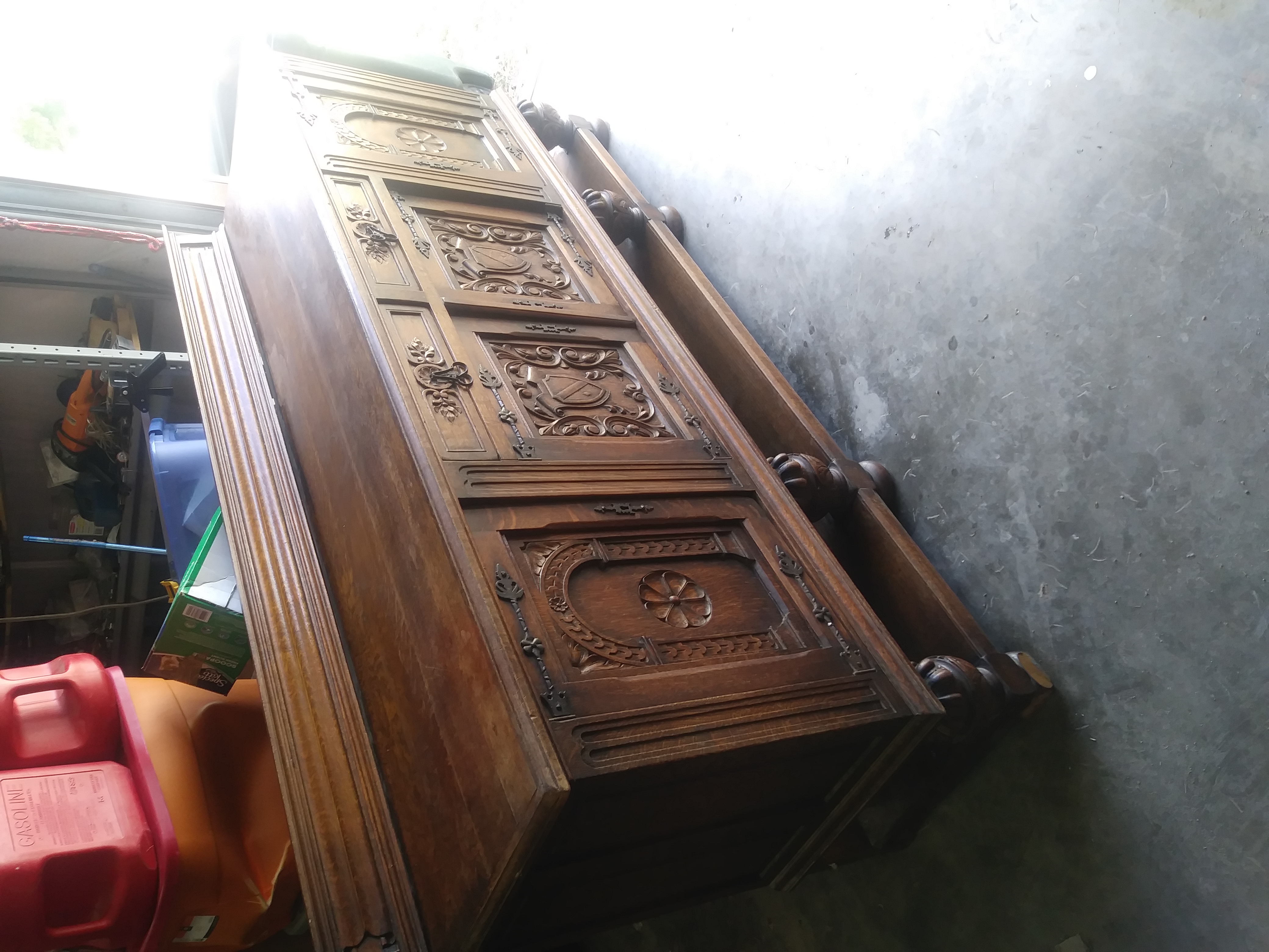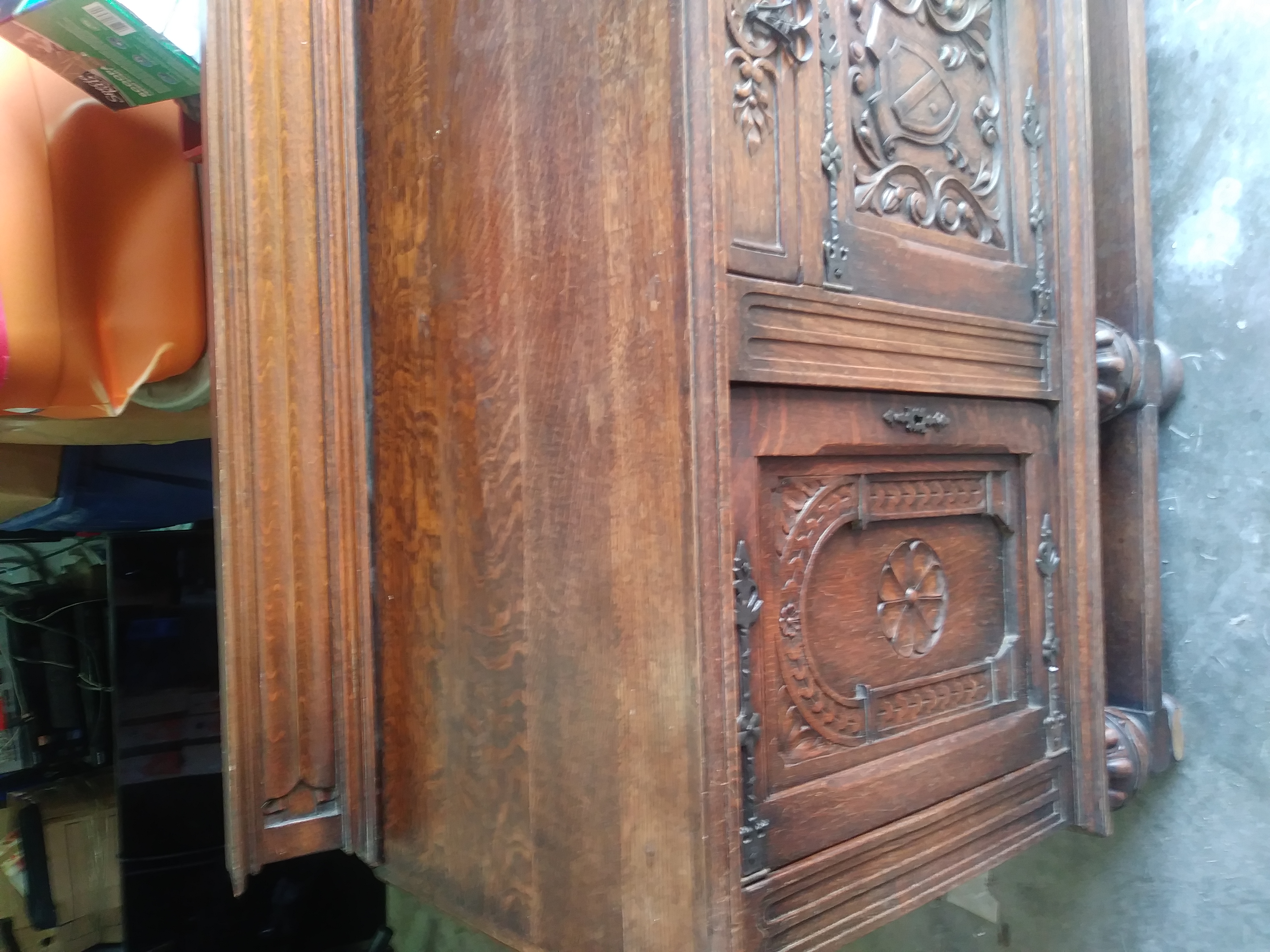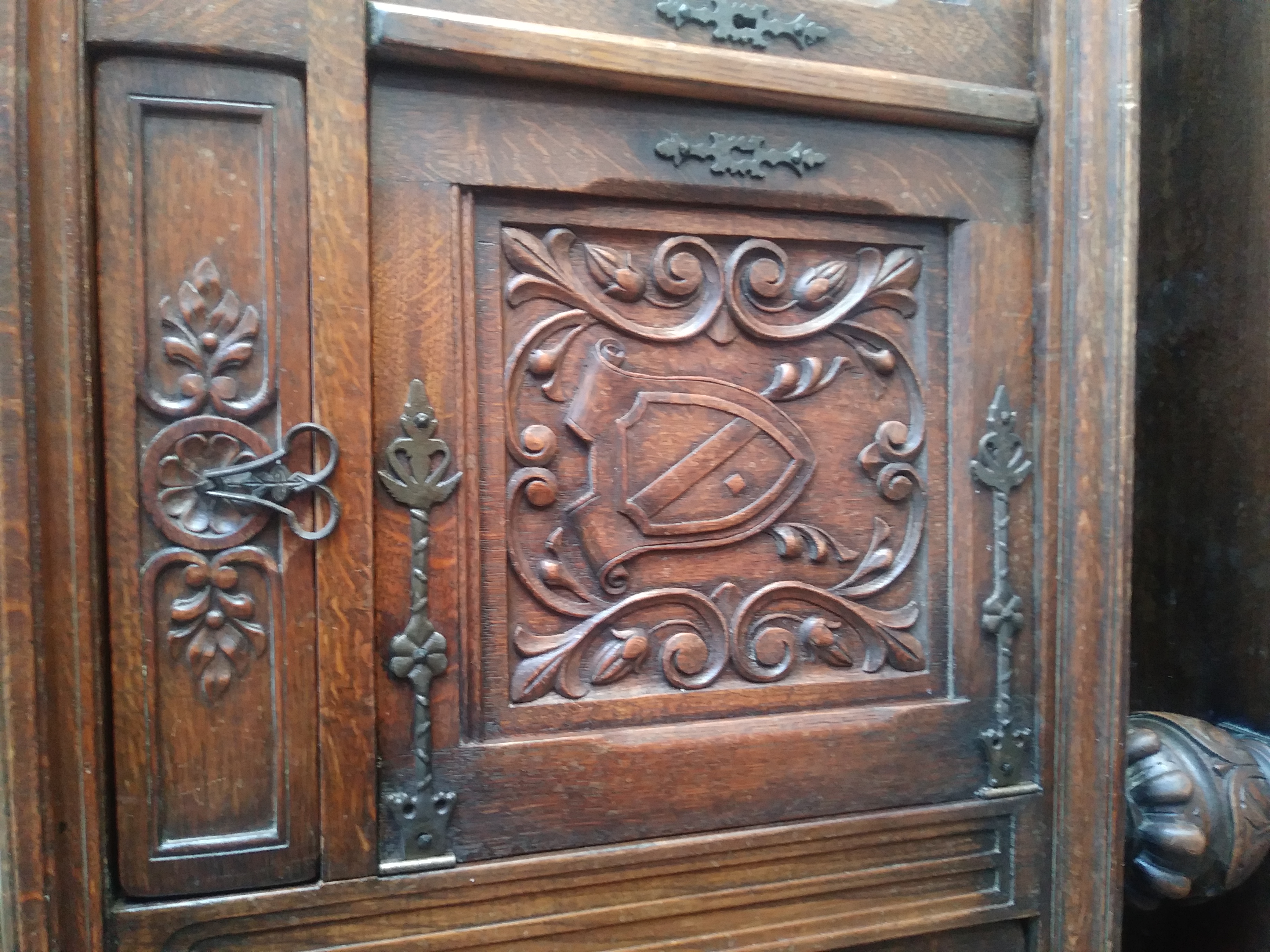 I got this piece 13 years ago from a millionaire that i was moving. He told me that he had paid 2500.00 for the piece 25 years ago. He didn't really know anything about the piece. This piece is 7'long, 3' tall and 2' deep. I believe it is made of walnut. All the hardware is made of iron and its fastened together with iron spikes. Two of the front doors have sheild crests on them and there is a roman numeral number 8 carved in the back of the piece. I am interested in selling it but don't know what it may be worth. Any information would be very helpful. Thank you very much in advance and God bless you!