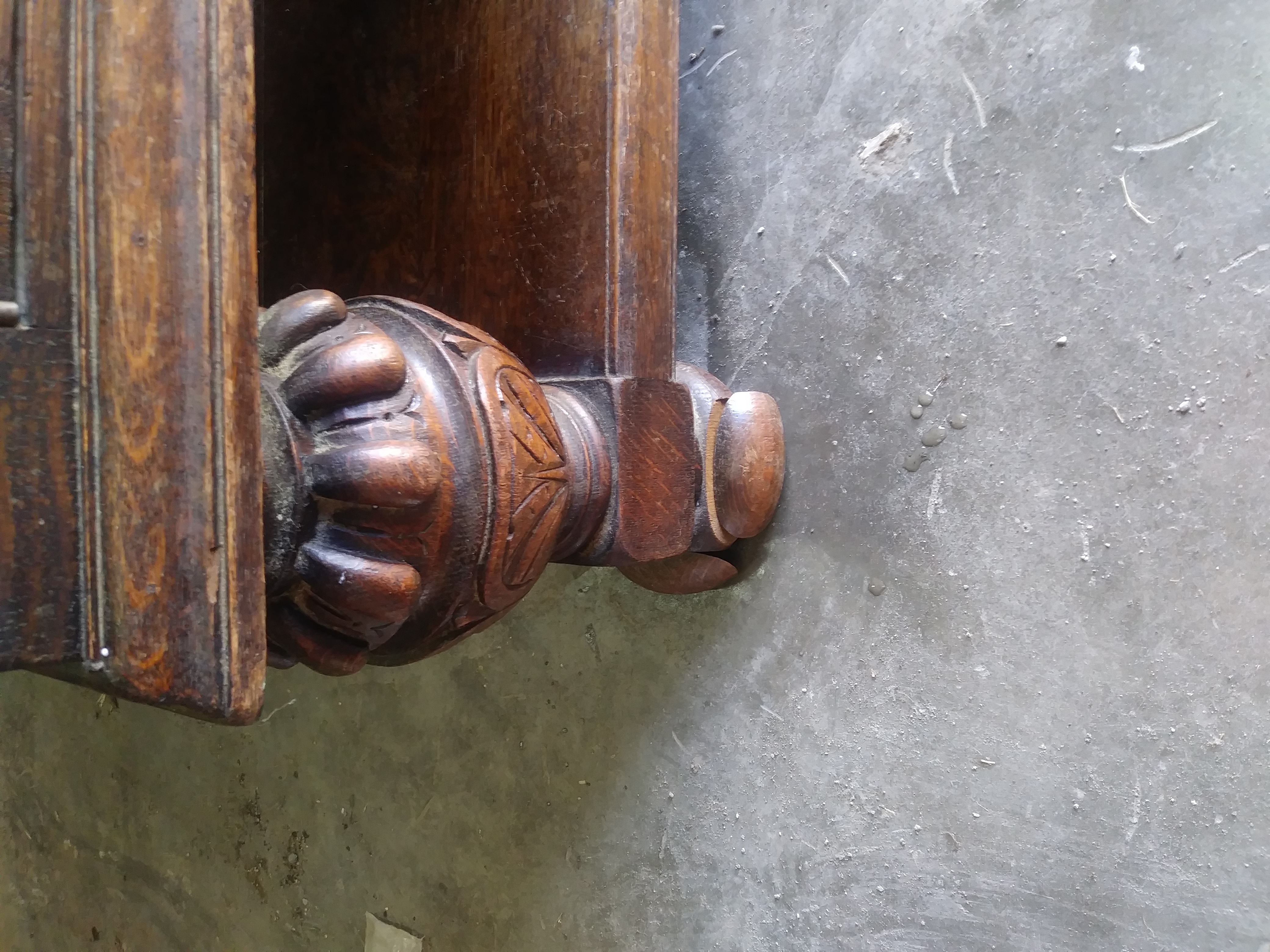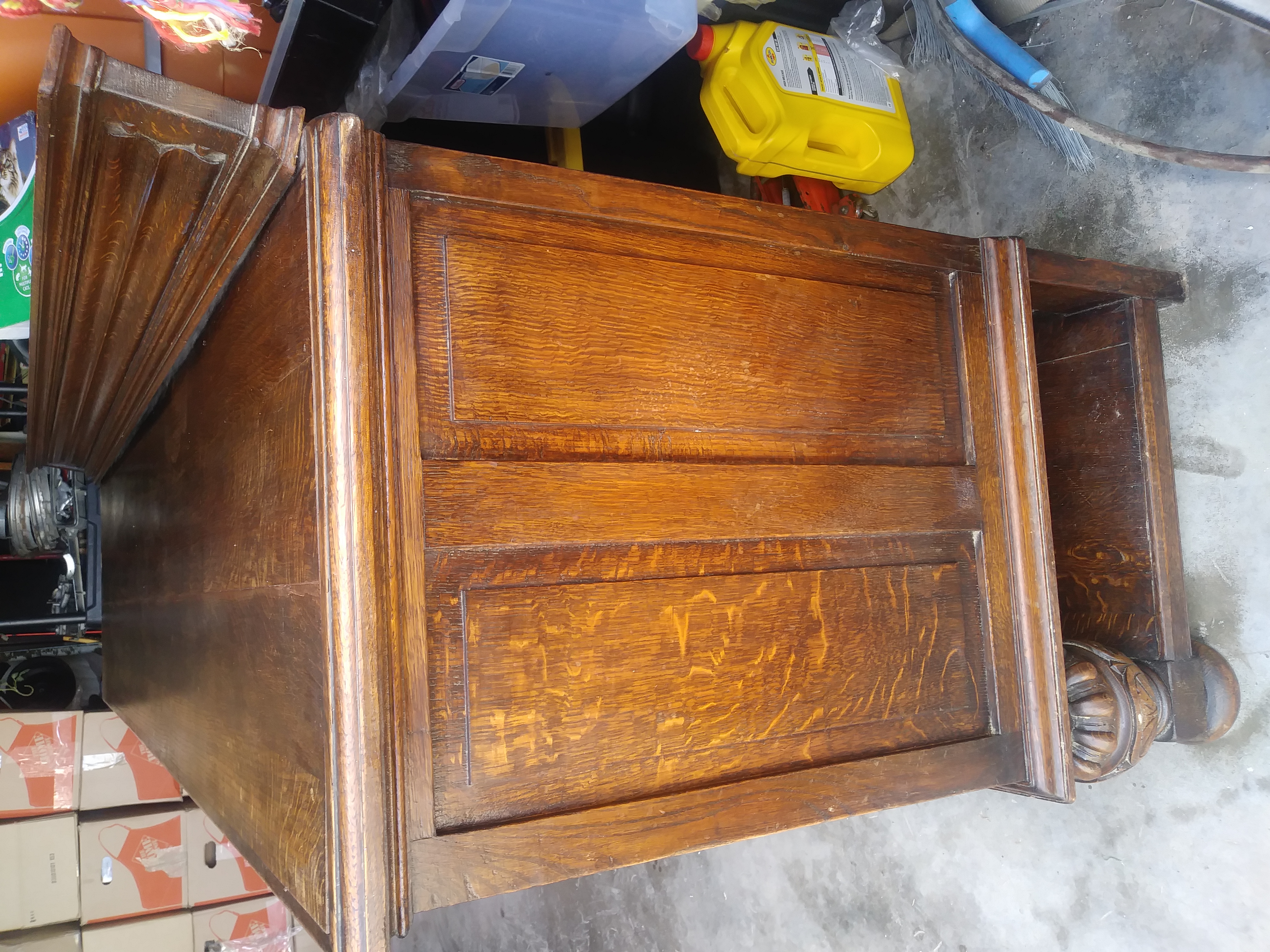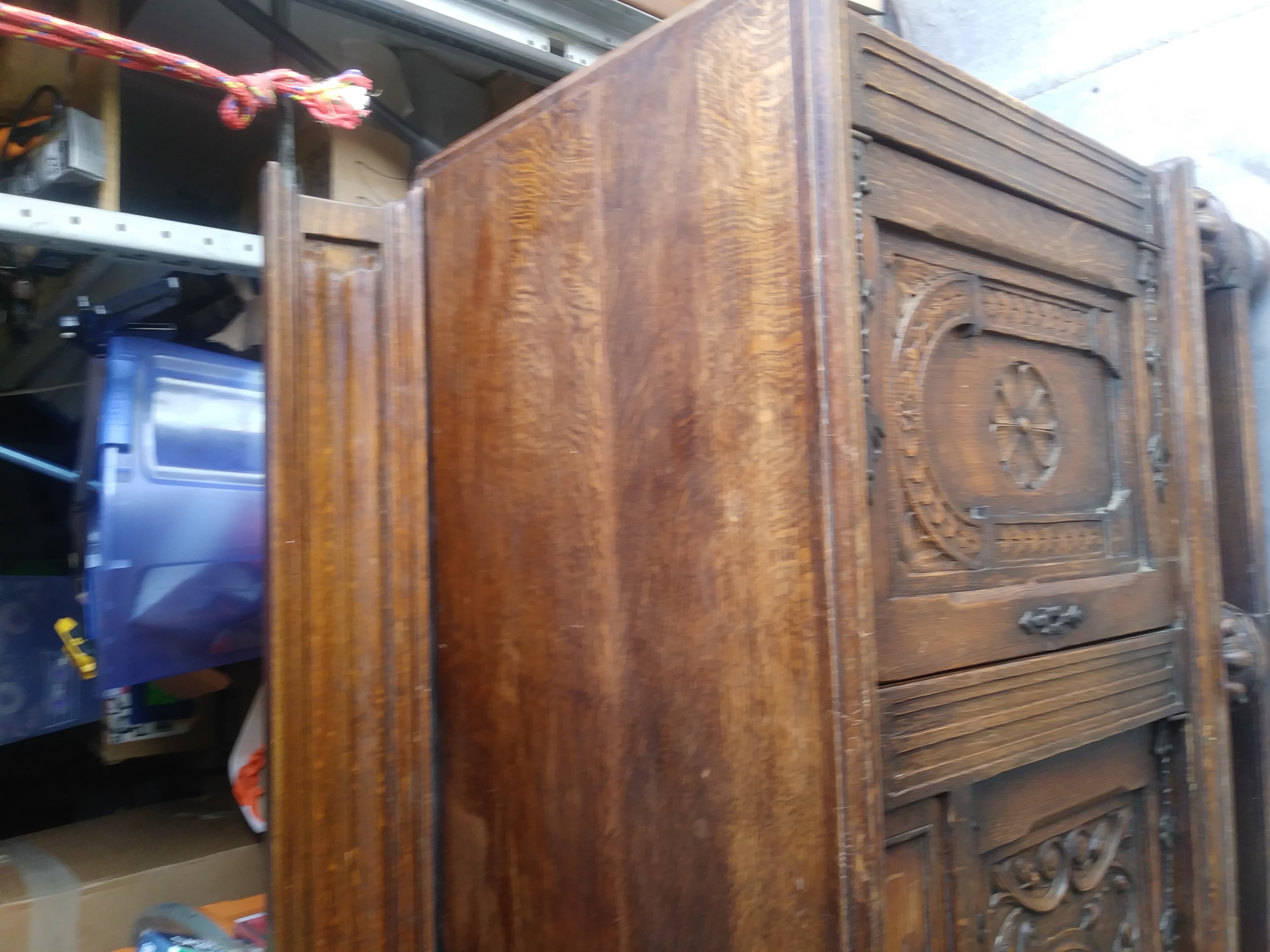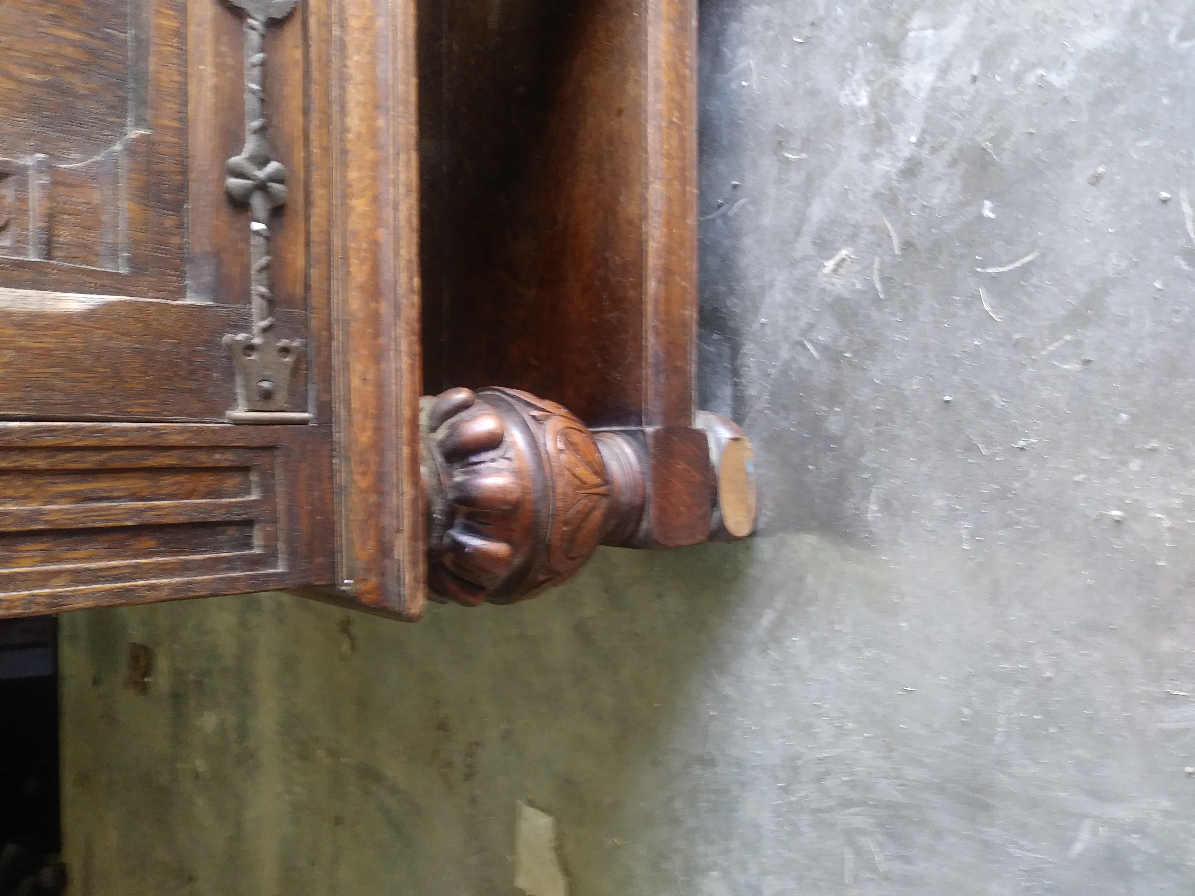 I got this piece 13 years ago from a millionaire that i was moving. He told me that he had paid 2500.00 for the piece 25 years ago. He didn't really know anything about the piece. This piece is 7'long, 3' tall and 2' deep. I believe it is made of walnut. All the hardware is made of iron and its fastened together with iron spikes. Two of the front doors have sheild crests on them and there is a roman numeral number 8 carved in the back of the piece. I am interested in selling it but don't know what it may be worth. Any information would be very helpful. Thank you very much in advance and God bless you!