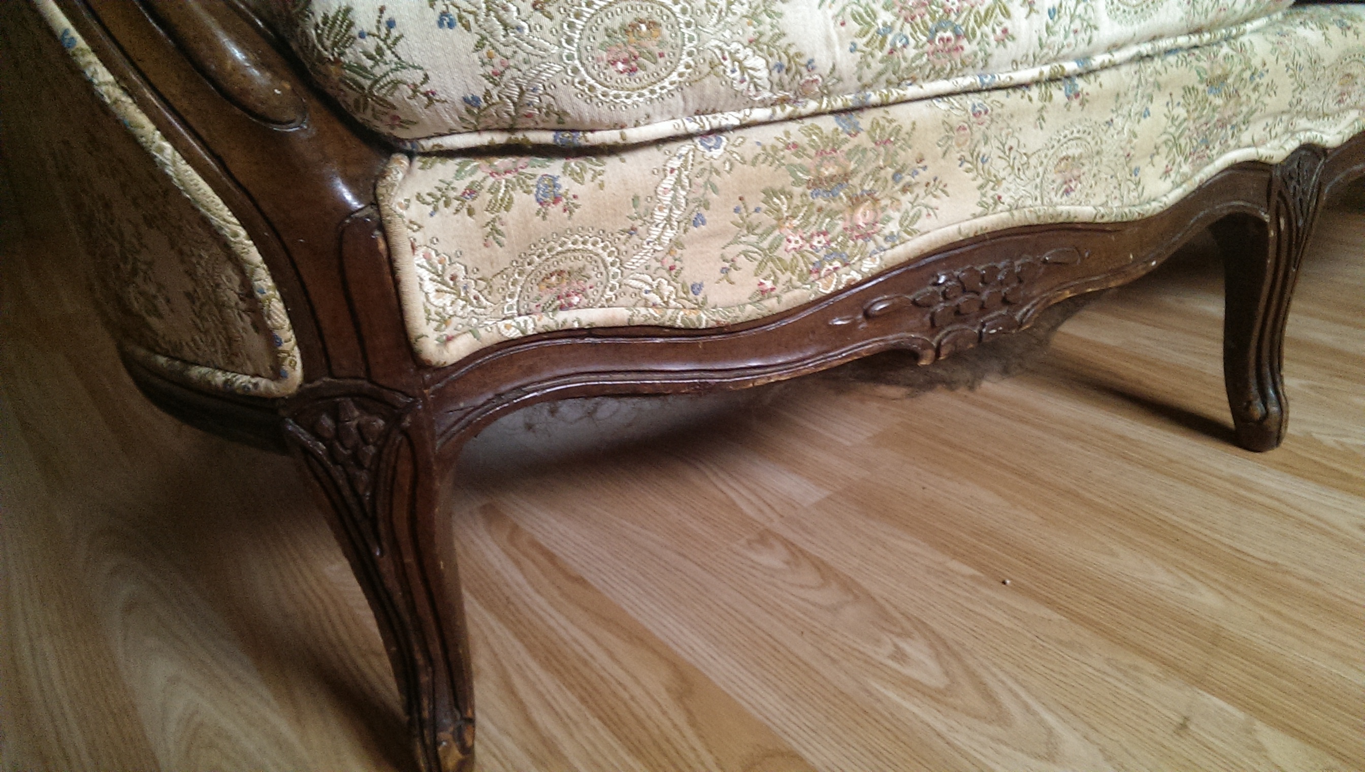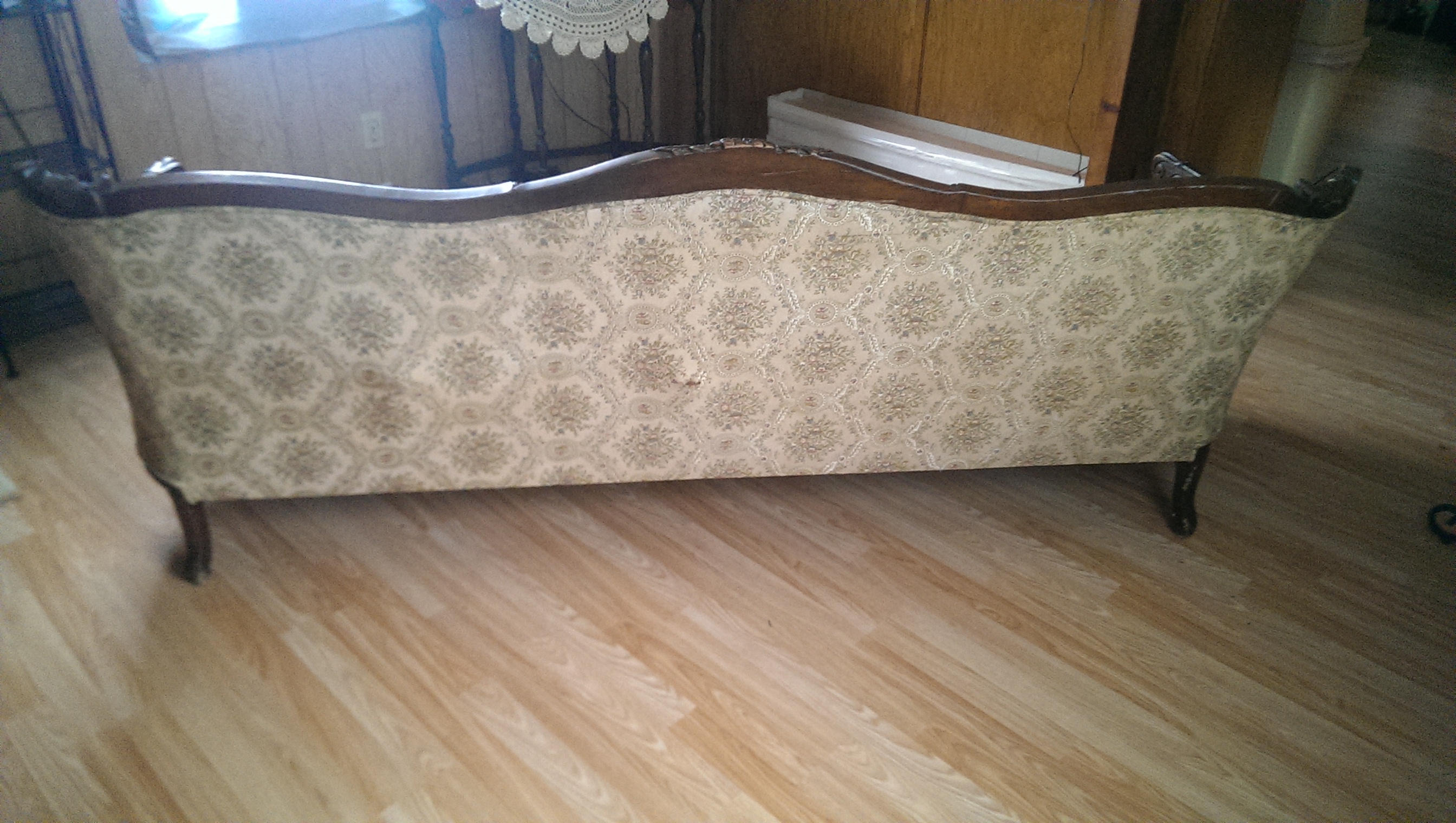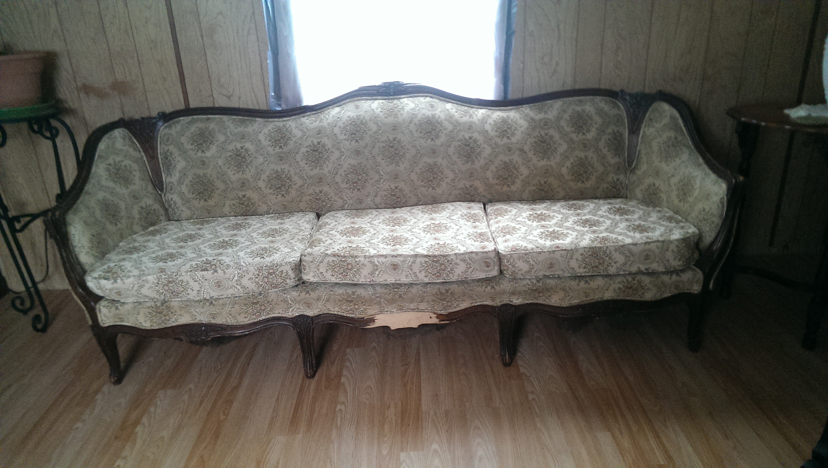 This couch is about 5-6'long. It has a cream floral print. There is a rip in one of the cushions. There is a section about 4-5",of the wood carving that is bare. (front, center). There is also a spring trying to push through the center of the back. Otherwise the couch is quite beautiful.