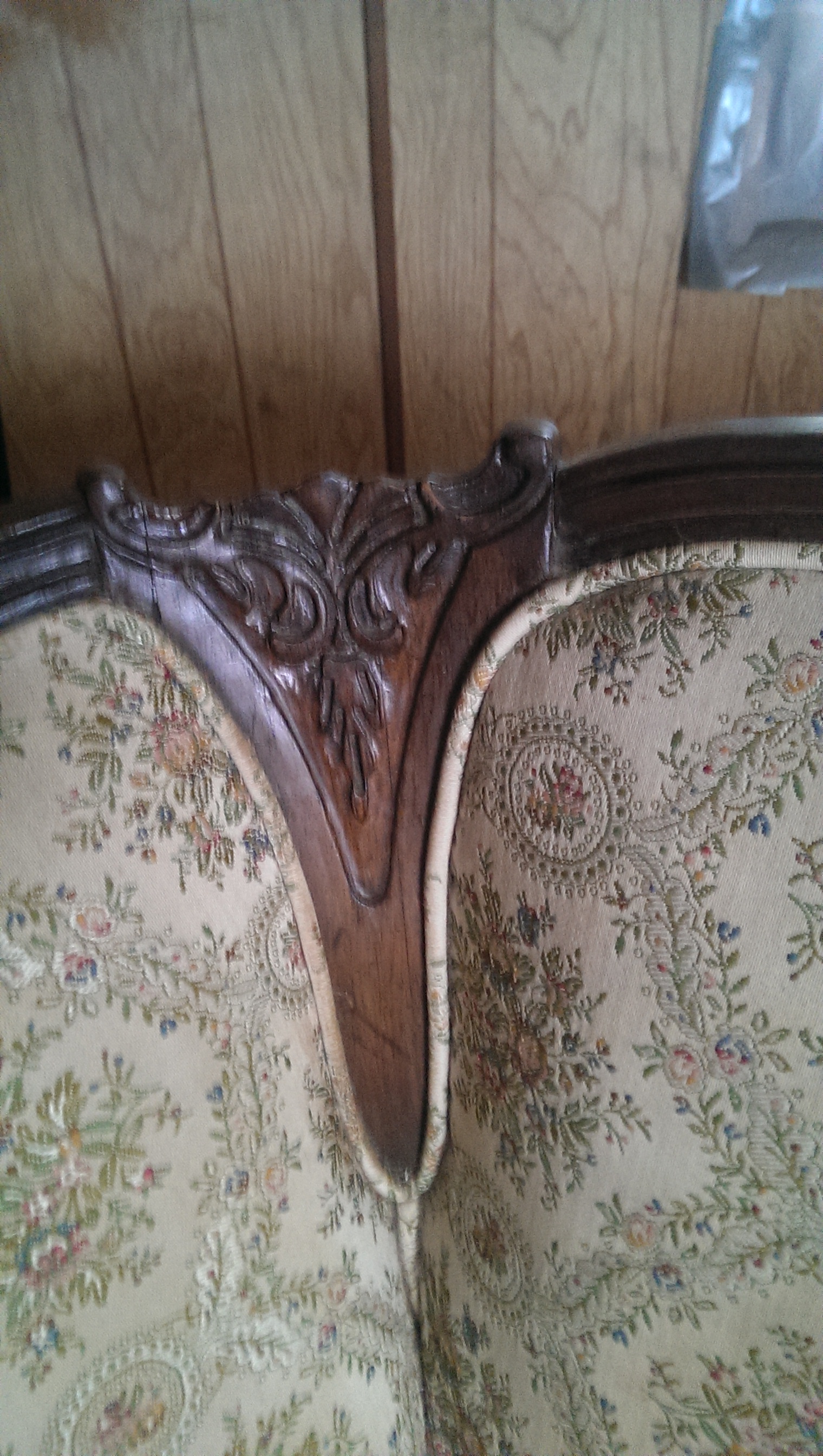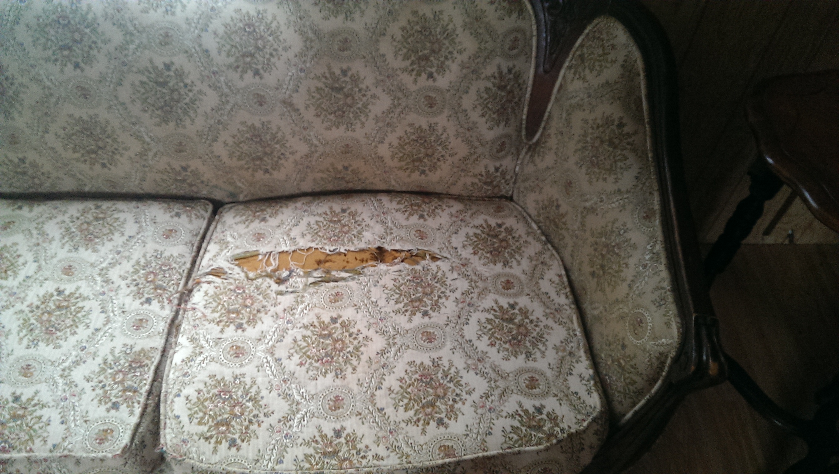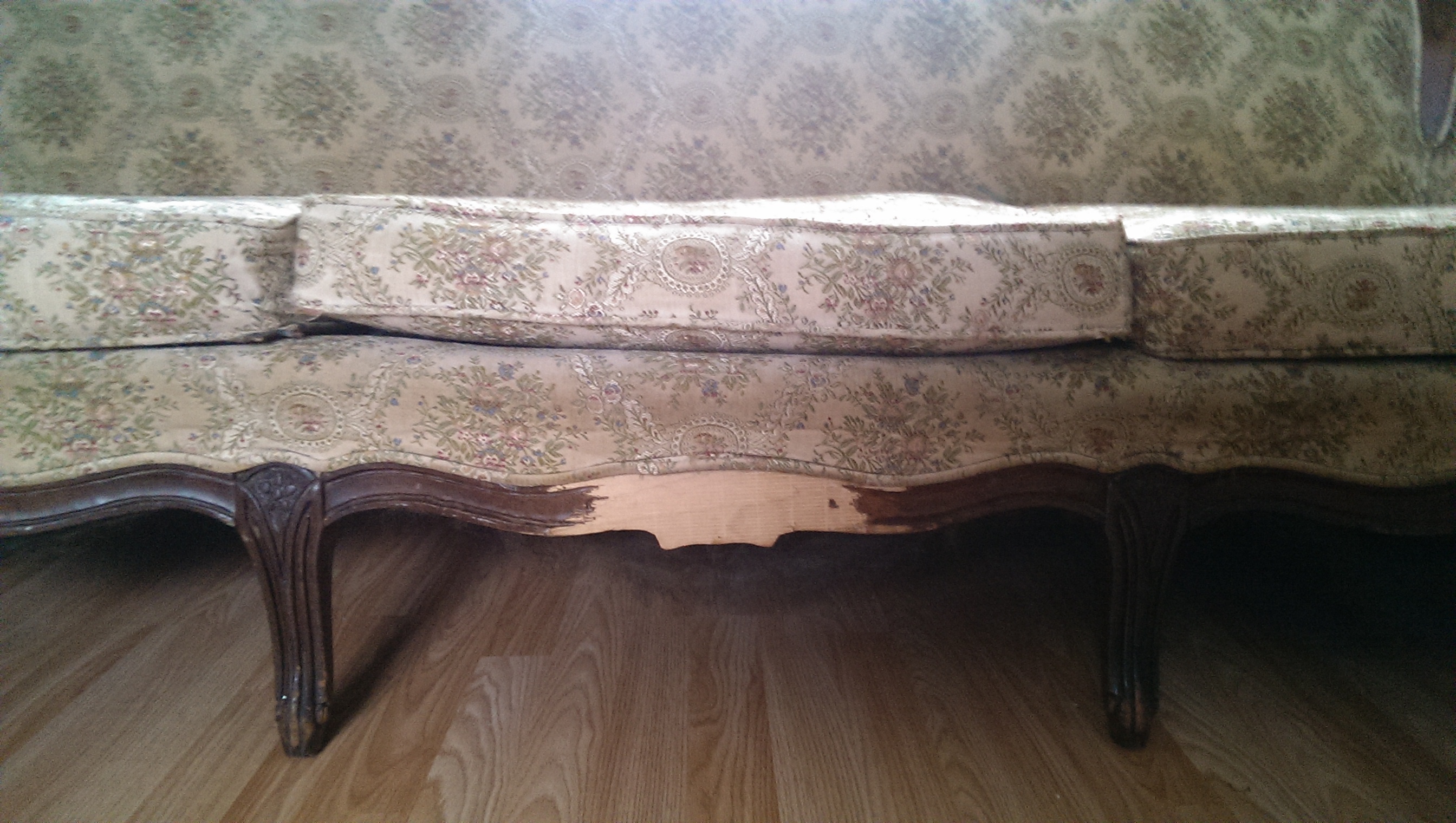 This couch is about 5-6'long. It has a cream floral print. There is a rip in one of the cushions. There is a section about 4-5",of the wood carving that is bare. (front, center). There is also a spring trying to push through the center of the back. Otherwise the couch is quite beautiful.