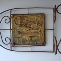 Old clay tile with a carved scene on it of a man feeding a child.... Possibly Mexican? Catholic?