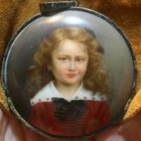 European Finely Detailed Miniature Pendant of Little Girl in Red Dress, Purchased in Bavaria Germany