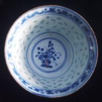 Possibly Ming Dynasty, blue and white porcelain bowl and spoon with gilt and translucent rice grain