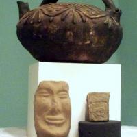 Mayan Artifacts;Pouring vessel.two pottery fragments.Small jade male head.Stone carving axe god.