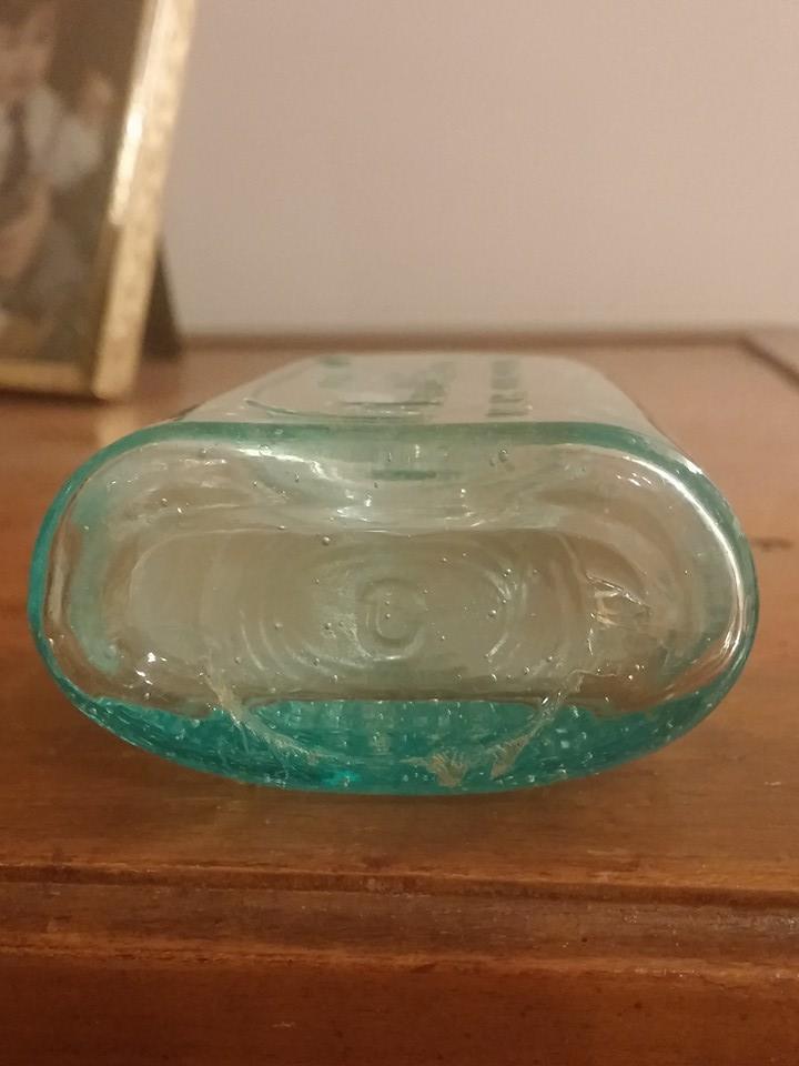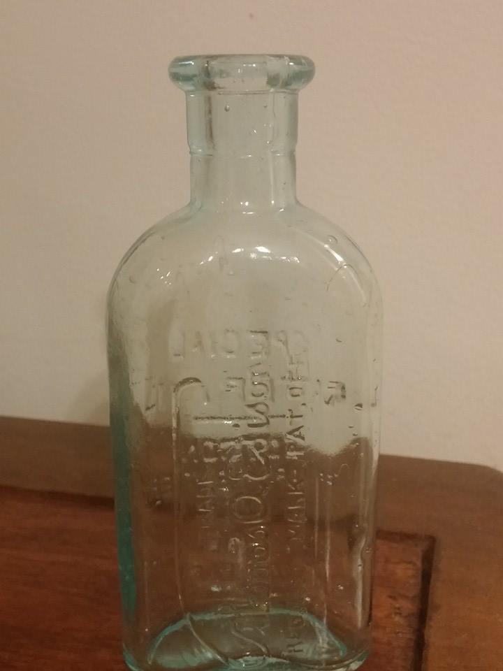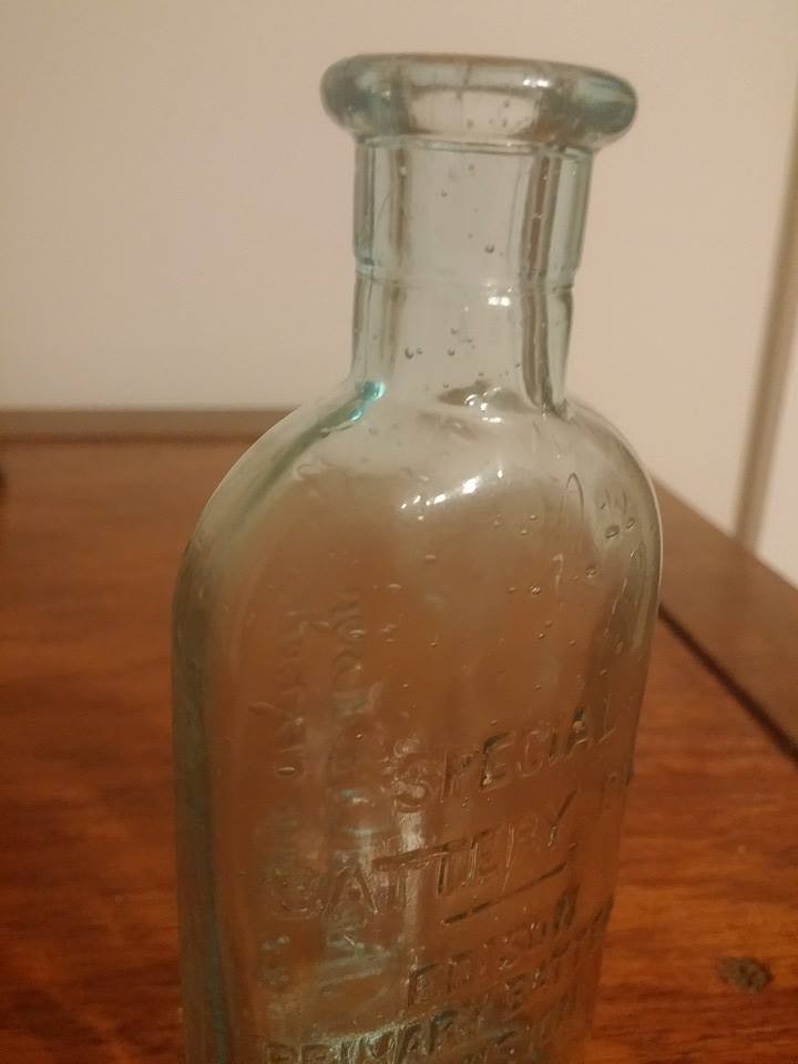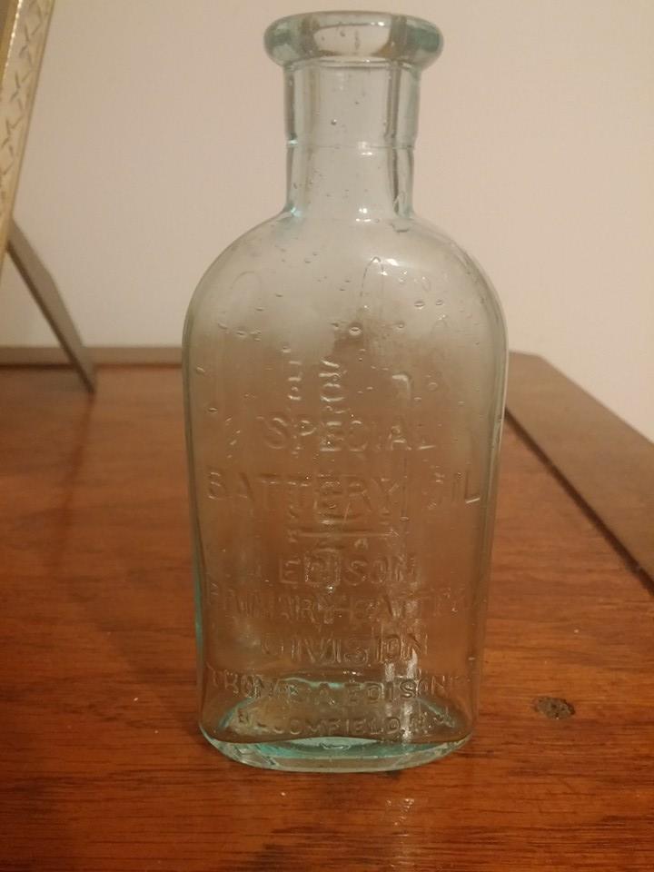 Hi,I am hoping that someone can give me ANY kind of information- age,type of glass,company information,value,(if any) etc, about this bottle. My husband found this bottle in the sand at a beach in Ketchikan,Alaska almost 40 years ago. It is about 5 or 6 inches tall, had a cork stopper, the writing is etched onto the glass with no labels,and the glass is clear and transparant. The front of the bottle says SPECIAL BATTERY OIL EDISON PRIMARY BATTERY DIVISION THOMAS A. EDISONlnc. BLOOMFIELD,N.J.It is written in capitals and I wrote it exactly as it is on the bottle.The back of the bottle is written lengthwise and says TRADE Thomas A Edison REG.U.S. MARK PAT.OFF. The name is in cursive with the T swooping beside and over the signature-almost looking like a fishing hook and line! On the bottom of the bottle is the letter C inside of a circle with progressively smaller circles around the C. There are a bunch of air bubbles trapped inside the glass,and when looking at the bottle from an angle or laying it on it's side- the glass has a green cast to it, although it is clear and transparant. I have uploaded pictures to show( hopefully) the air bubbles, green cast,and sketching of the bottle. If anyone can give me ANY information whatsoever about this bottle- I, as well as my husband would greatly appreciate it! Thanks- Kim