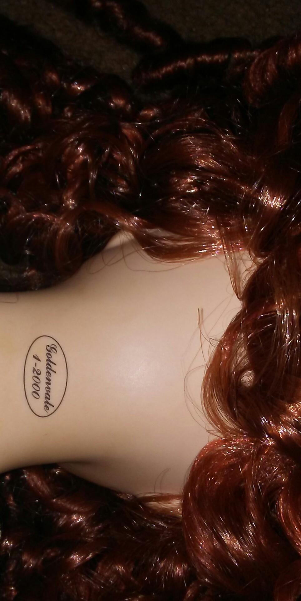 She is a Goldenvale 1-2000. She has a porcelain head, soft body and porcelain feet. She has long red curly hair and is wearing a green and gray lined with lace Victorian dress and is 3ft tall.