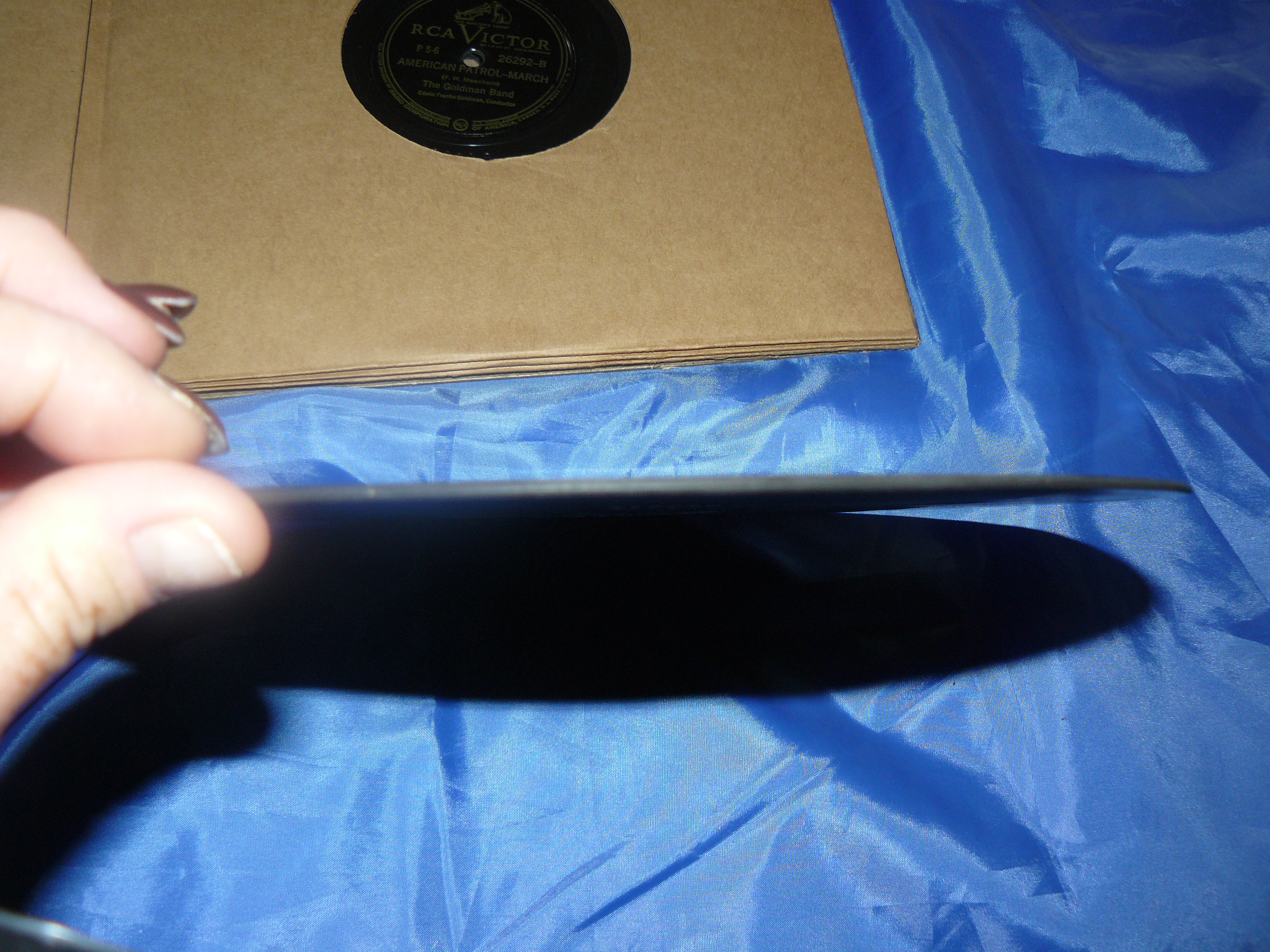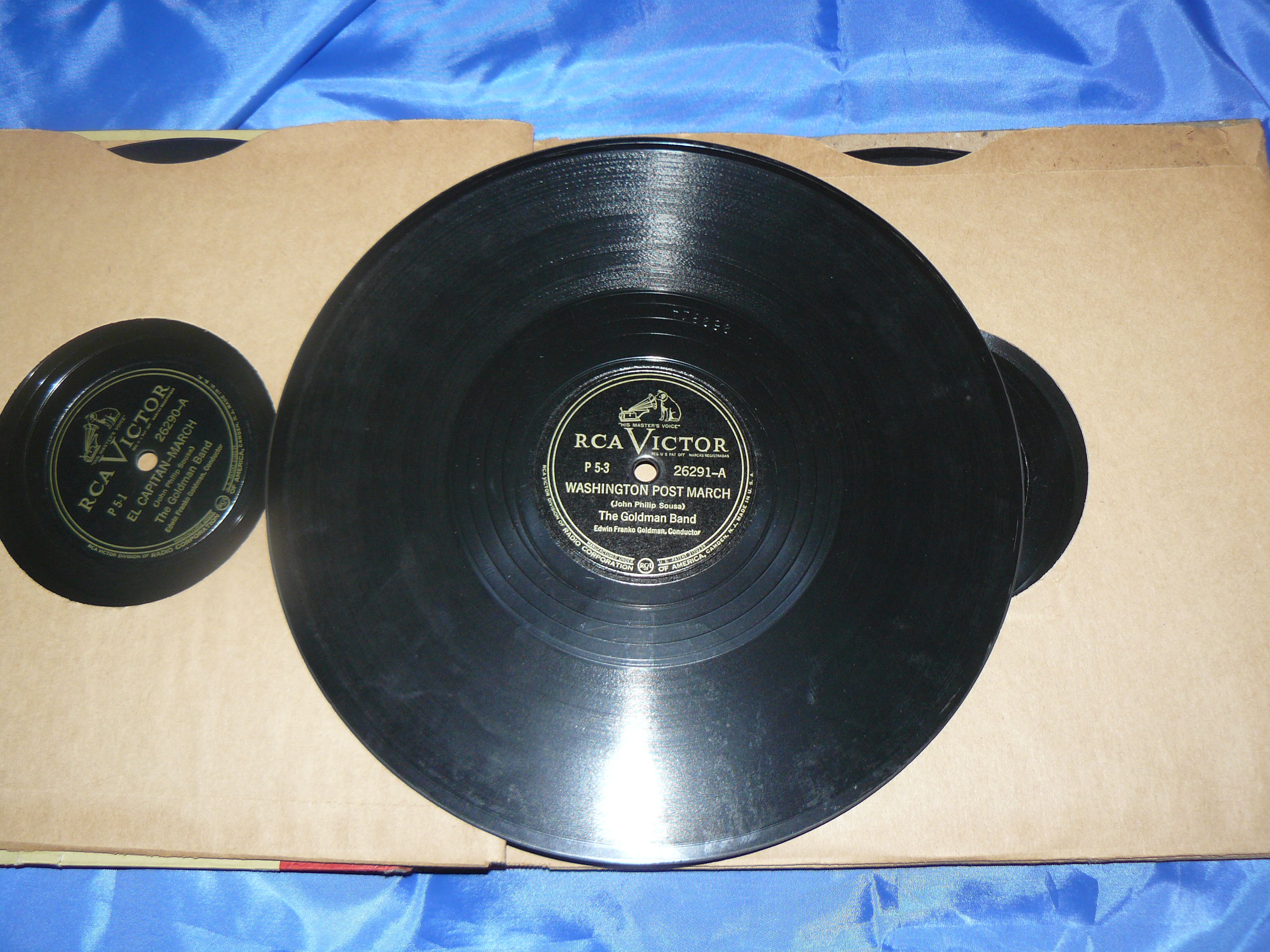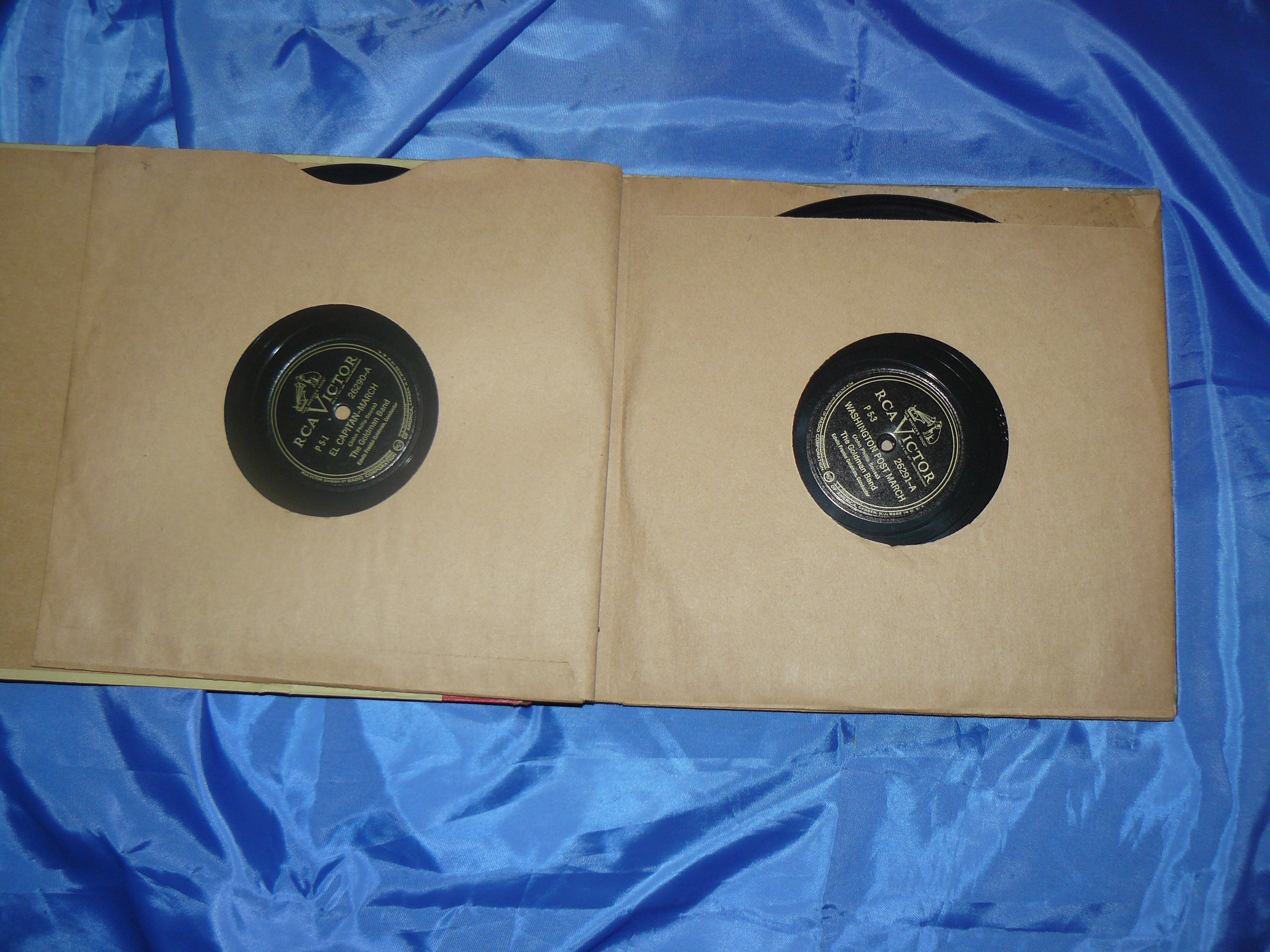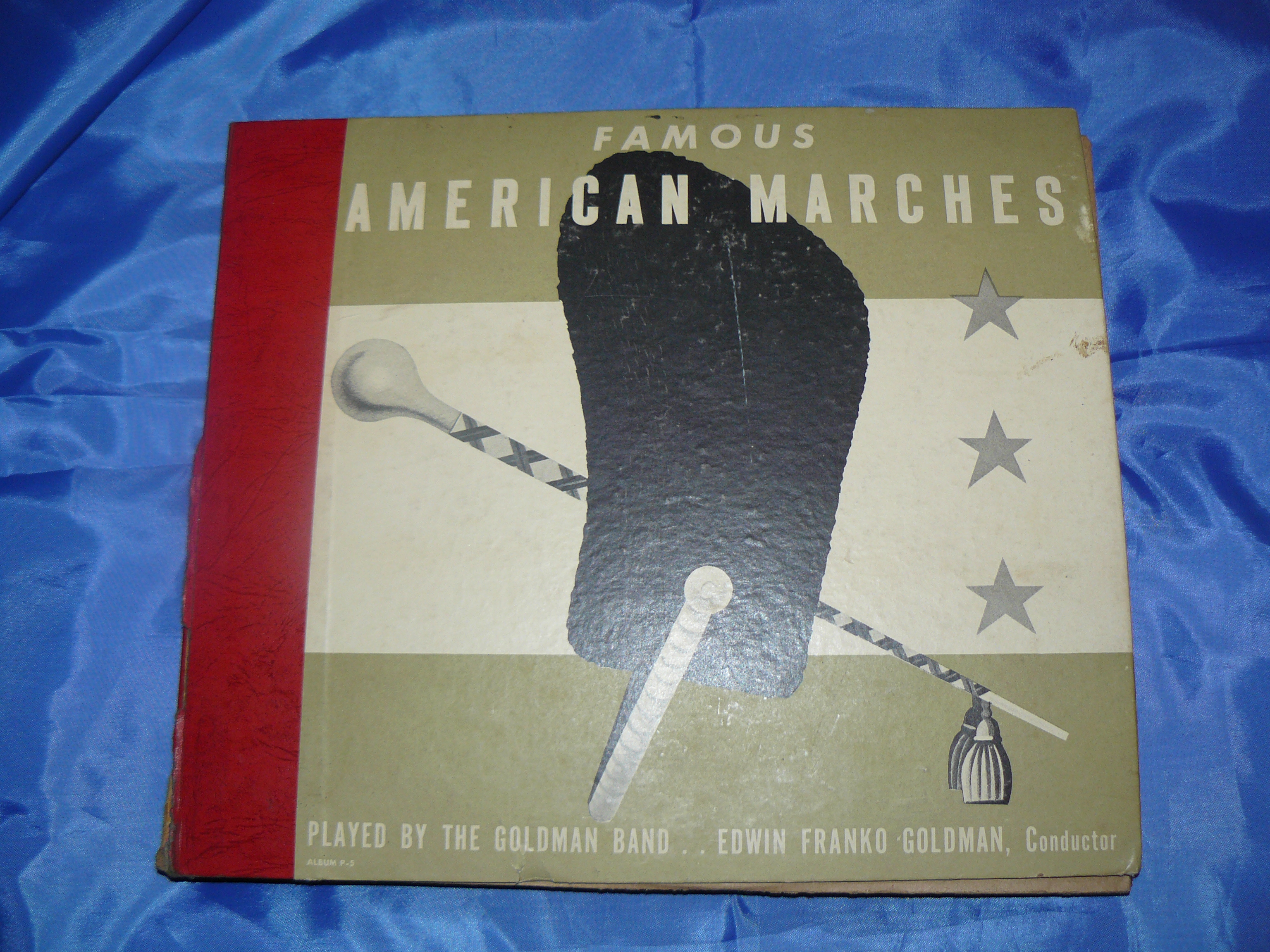 I acquired this item at an estate sale.  It's a four vinyl album set of 10" records. Title is "Famous American Marches". Played by The Goldman Band.  Conductor was Edwin Franko Goldman.  The albums are RCA Victor "The Master's Voice". The songs included are "Lights Out March", "El Captain-March", "Washington Post March", "Semper Fidelis-March", "American Patrol-March", "On The Mall-March","Our Director-March", and "Anchors Aweigh-March".  Albums are contained in a very heavy cardboard folder type container.Album label refers to Radio Corporation of America, Camden, NJ.  I'm not even sure of the speed for these albums.  Vinyl is thicker than a tradional LP and heavier.