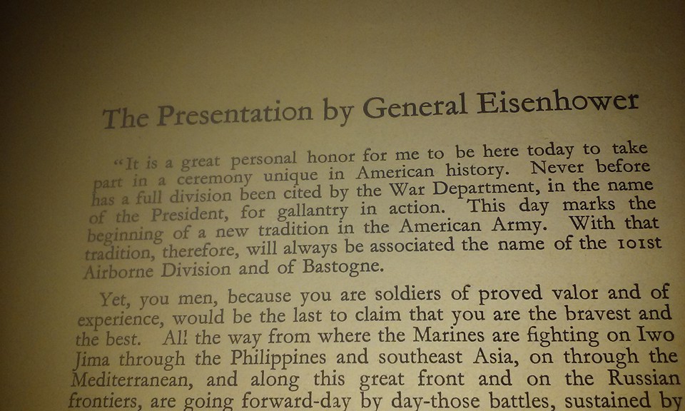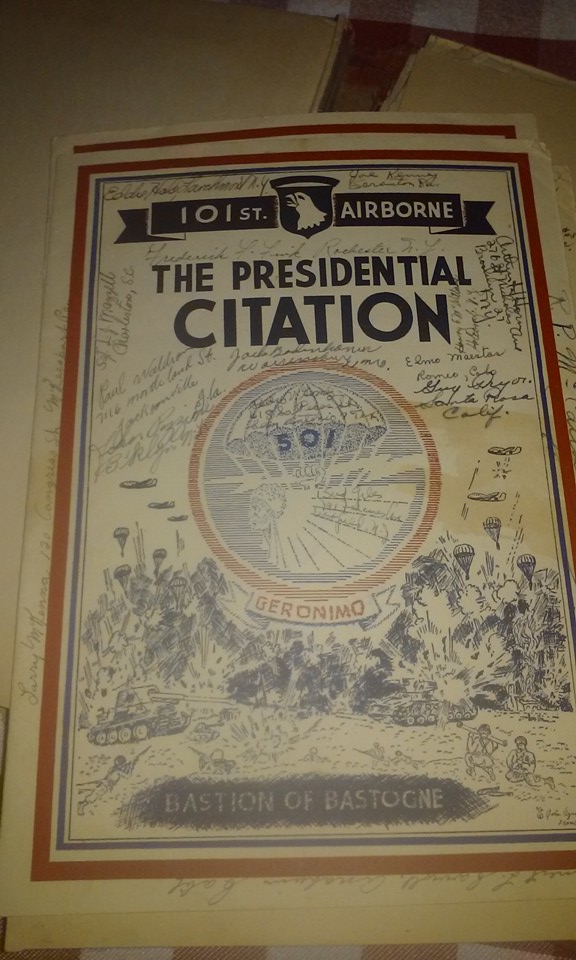 Program is signed by 75 soldiers.Commendation for Bastogne, Battle of the Bulge. Also have this soldiers  certificates from basic,parachute school, and demolitions training, and a reunion letter from the Screaming Eagles.