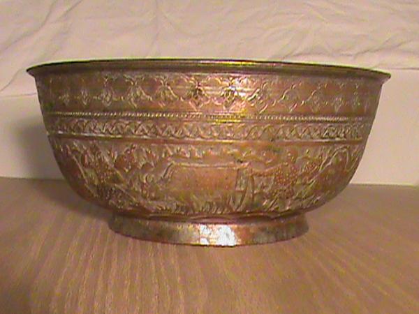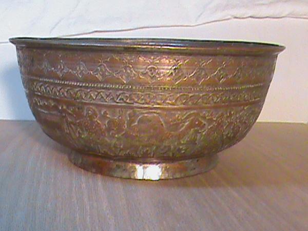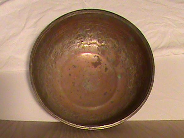 The metal bowl has patina but appears someone has tried to clean it and revealed both silver and brass colored metals. It has some mild mold in internal and external surfaces. No pitting.