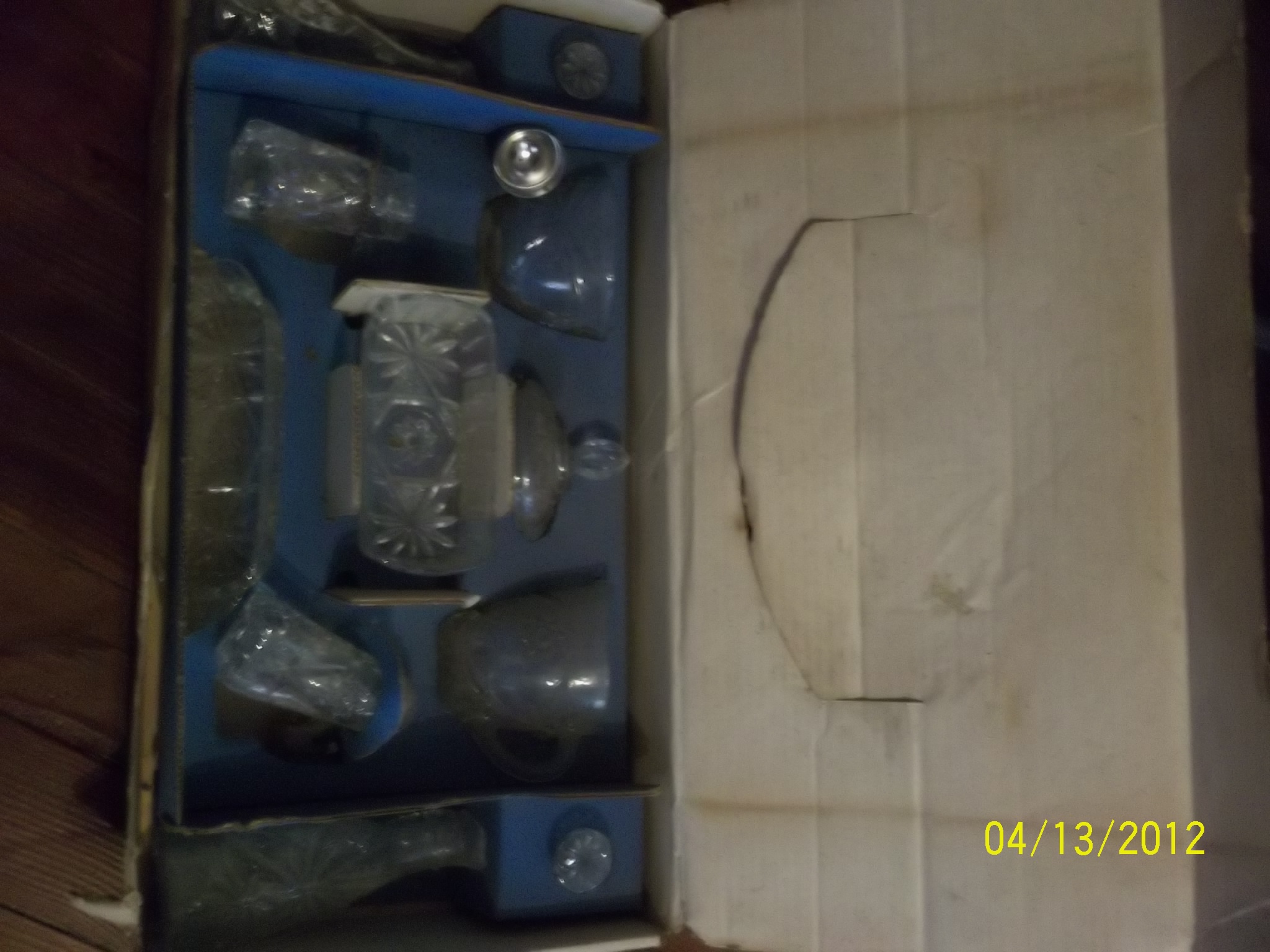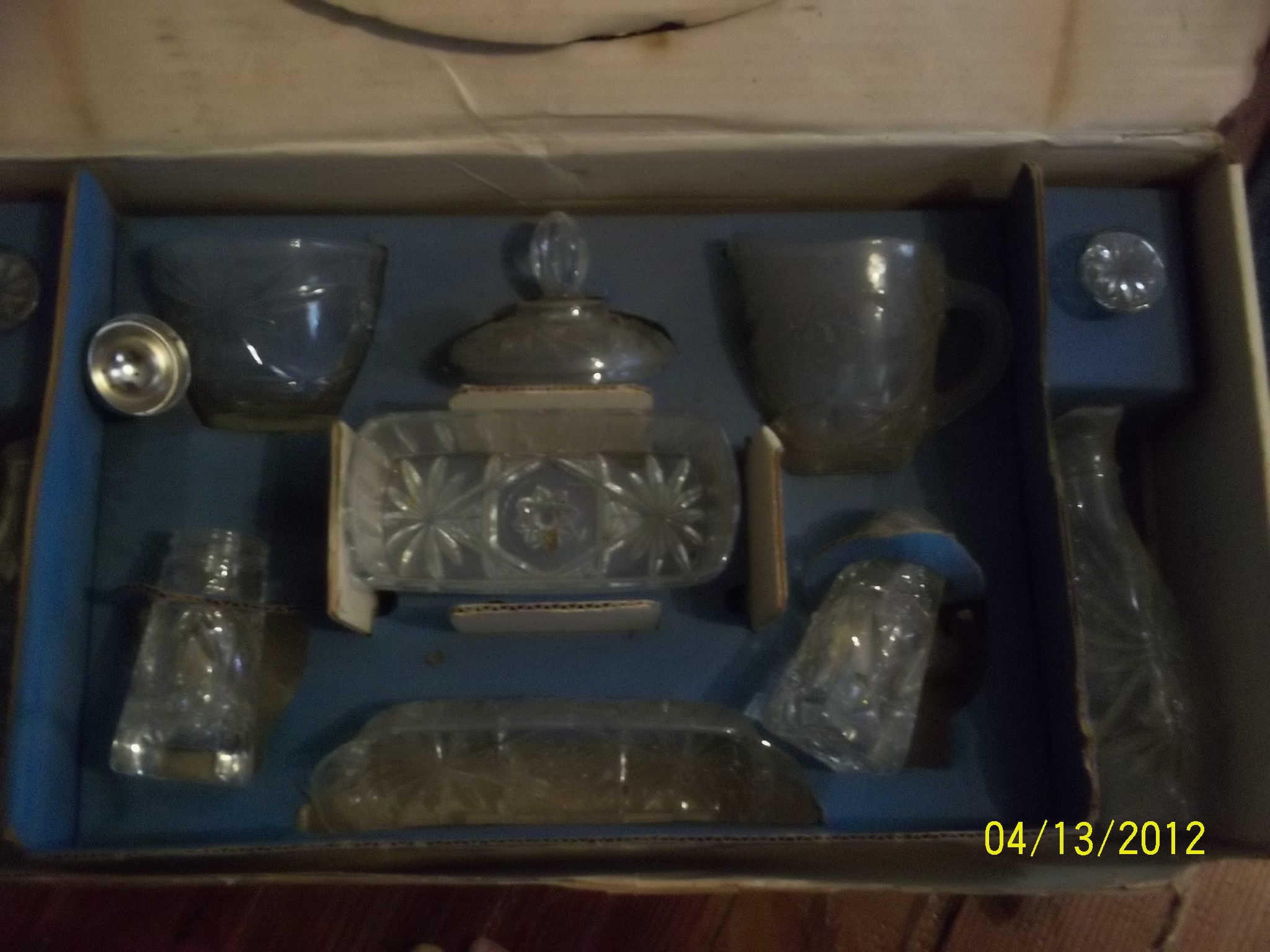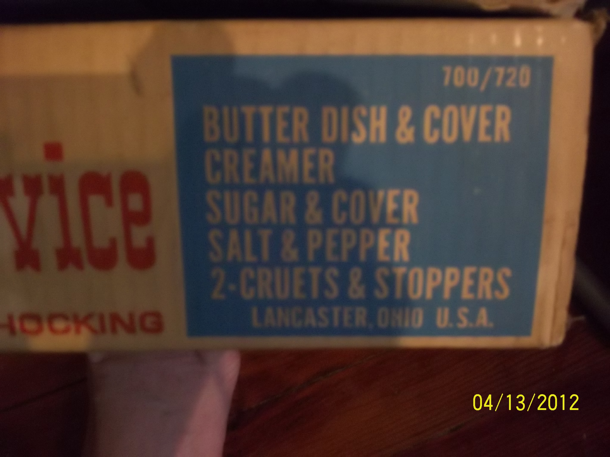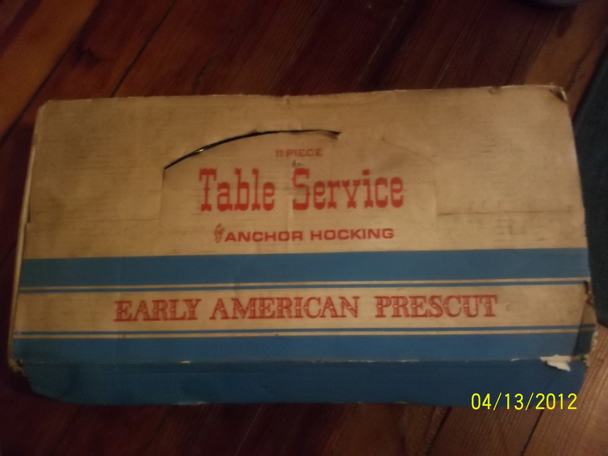 11 Piece Table Service By Anchor Hocking In original box which is in good shape(front right corner is tore a little, NEVER USED