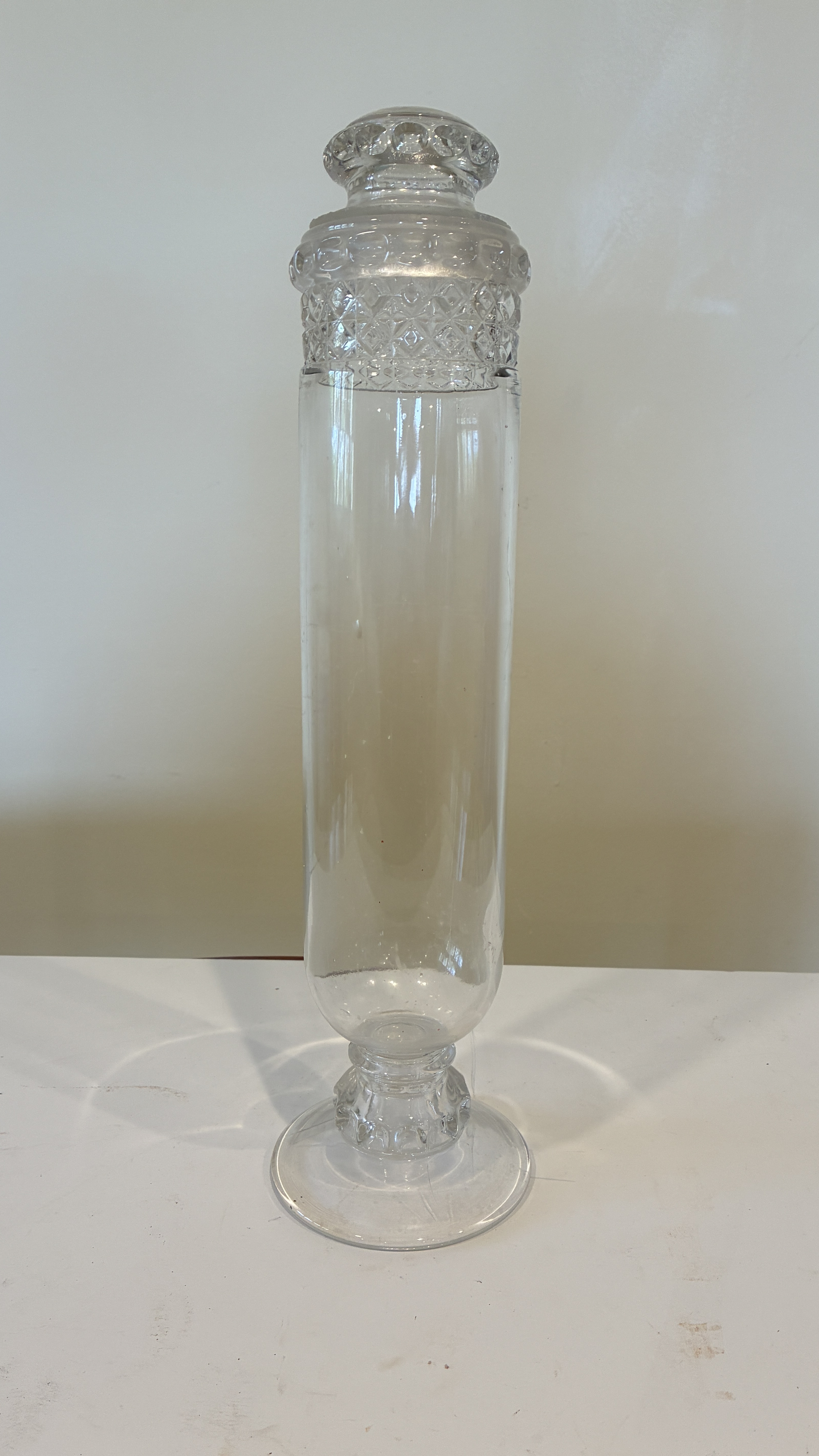 Wine Glass and Ground Glass Top. Dating to Late 1800s for the ground glass top; 1969 for the wine glass.. Materials: Clear glass. Estimated value: $100 – $200. Condition: Excellent. The market for vintage glassware is currently stable, with moderate demand for decorative pieces from the late 19th and mid-20th centuries.