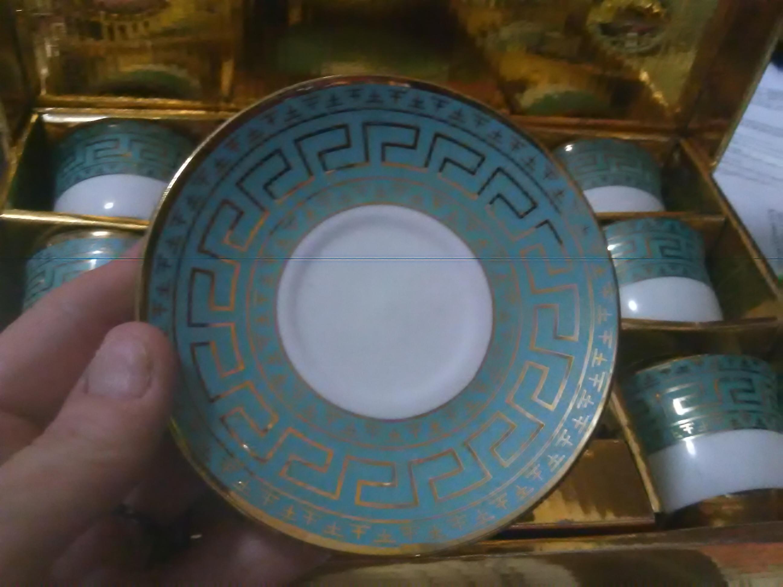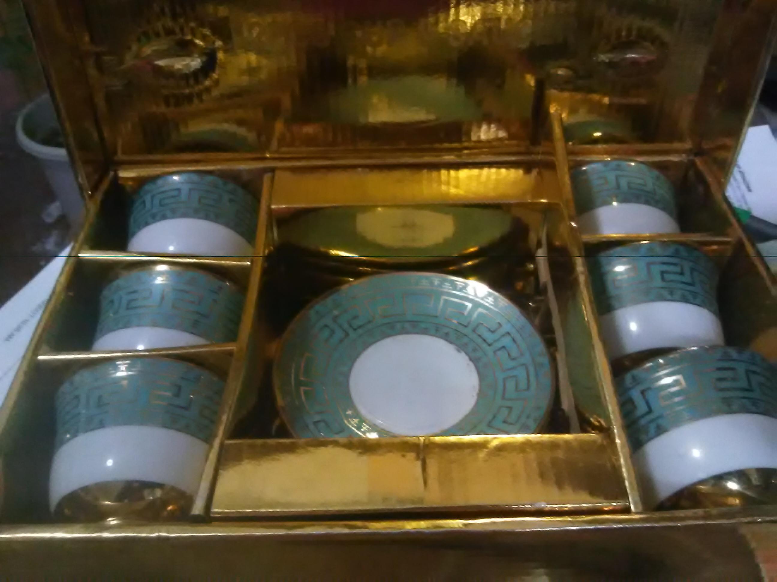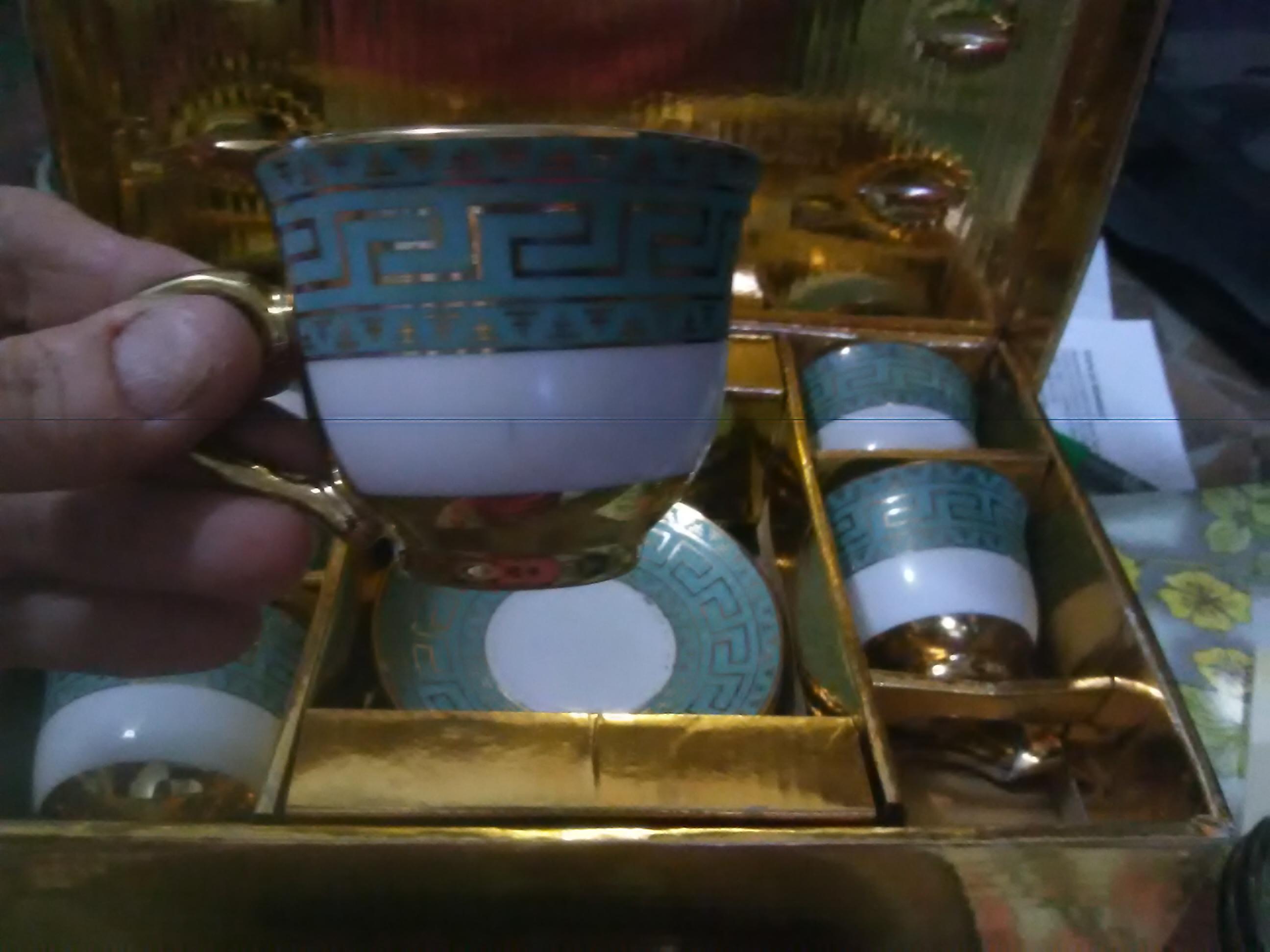 Mini teacup set, white with gold key design and trim on turquoise blue