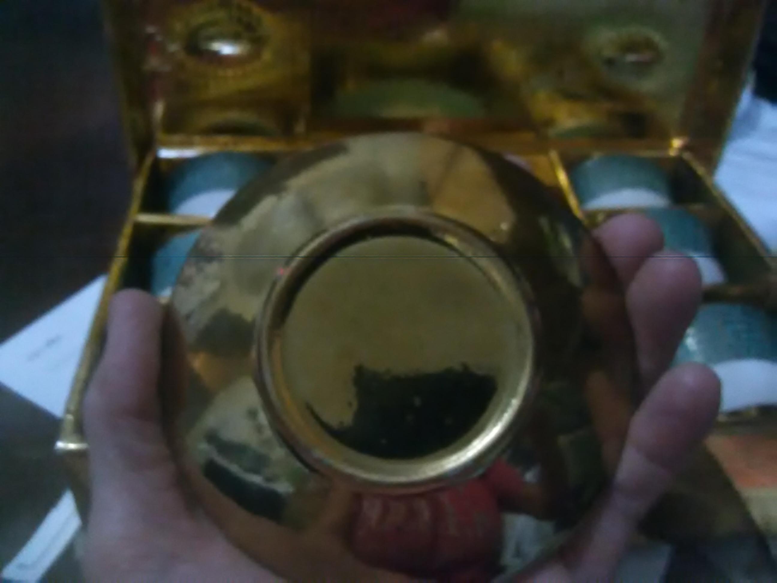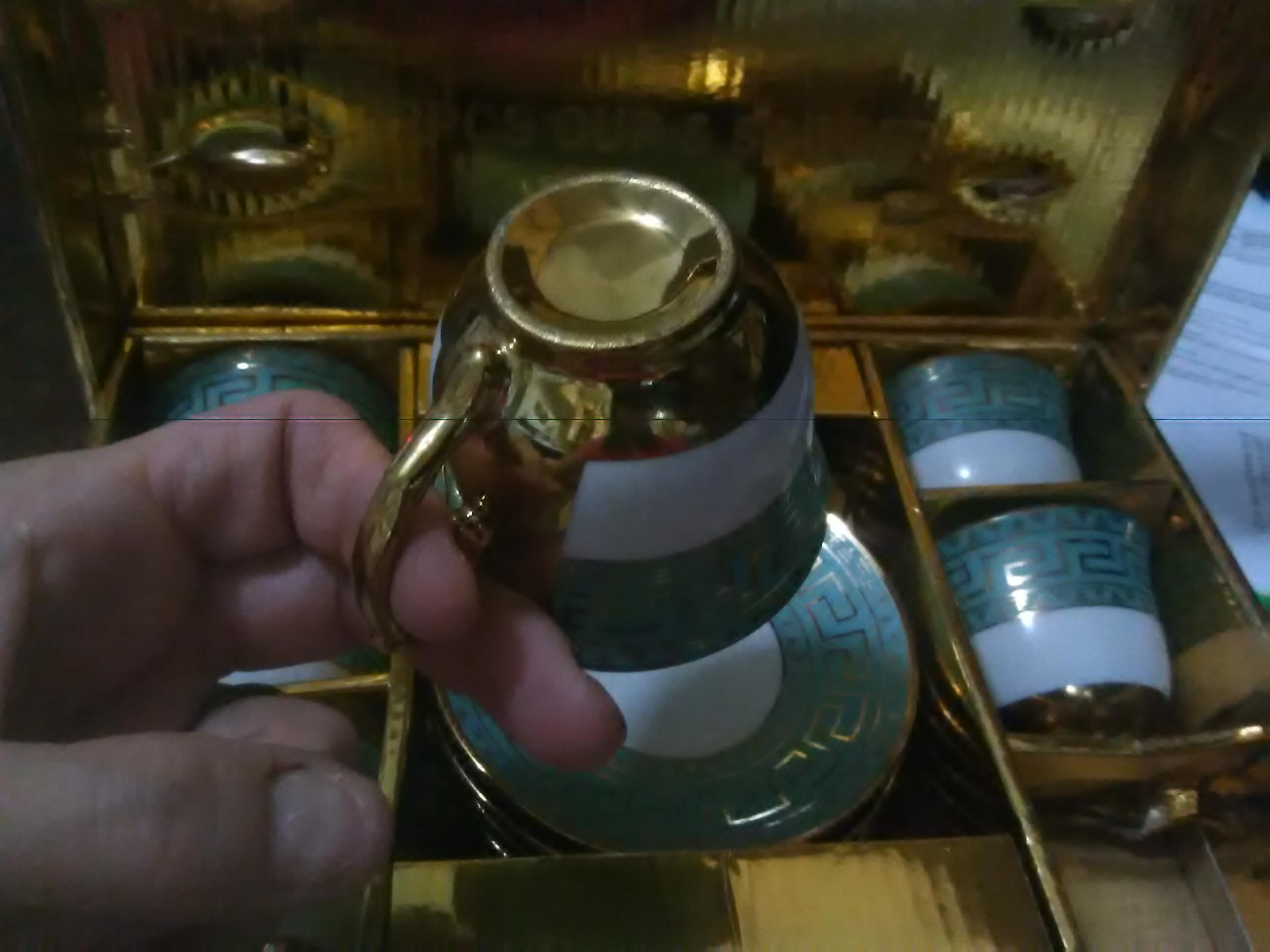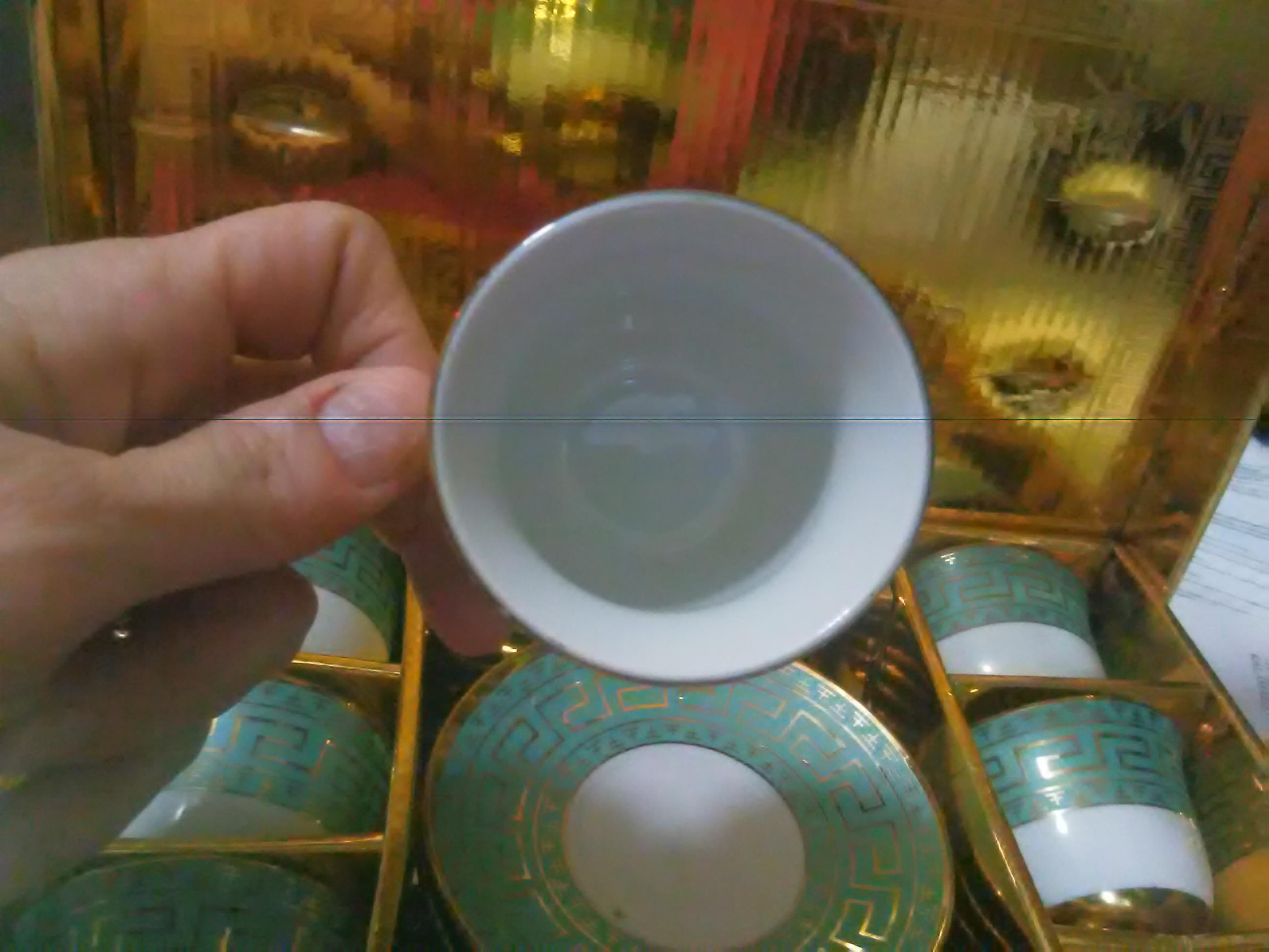 Mini teacup set, white with gold key design and trim on turquoise blue