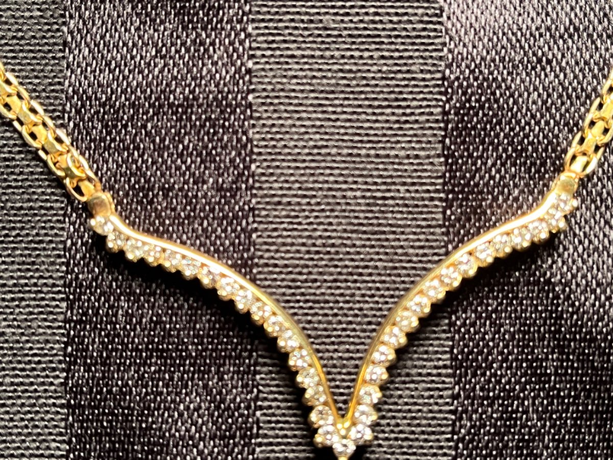 14 karat gold, natural diamonds. Jane length 18 inches not including the V cut diamond area.