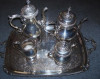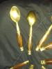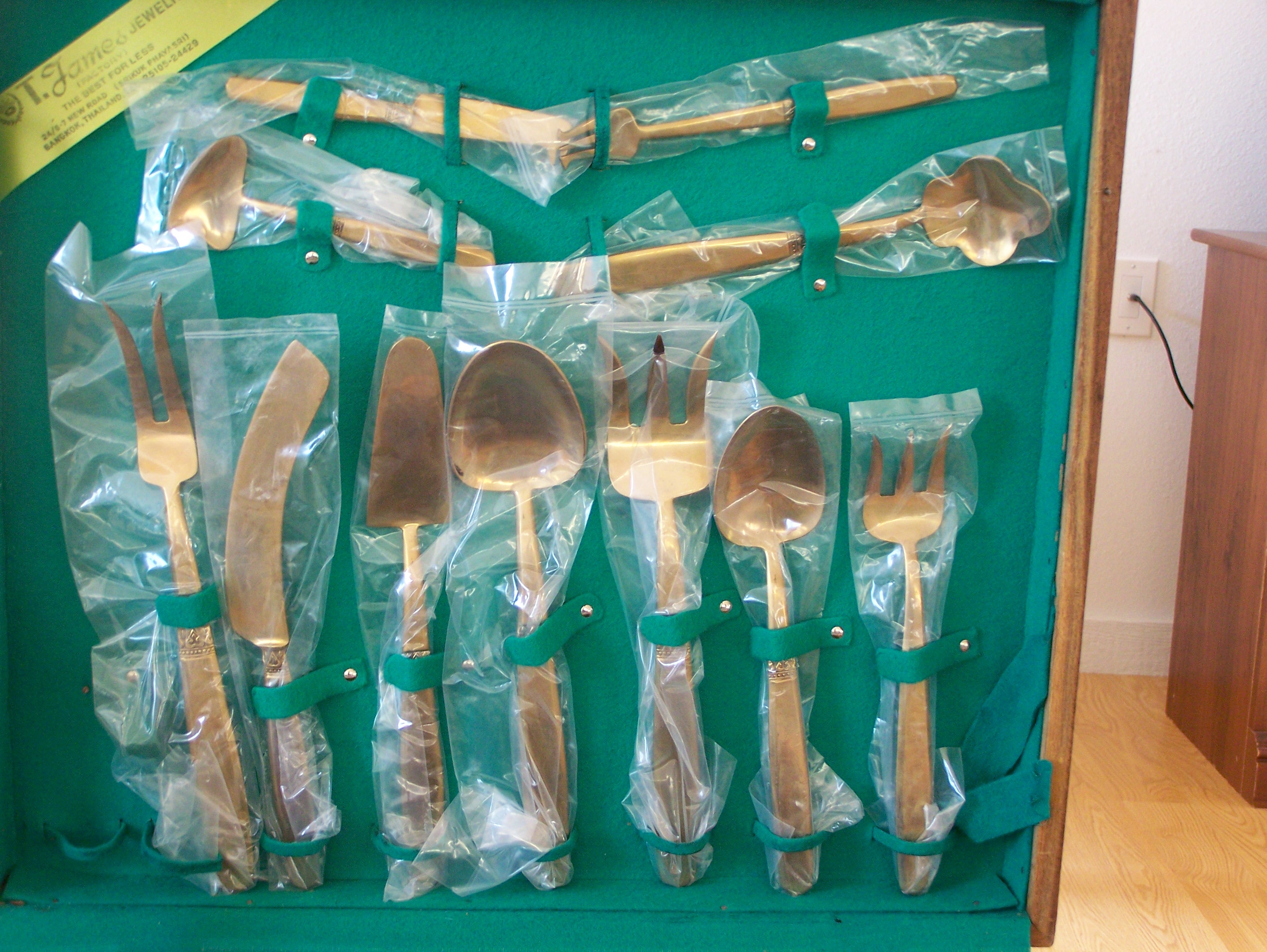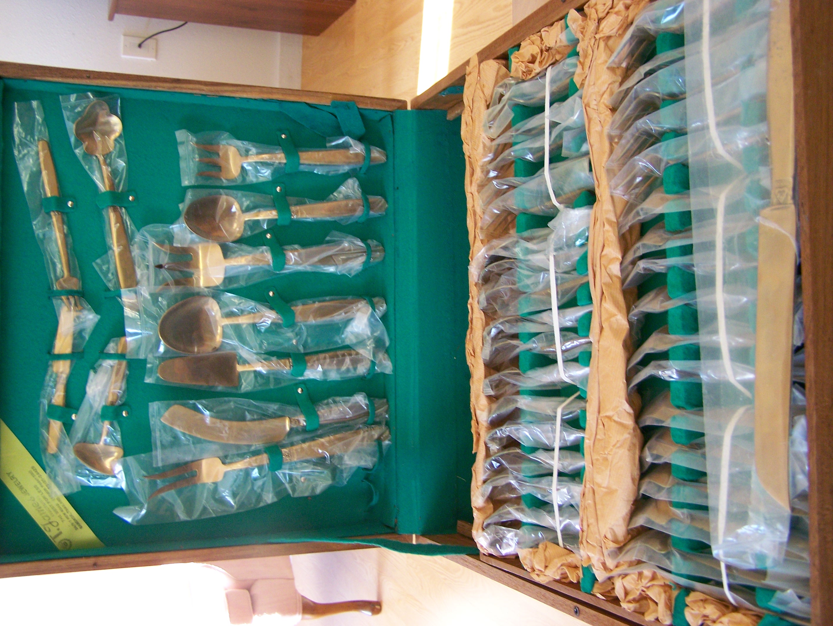 excellent condition 144 piece set of flatware...all pieces sill in original packaging and has brown paper seperating the differt pieces... it looks to be green velvet inside the case; there is two wooden shelves that lift out of the case with another layer in the bottom of the csre ...it all folds up into a suitcase looking wooden box with 2 latches on top near the handle