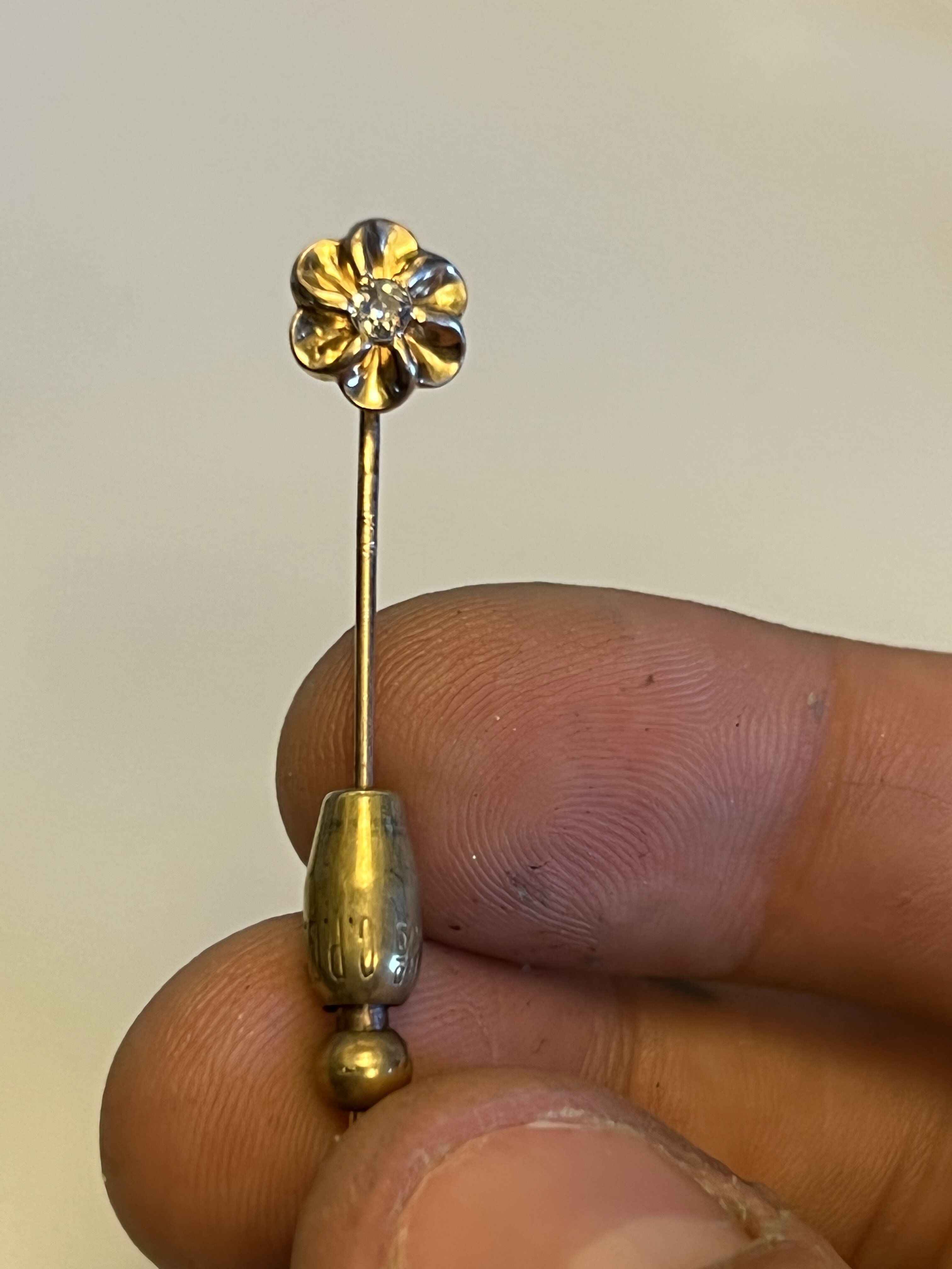 Item is a flower stick pin with a gemstone set in the middle of the flower. Label on "clasp" reads "C.P.G."HOLD-ON" and the patent number is 13009. Thats all i was able to find. Im pretty sure the pin is 14k gold. I can just barely make out, what im pretty sure, is the "14k" symbol on the actual needle piece itself. Its very small and the "k" is kinda faint and worn down so im not totally sure. Any info, such as what the gemstone is, manufacture date and the estimated price would be much appreciated