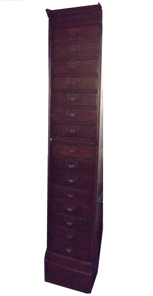 Cameron Amberg & Co. was established in 1868 and made its first Cabinet Letter Files in 1875, when they won an award from the American Institute, New York, NY. (Asher & Adams' Pictorial Album of American Industry 1876). In 1876, its Cabinet Letter Files were awarded a medal at the Centennial Exposition. The metal devices in some of its drawers bear an 1878 patent date. In 1881, 1,000 firms were using its cabinets. By 1893, the company name changed to Amberg Letter & File Co. (However, the Cameron, Amberg & Co. name appears to have been resurrected later, because the latter company published an office supplies catalog in 1930.) Shortly thereafter, its letter filing cabinets had patent dates from 1878 to 1896.