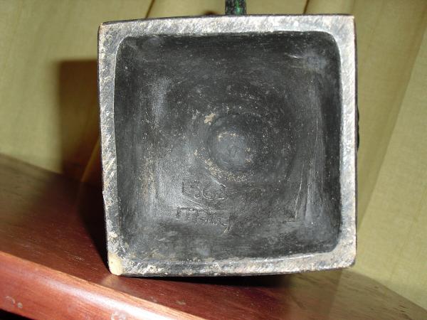 looks to be made of a ceramic/porcelain. has a metallic look and feel to it on the outside with green showing thru in the grooves. the inside looks to be glazed and is greenish-black in color. the bottom has no signiture or name but, 1563 ITALY is carved in the bottom. I have tried to look up pictures of similiar items online. i never did find one that looked like this item however i did find pictures of other items in that era with dates and 'ITALY' written in the same manner on the bottom. That is as far as i could find.