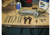 Industrial machine. Still in good working order with additional double large spool holder and oak work table. Foot and knee pedal. Build in utility light.