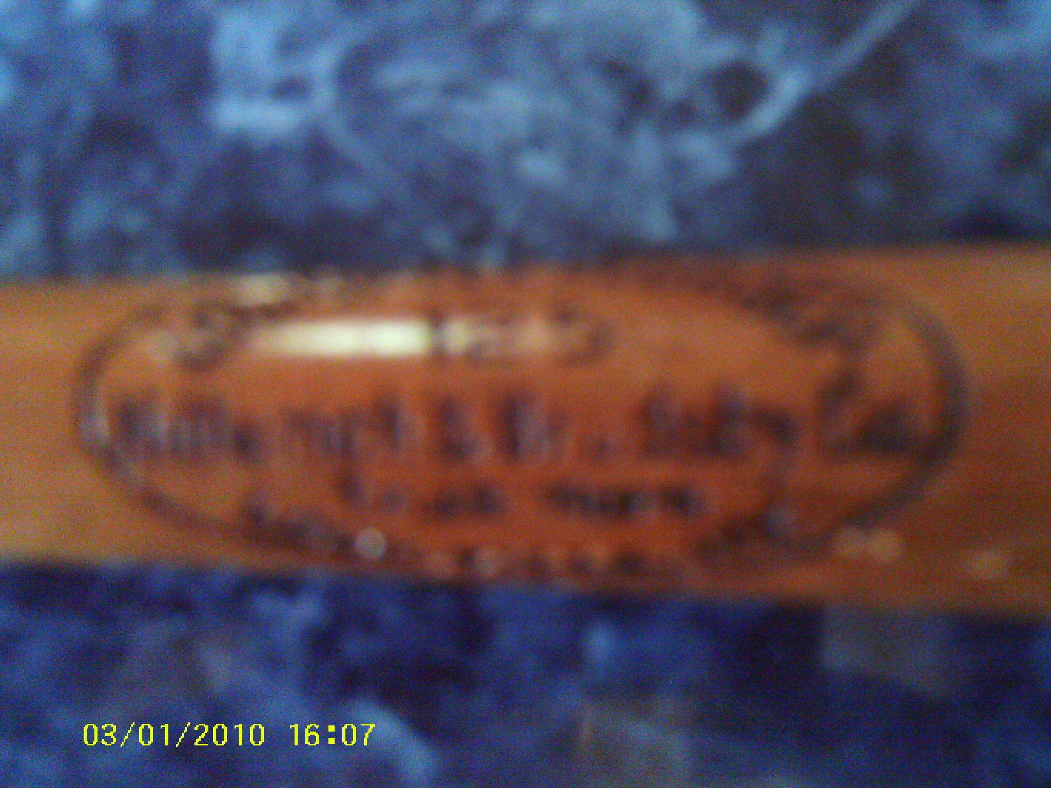 16" wooden Louisville slugger baseball bat with Hillerich & Bradsby trademark and Nick Cullop signature trademark, excellent condition, estimating 1930's era