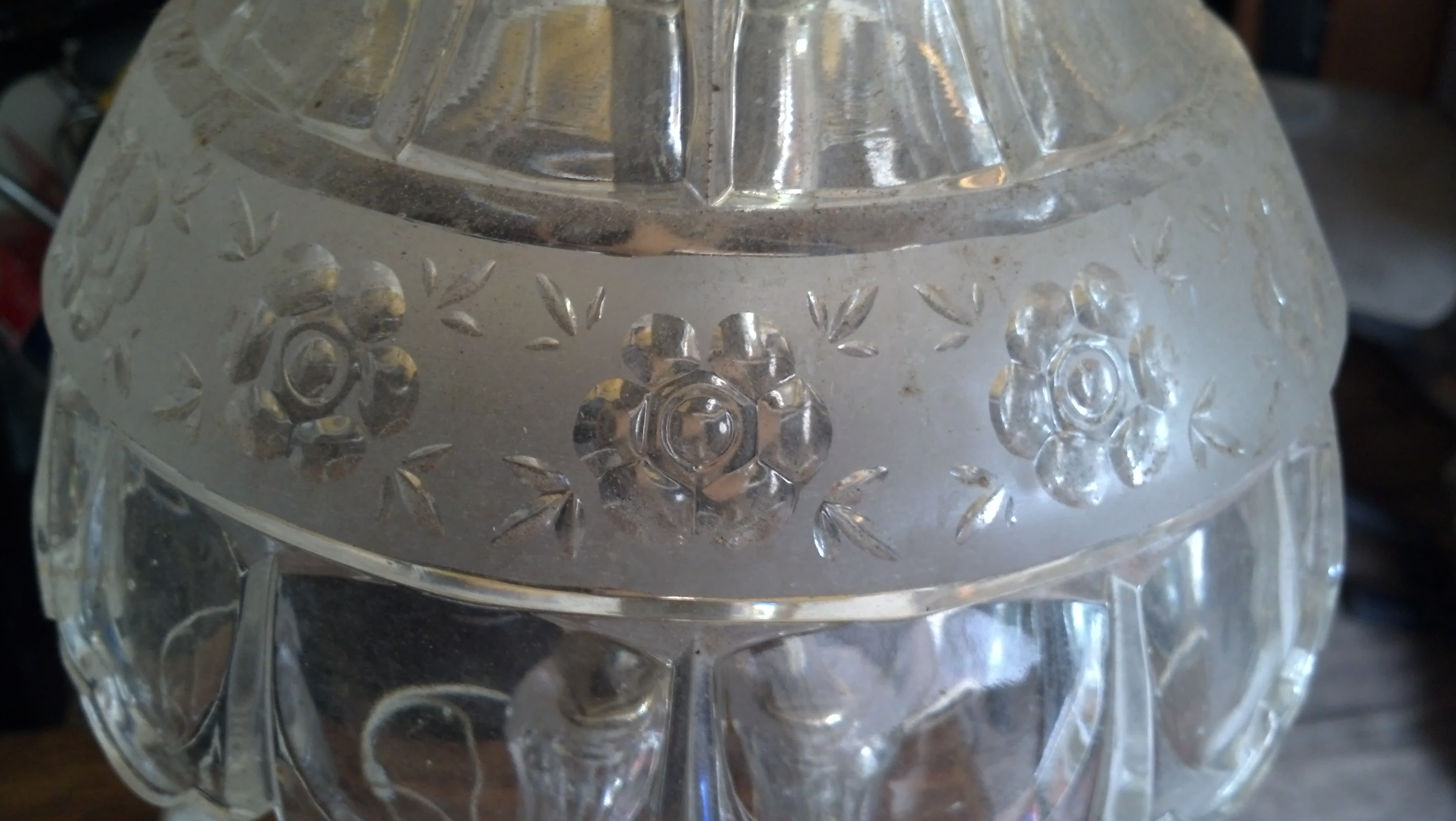 This table lamp is 24% lead crystal and stands approximately 17". It has a rose pattern around the shade and base. It is in excellent condition with no cracks or chips. Wiring is also in good condition and lamp works with a standard nightlight bulb.