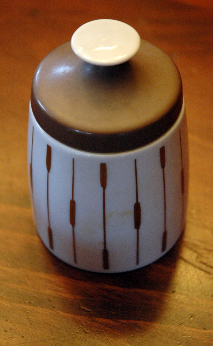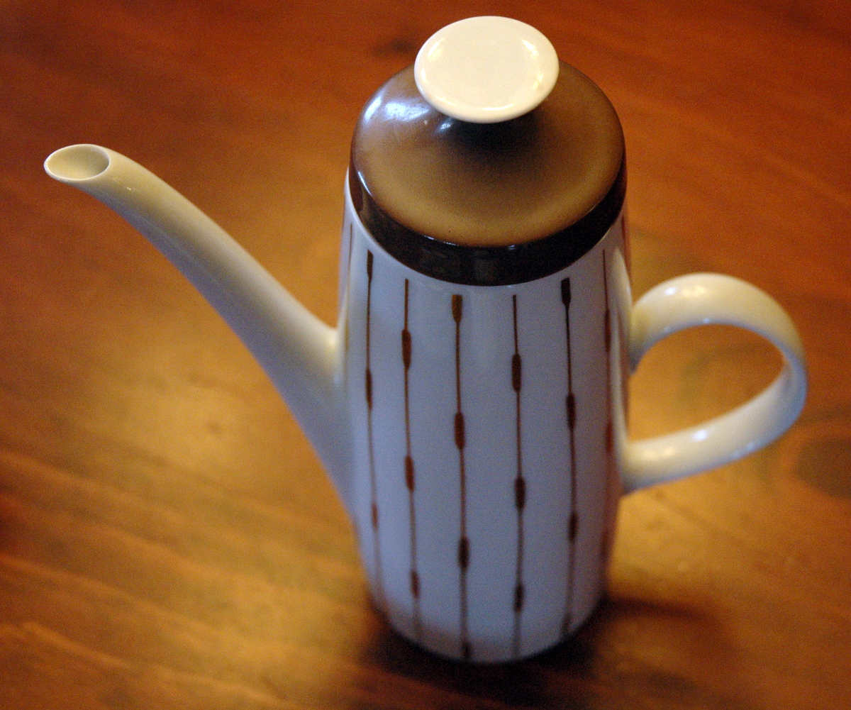 Going through my late grandmothers things, I found this (miniature?) coffee set. Not sure if it a toy set or what. It has a very retro pattern, very 70's looking. The colour is brown and gold. I'm curious if it has any value. I've not been able to find a set like it online anywhere.
