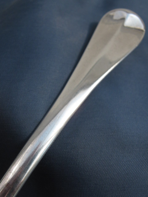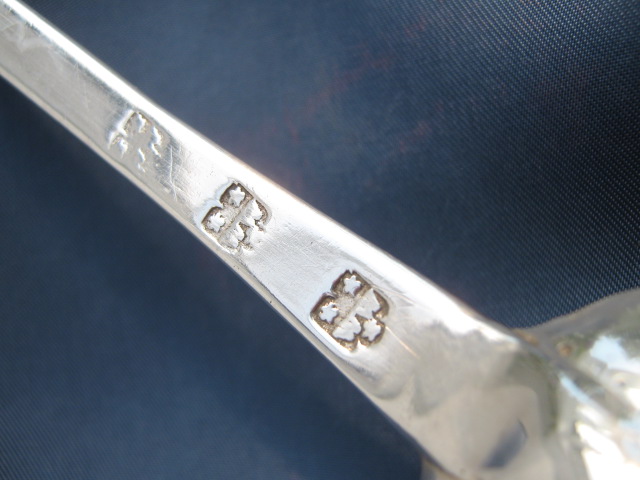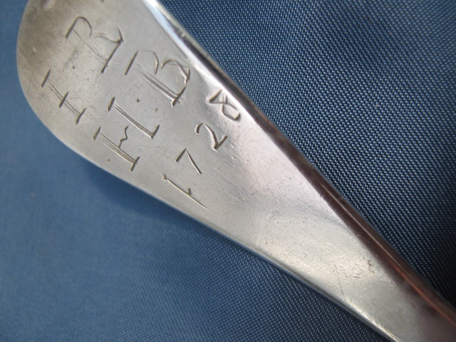 A Georgian 1728 solid silver serving spoon with marks WW and 3 stars and on the handle IR & HB 1728.