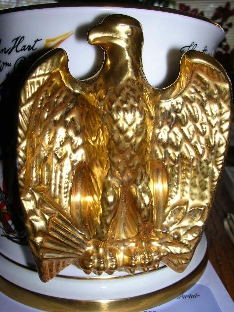 This is a description given in the Dec. 1976 edition of The Rotarian pg. 46. "A 23-carat gold band encircles the top and base of the Salem cup, acting as a frame for the pictorial symbols. Two flags dramatically represent the separation of the original 13 colonies from England" "a careful reproduction of the signatures of the Declaration of Independence.. The US eagle, sculpted in gold, stands protectively on each side of the cup" "Officials at the Smithsonian Institution in Washington, DC, were so impressed by Don's handiwork that the first cup was chosen as one of three items constituting the Smithsonian's permanent bicentennial collection."