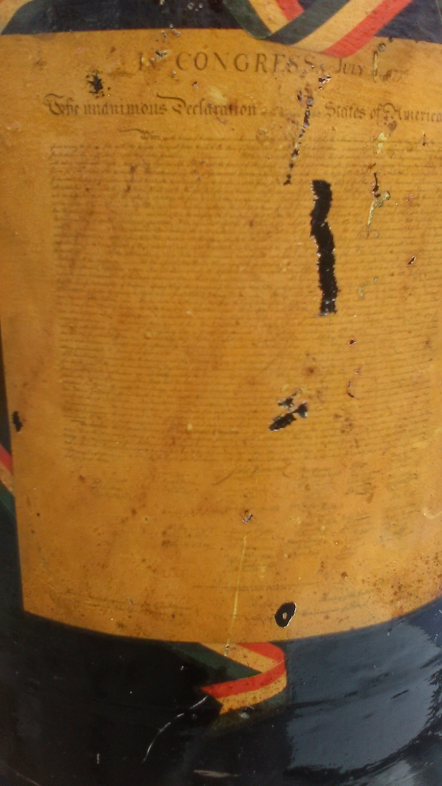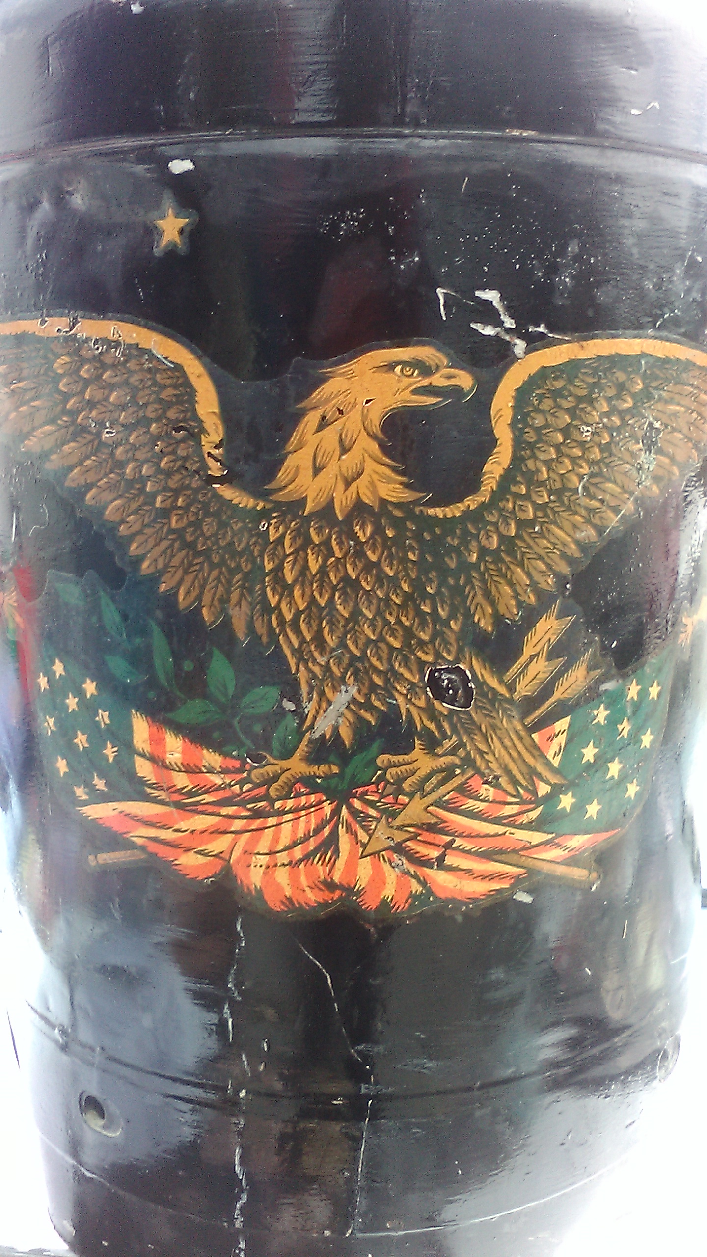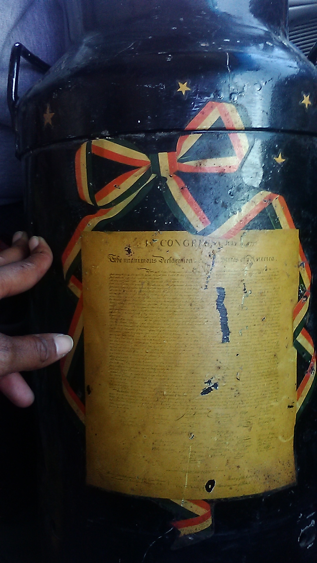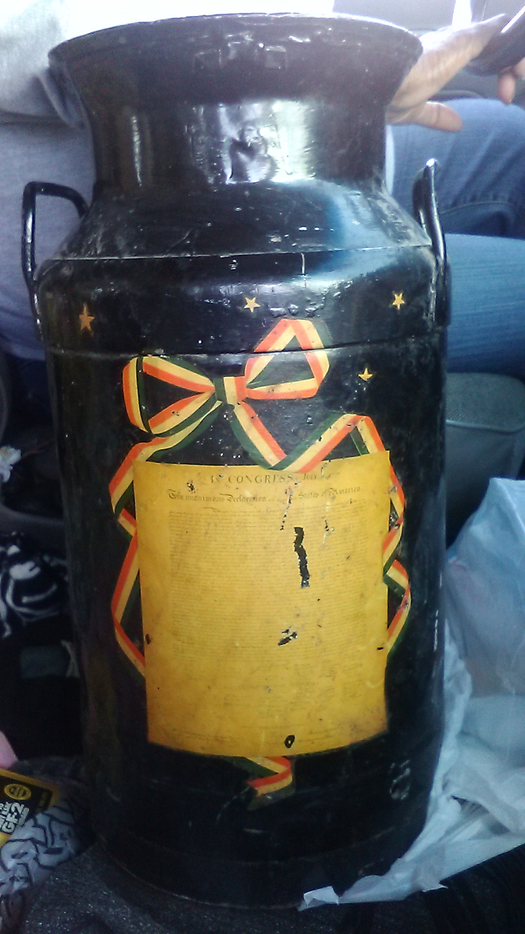 Item was use for milk in n 1776..Its black yellow orange and green paint designs. Of the AMERICAN EAGLE AND A In Congress July 1776 of The Unauimous Declaration with signitures of john Hancock and many others..