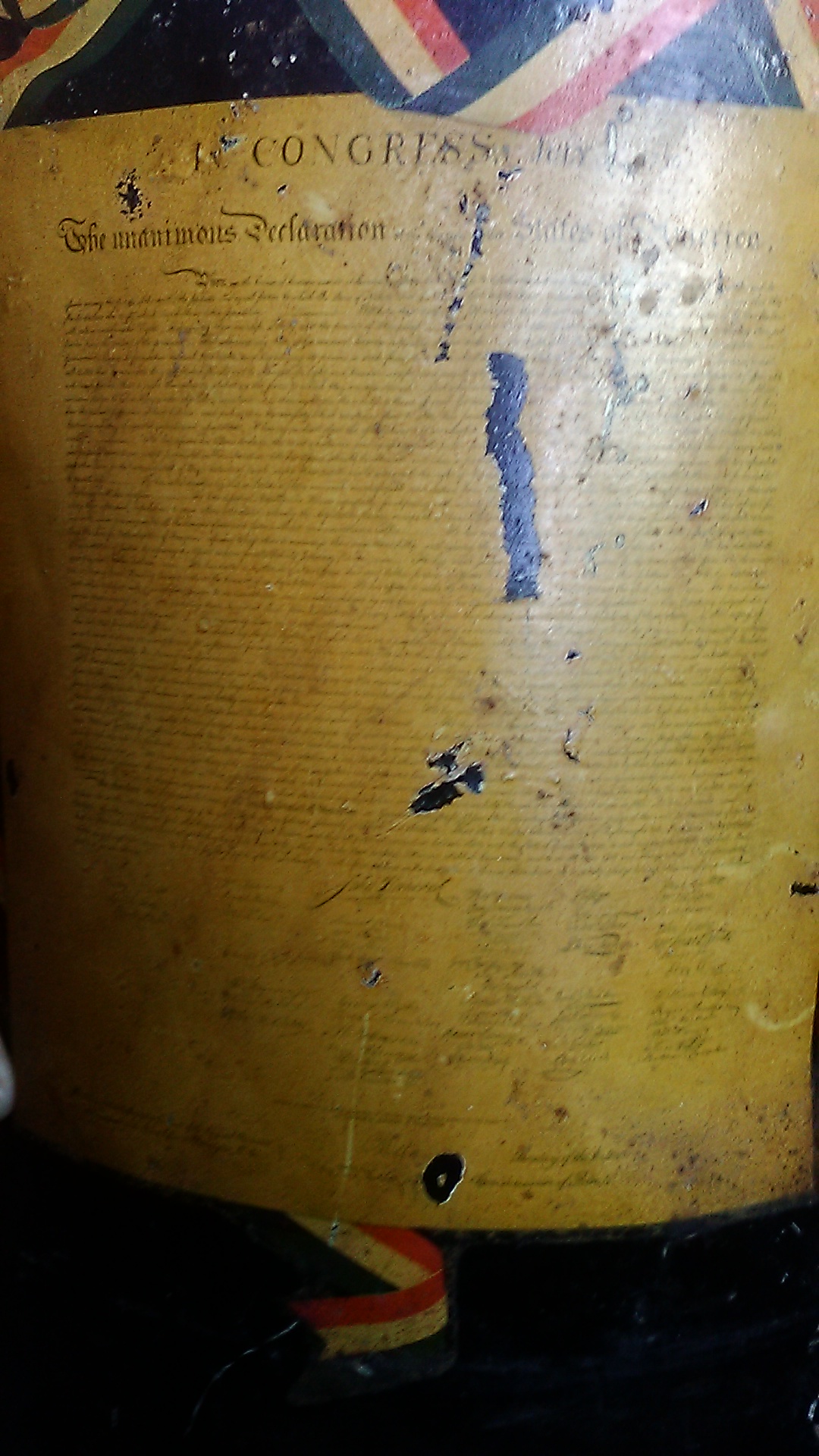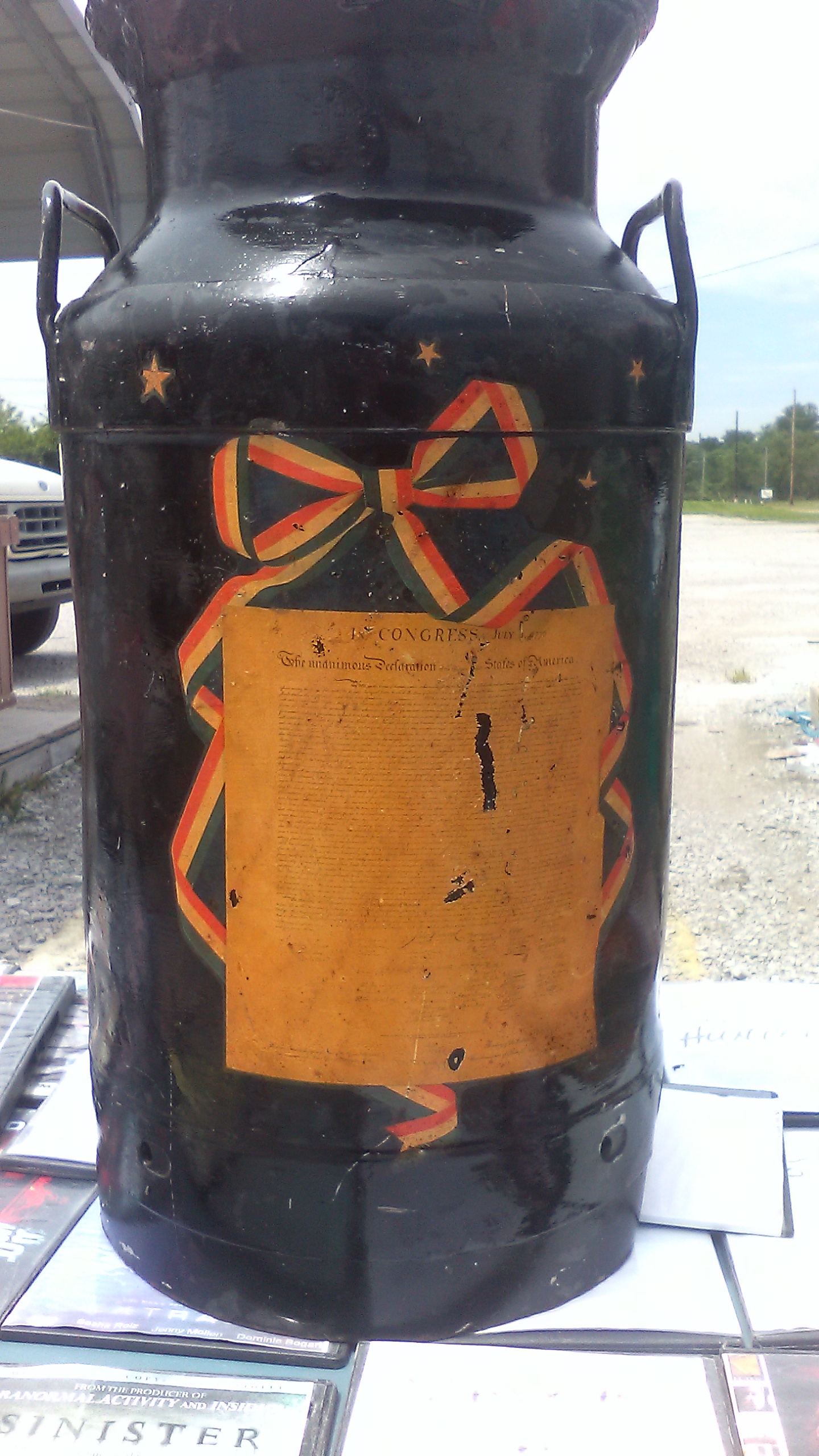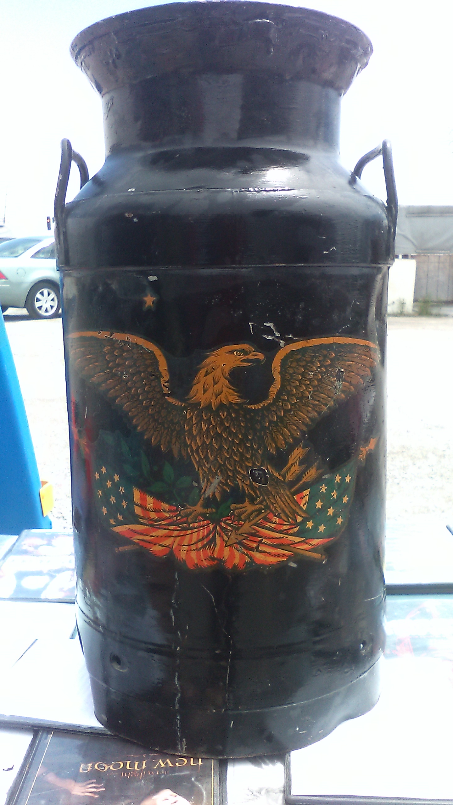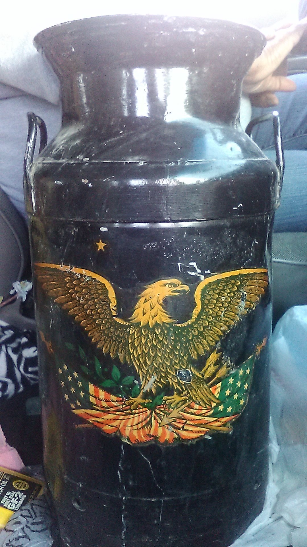 Item was use for milk in n 1776..Its black yellow orange and green paint designs. Of the AMERICAN EAGLE AND A In Congress July 1776 of The Unauimous Declaration with signitures of john Hancock and many others..