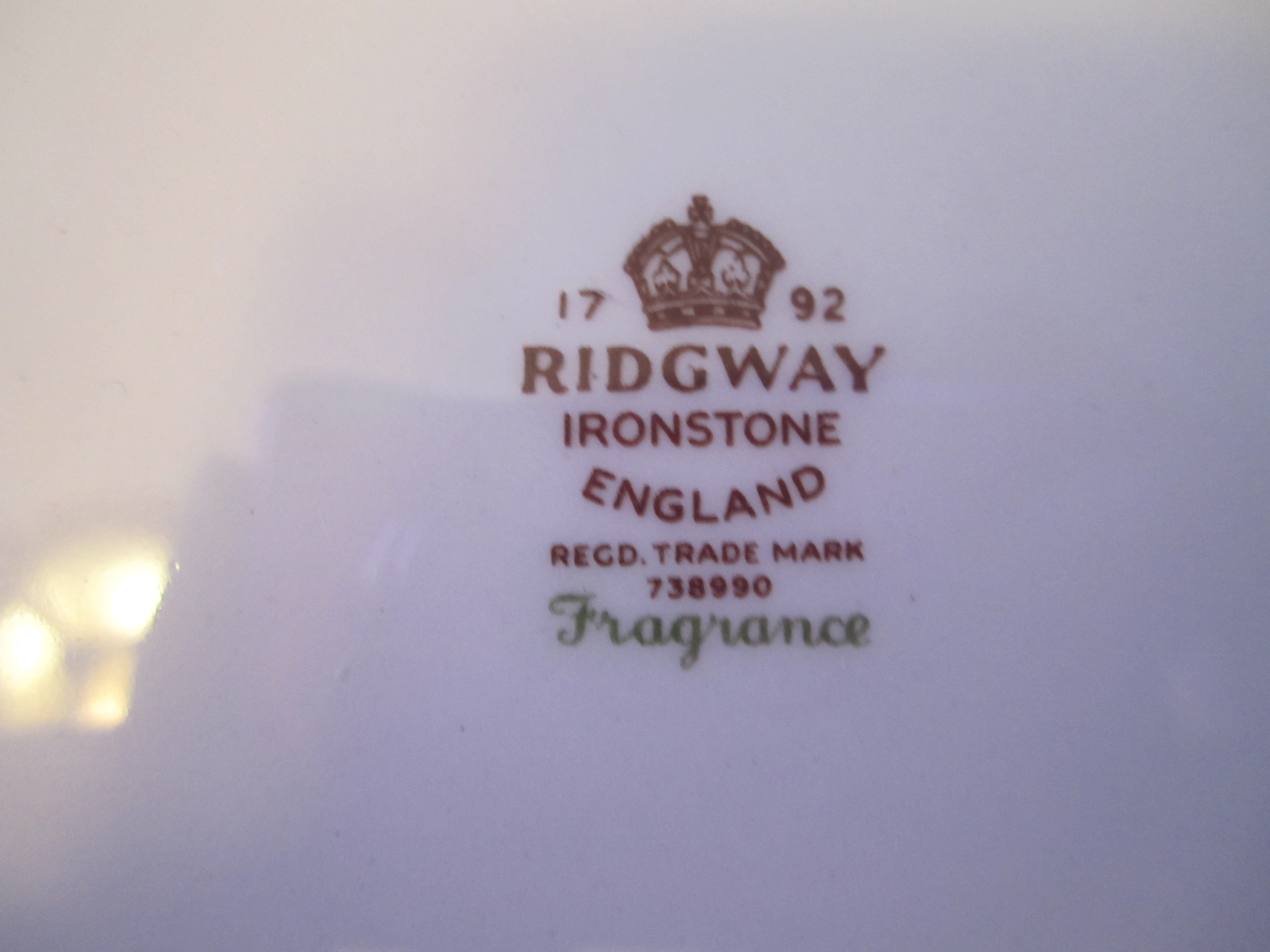 Set of 4 plates and 4 bowls with a 1792 Ridgway Ironstone England REGD Trade mark 738990 Fragrance is all written on the back. This dishes have been passed down for a couple generations now.
