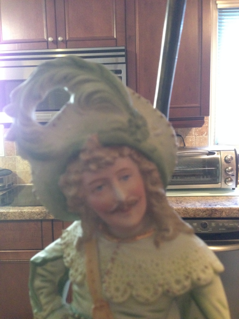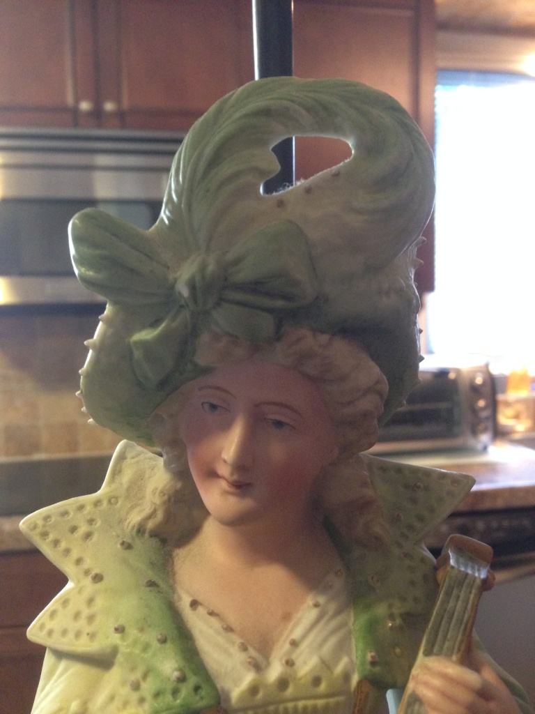 Antique lamps, Victorian era Bisque porcelain figurines that depict a 17th Century era royal couple! The woman is playing a mandolin and the man has a regal hat complete with a large plume feather! Major colour is light green Some cracking on one of the hats. These were my grandmothers who was born in the late 1800s. They had been in the family for decades. She was well travelled. I have seent he same statutes not mounted on a lamp base, so do not know if they were originally made for the light, or mounted after the fact, These were at the following site. http://www.worthpoint.com/worthopedia/victorian-era-17th-century-man-and-woman-bisque