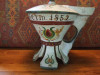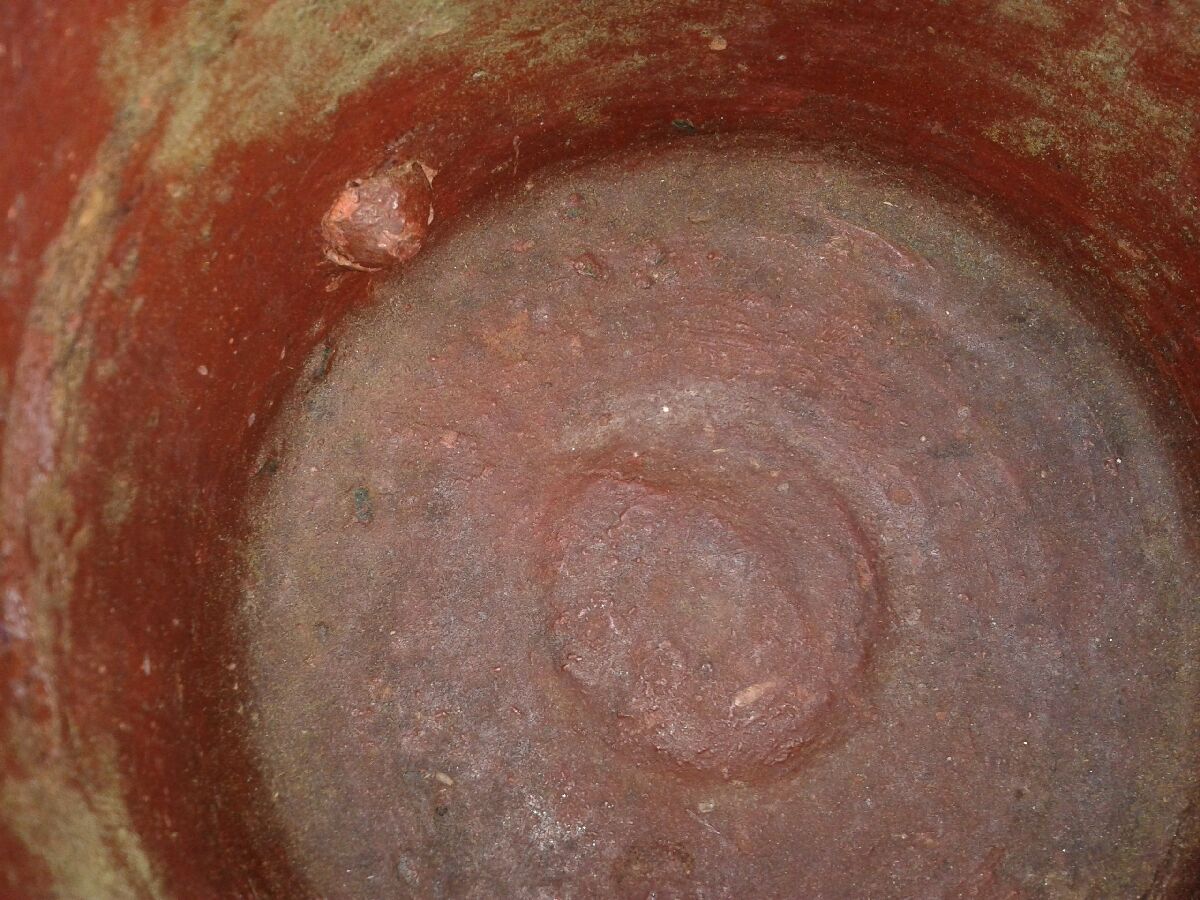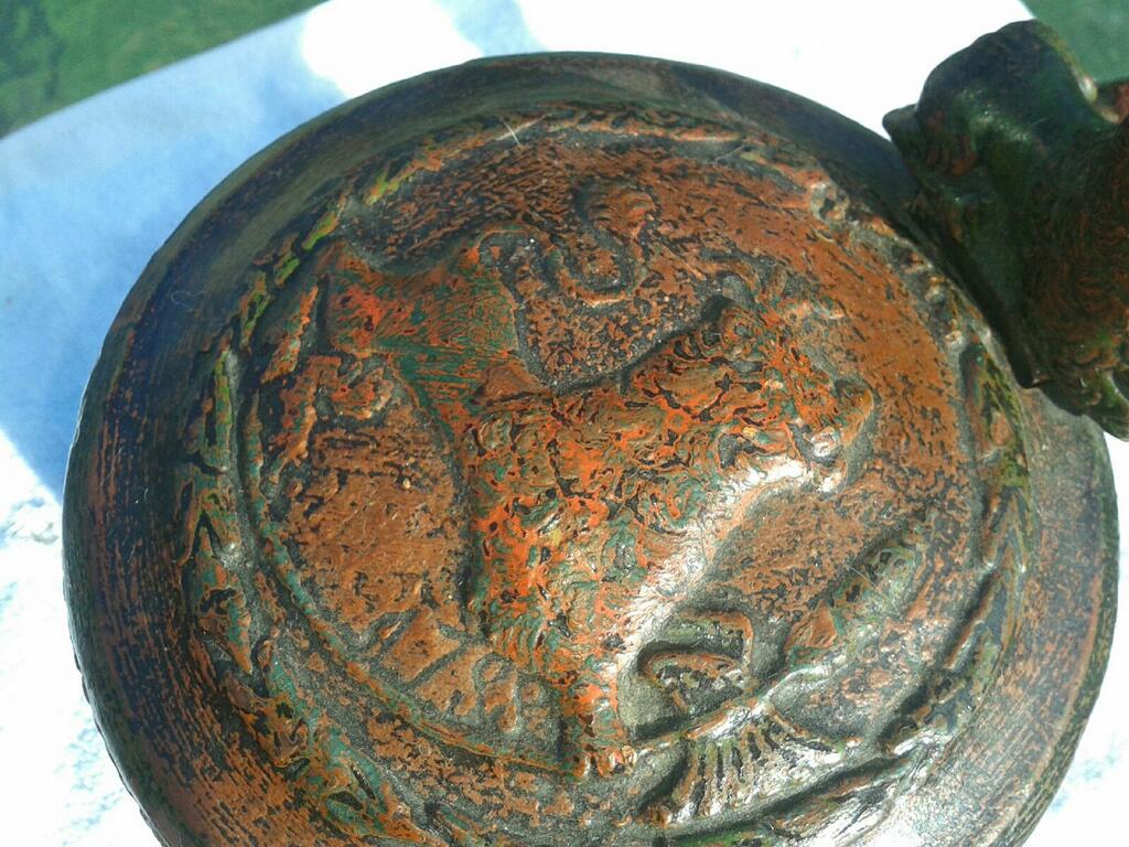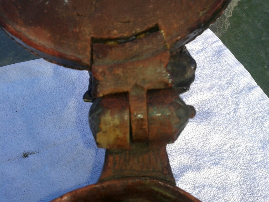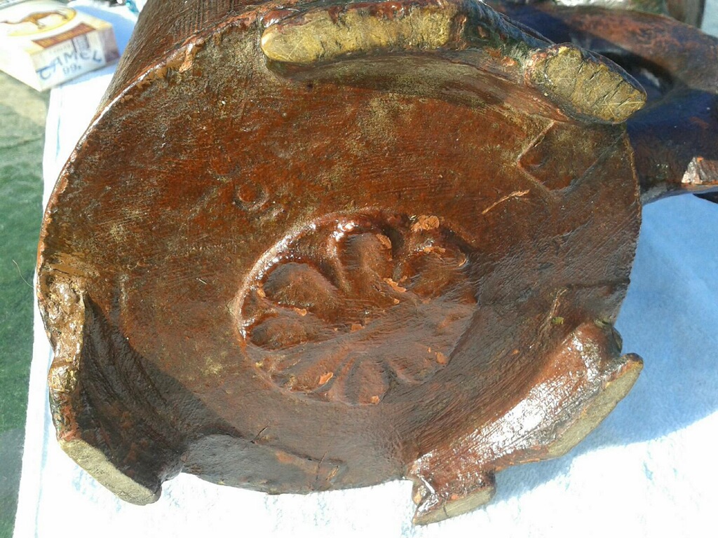 PUT TOGETHER WITH WOOD PEGS AND WOOD HINGE, LIITLE DAMAGE TO ONE FOOT IE , TEETH MARKS CAN BE SEEN ON LIP, ON BOTTOM THERE ARE 3 PIECES OF CRUDE THIN SUBSTANCE UNDER STAIN