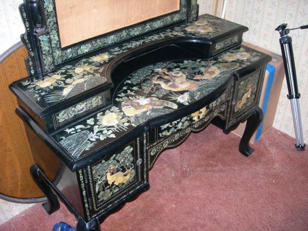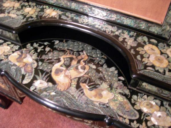 The Cabinet is MASSIVE, measuring over 8 feet wide by 77" tall and about two feet deep. I have never seen so much Mother of Pearl and abalone inlay in my LIFE as these pieces have. I have been told these were created somewhere in the 18th century.That is pretty much all I know about the pieces.