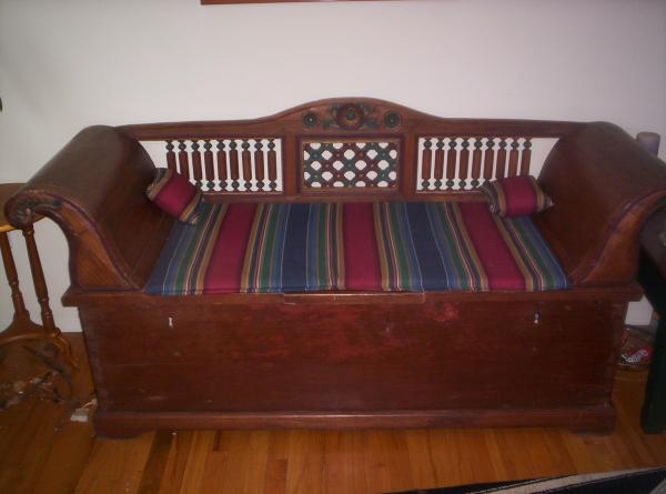 This is a beautiful love seat. It is from the 1800's to the best of my knowledge. It has a middle part that lifts up and you can store blankets, quilts, etc inside. Original hardware. Also has custom made pillows, and a custom made seat cushion. Any help would be great ! Thank-You