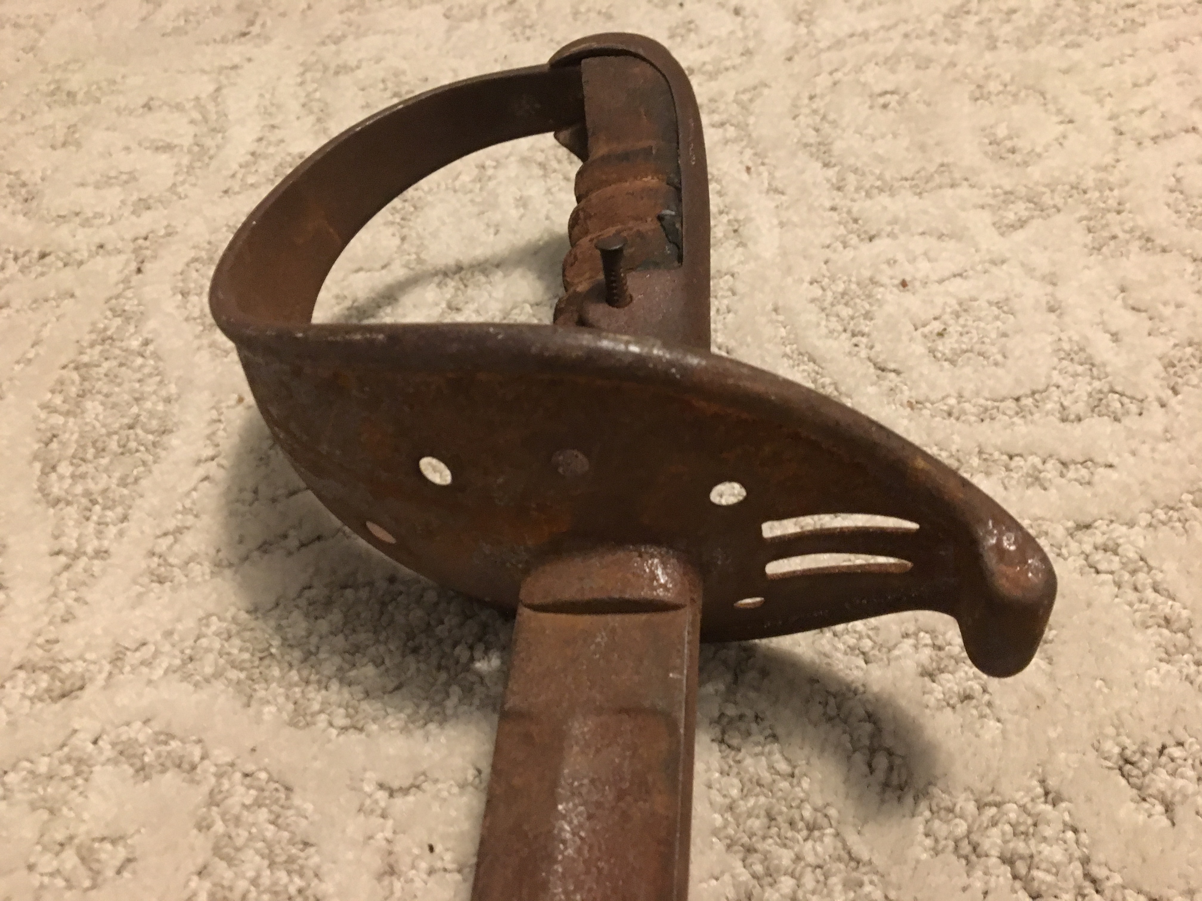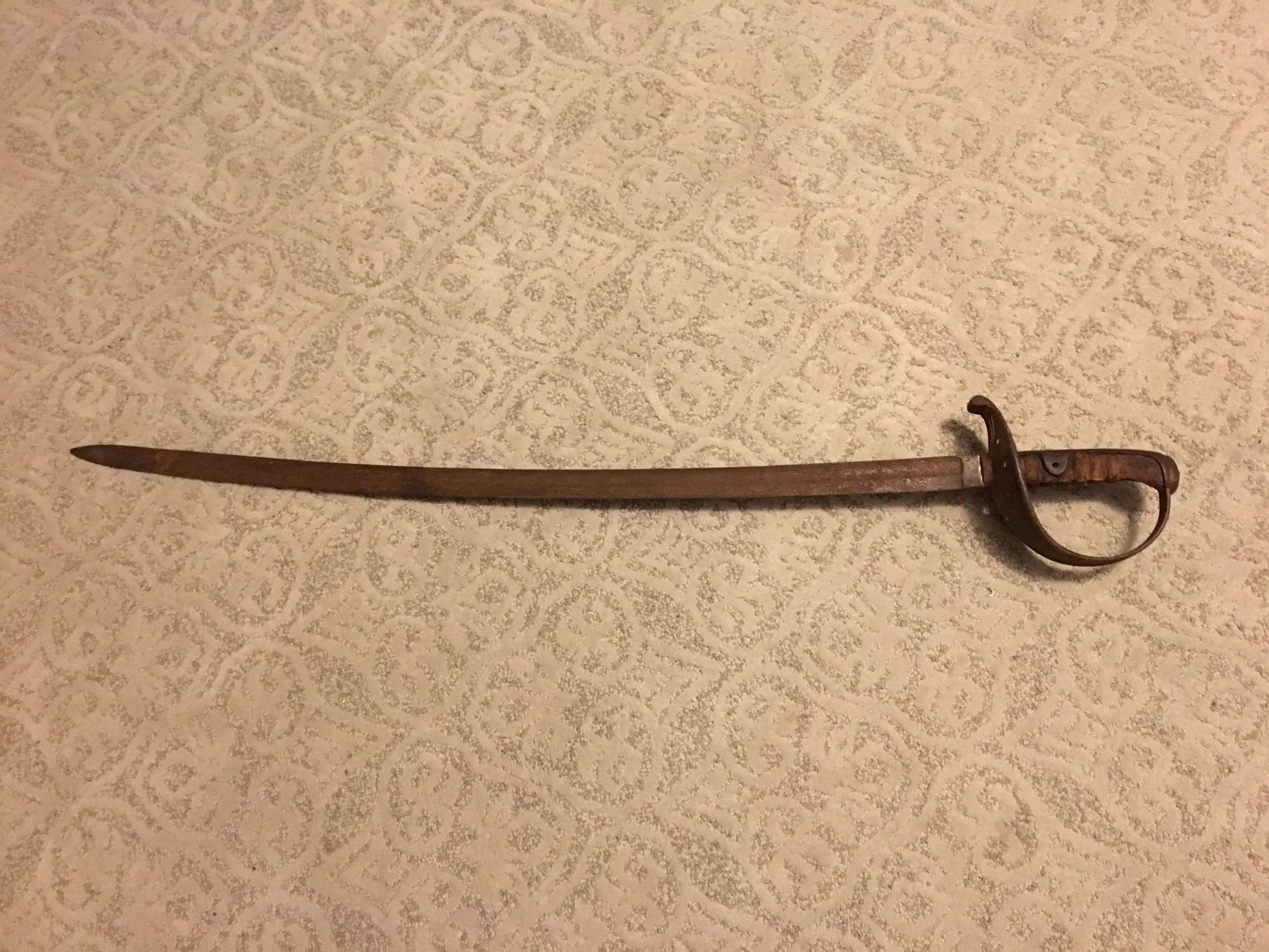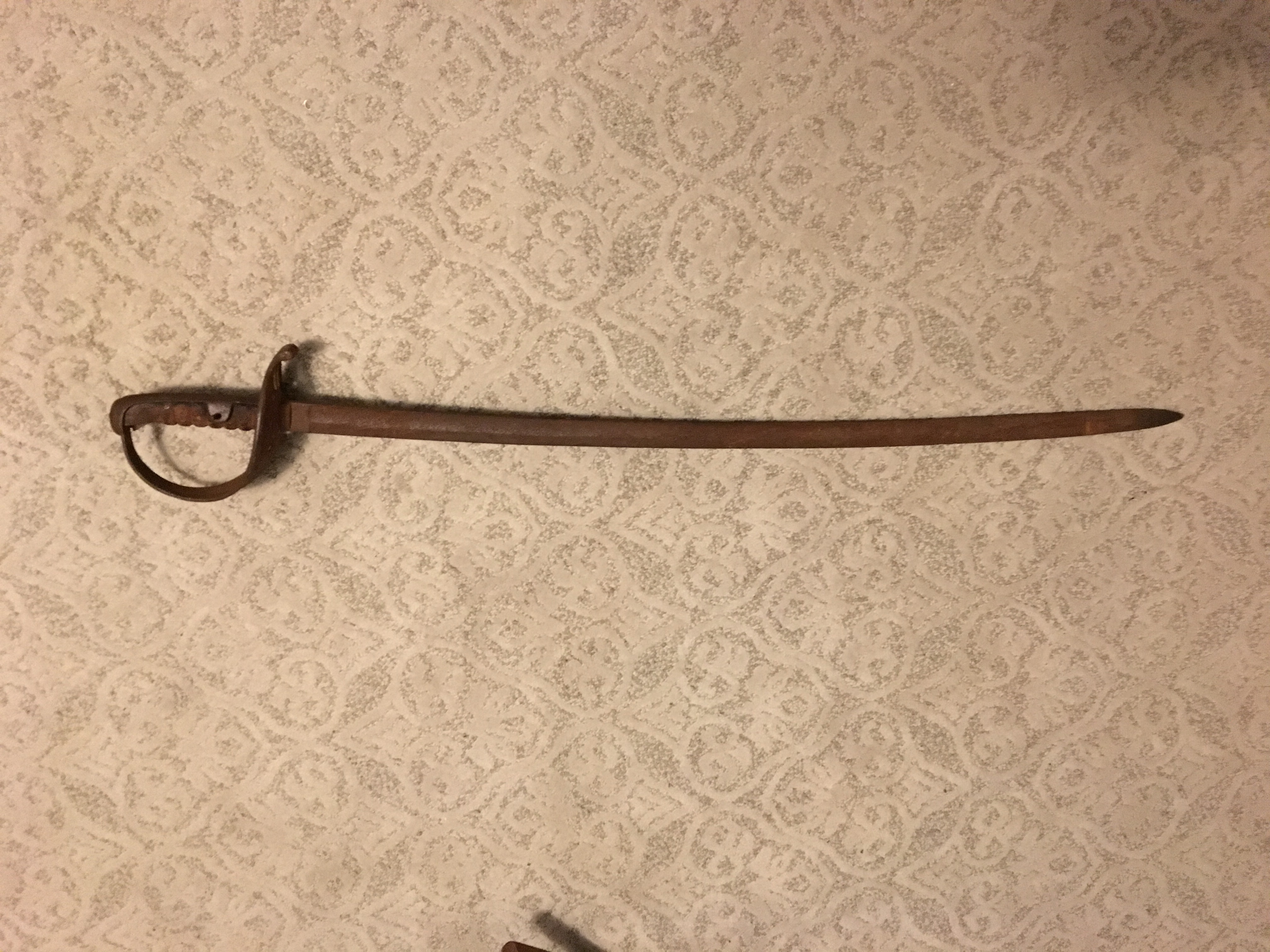 42” sword/saber length, 35” blade. Stamped initials of “GF” the mark of US Inspector of Arms, likely George Flegel, who inspected swords/saber from 1812-1815. Lots of oxidation/patina. It also has a stamp that looks like a club or possibly an angel. I’m trying to confirm if my research is correct, who the maker is and potential value.