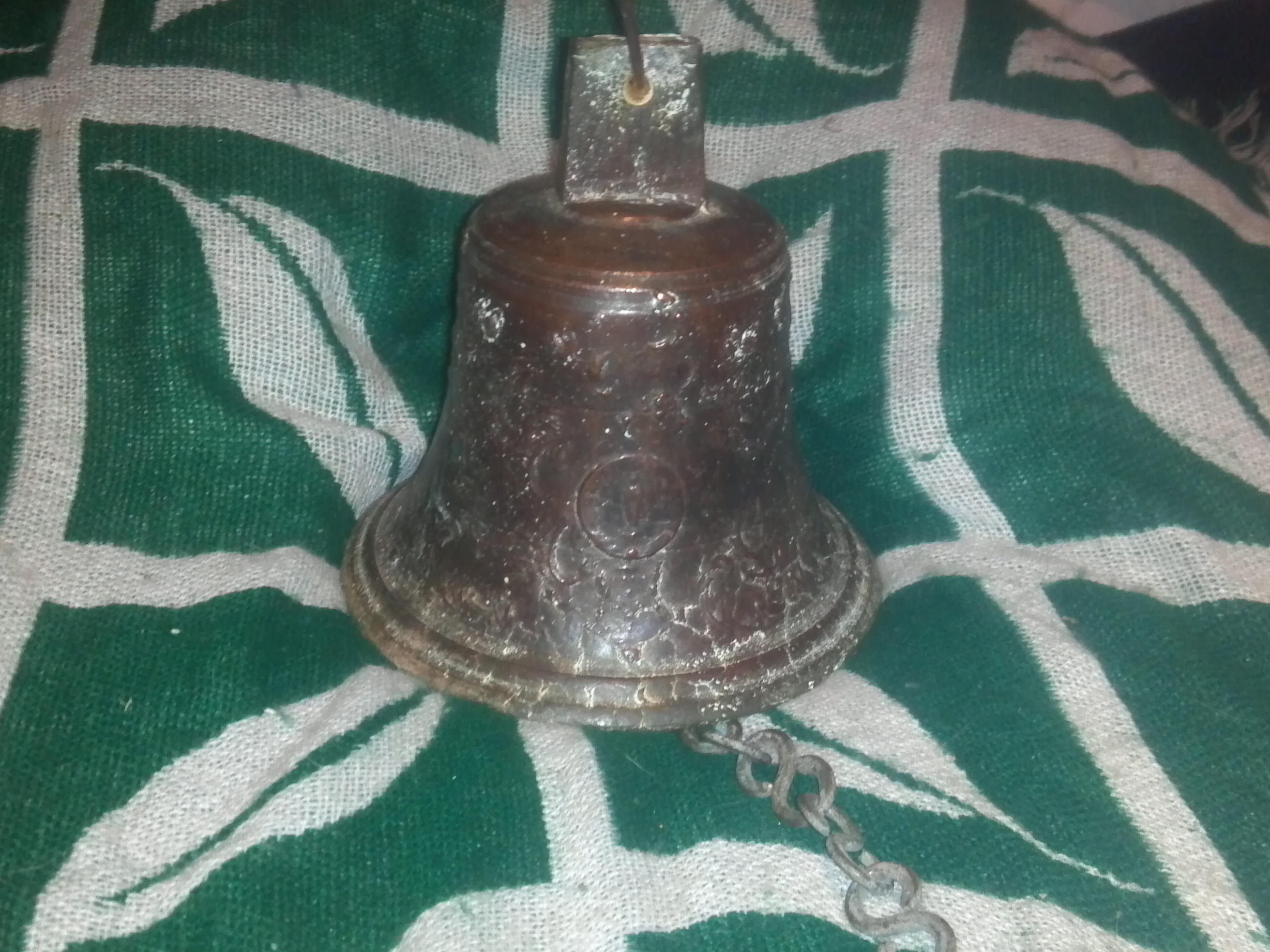 Brass bell. 1818. Has the right tarnish. Sandcast. Has white corrosion which leads me to believe it was a shipwreck recovery.