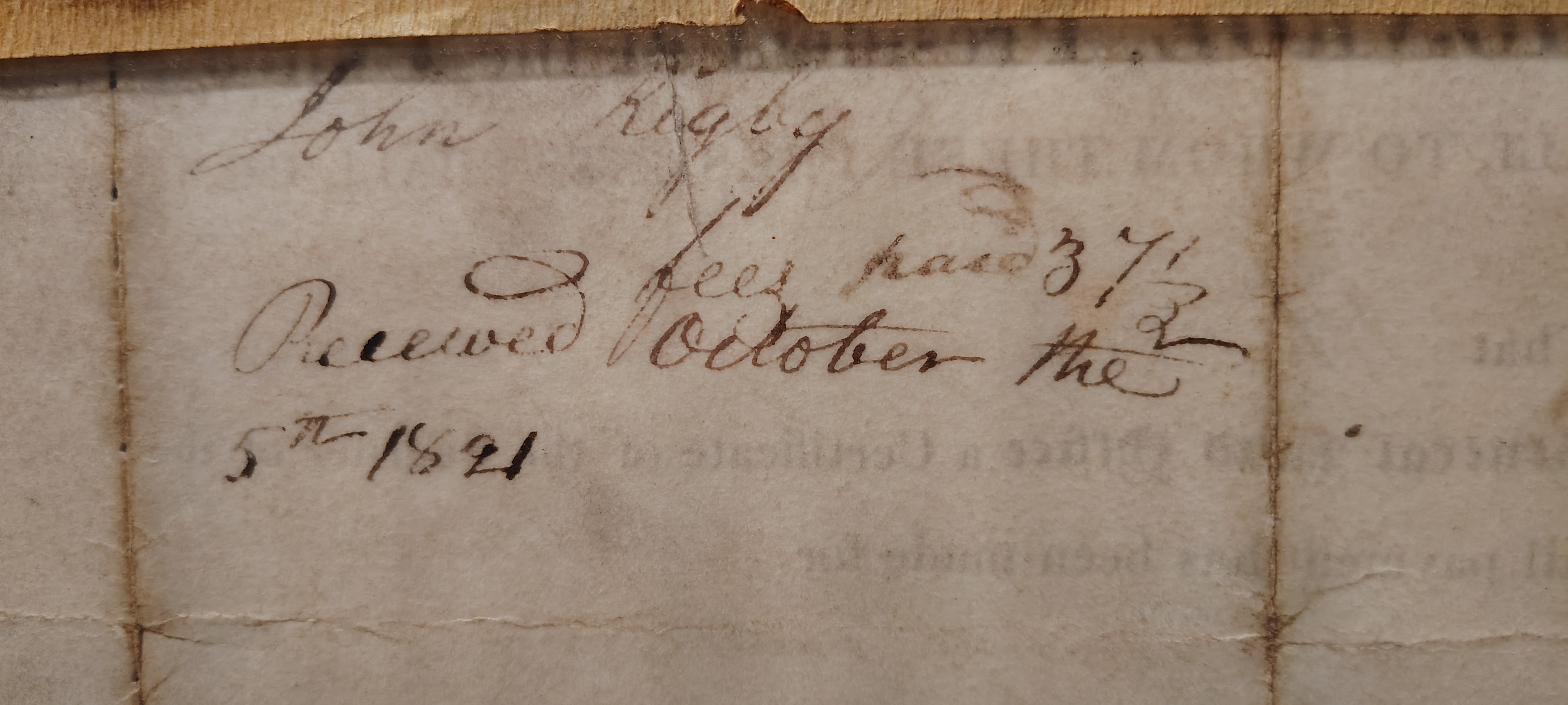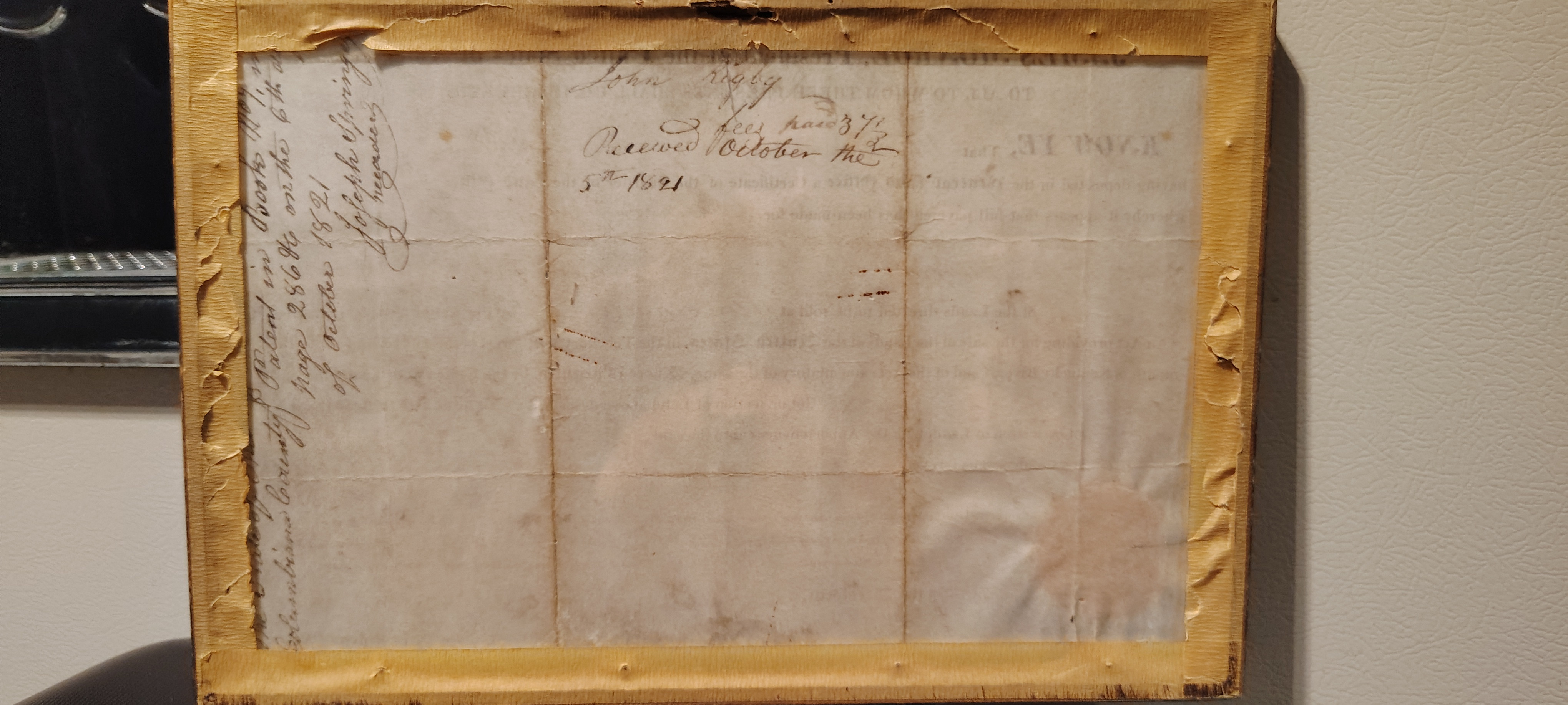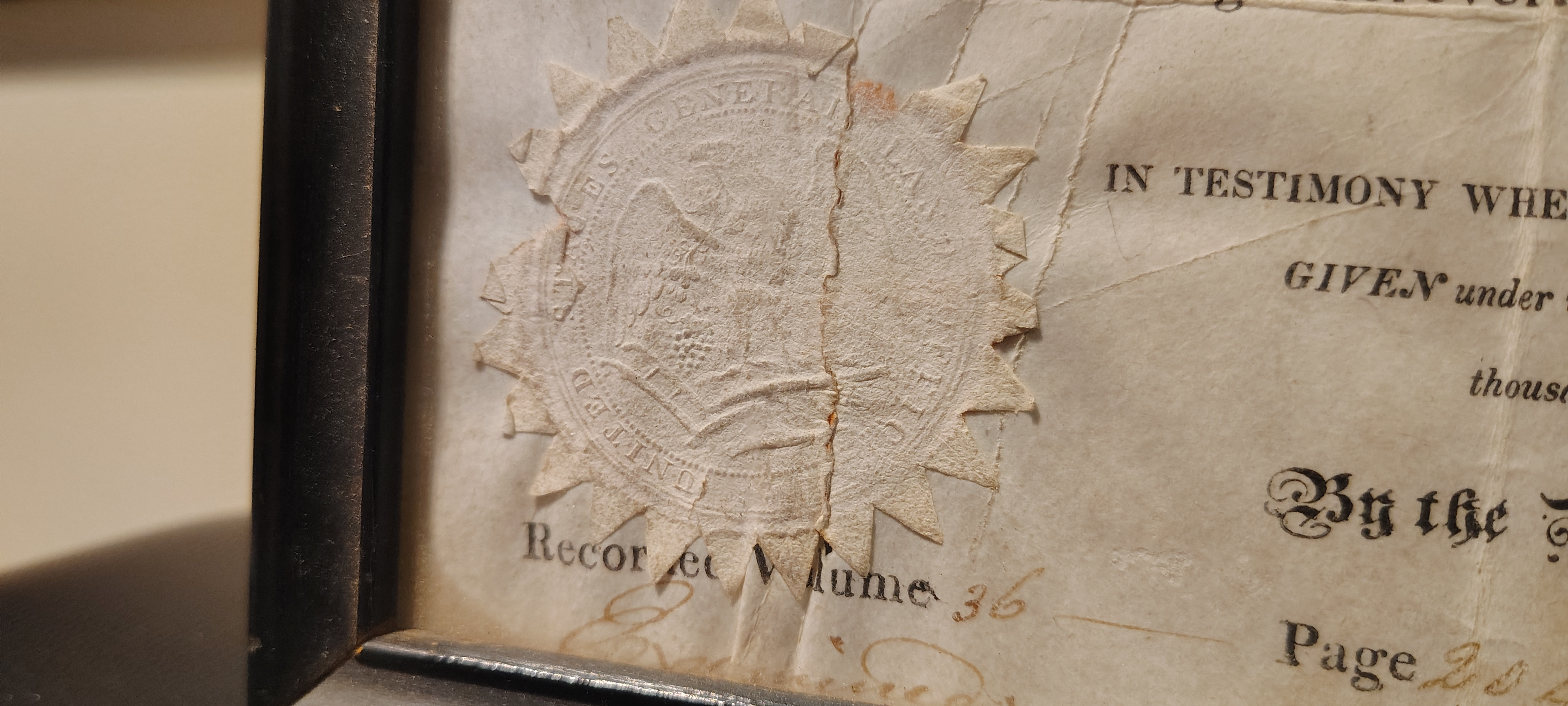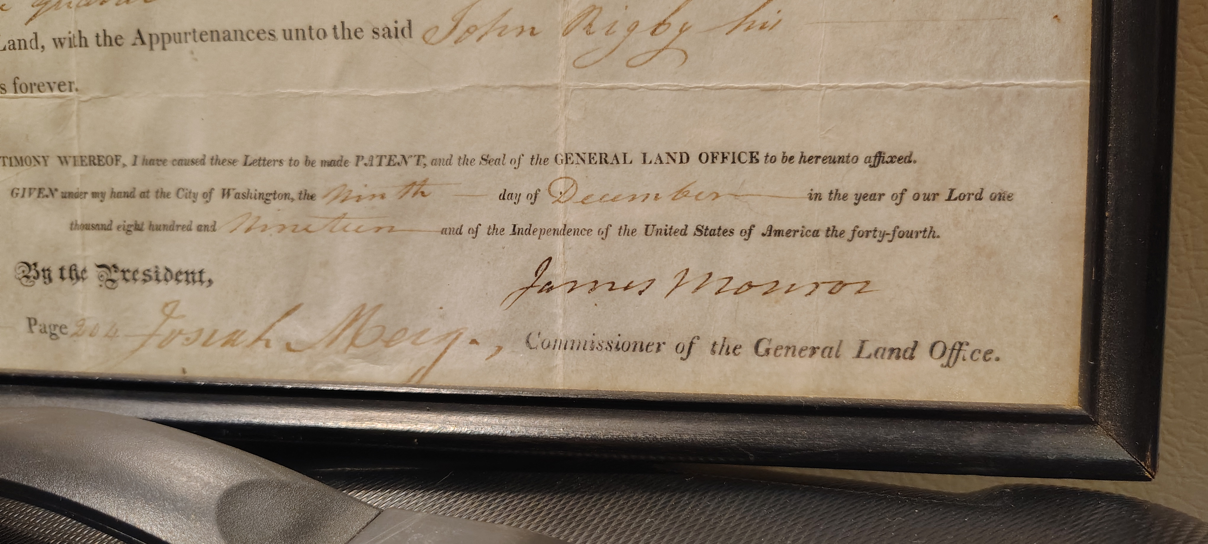 United States General Land Office seal in bottom left of front side Signature of President Monroe in bottom right of front side Back has date document was received and notes that the fees were paid