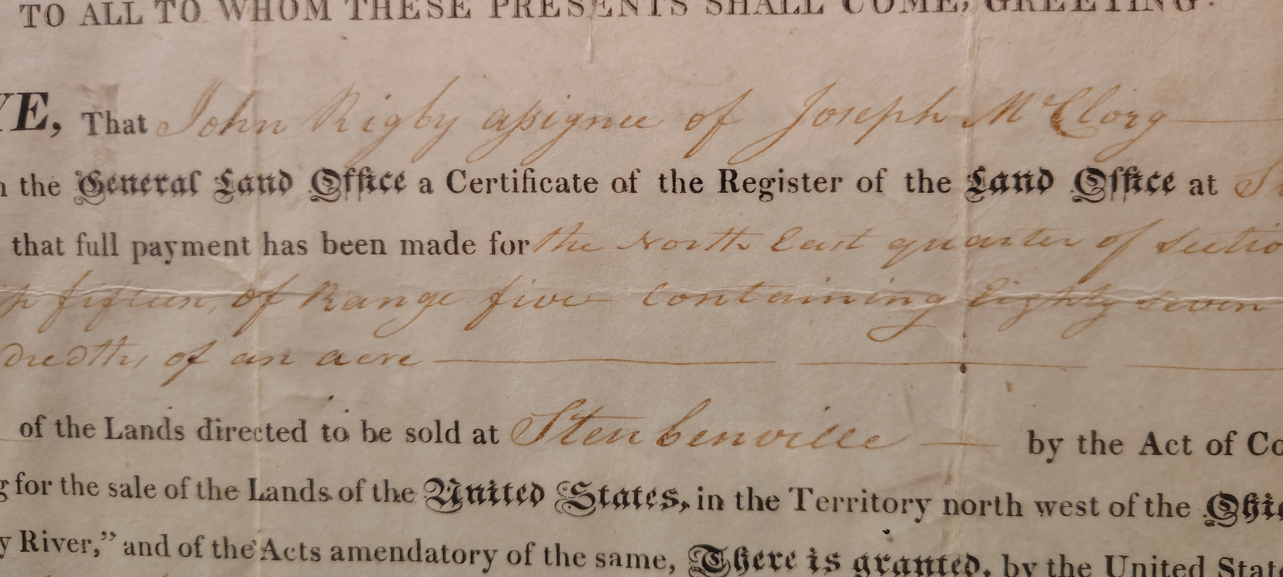 Following the Land Ordinance of 1785 and the Northwest Ordinance of 1787, lands in Ohio (part of the Northwest Territory) were sold or granted by the federal government to veterans, settlers, and purchasers. By 1819: