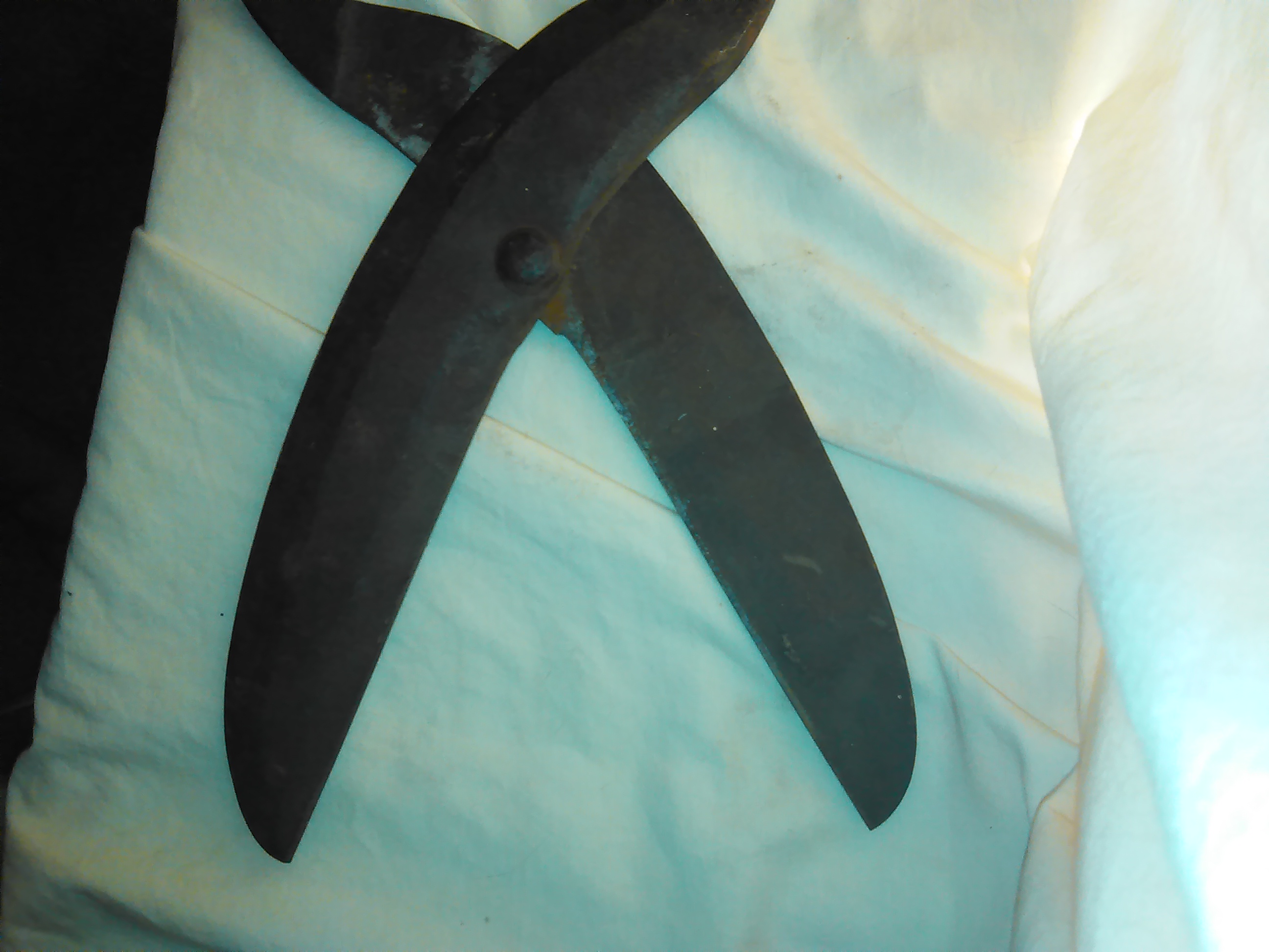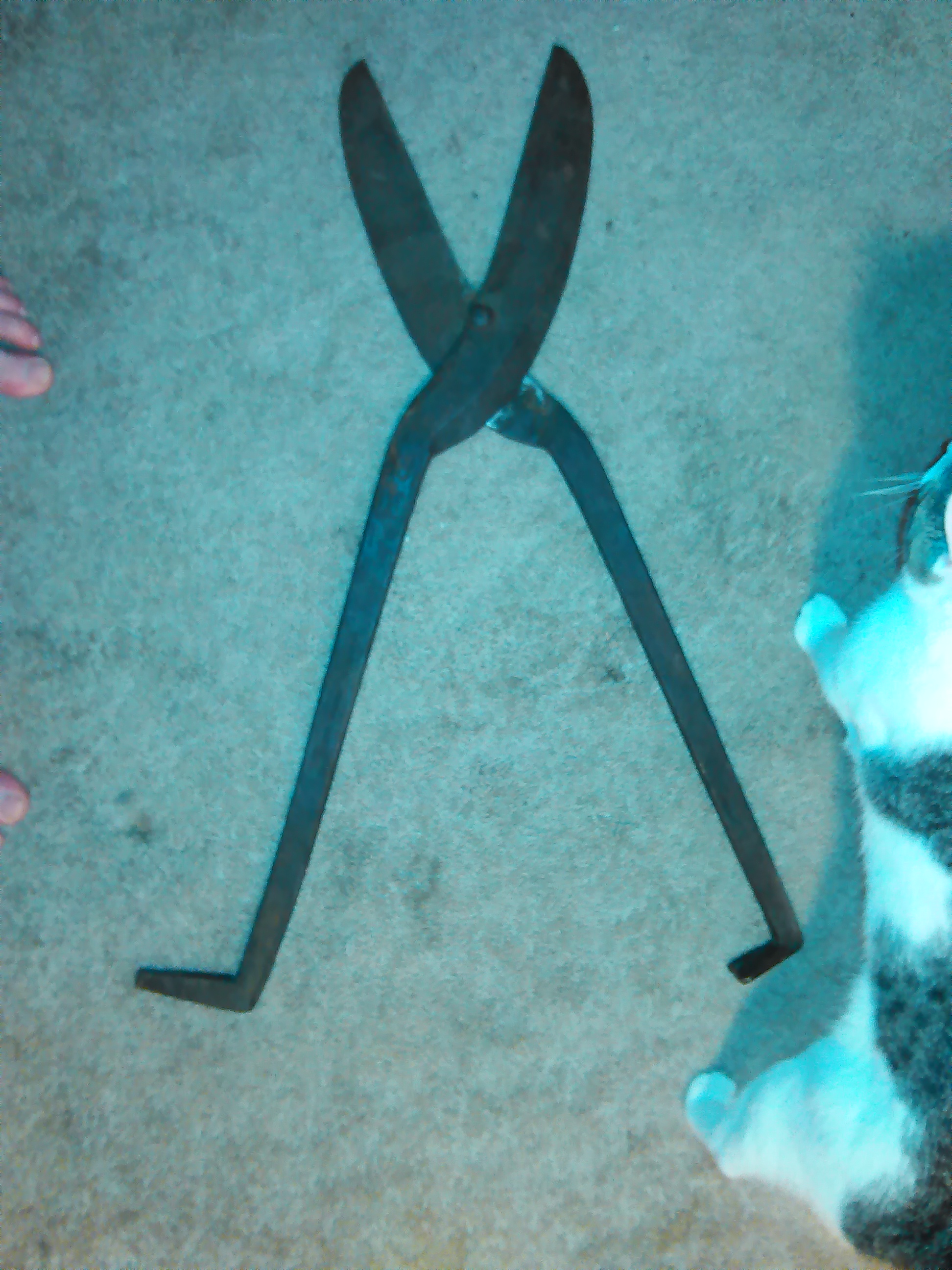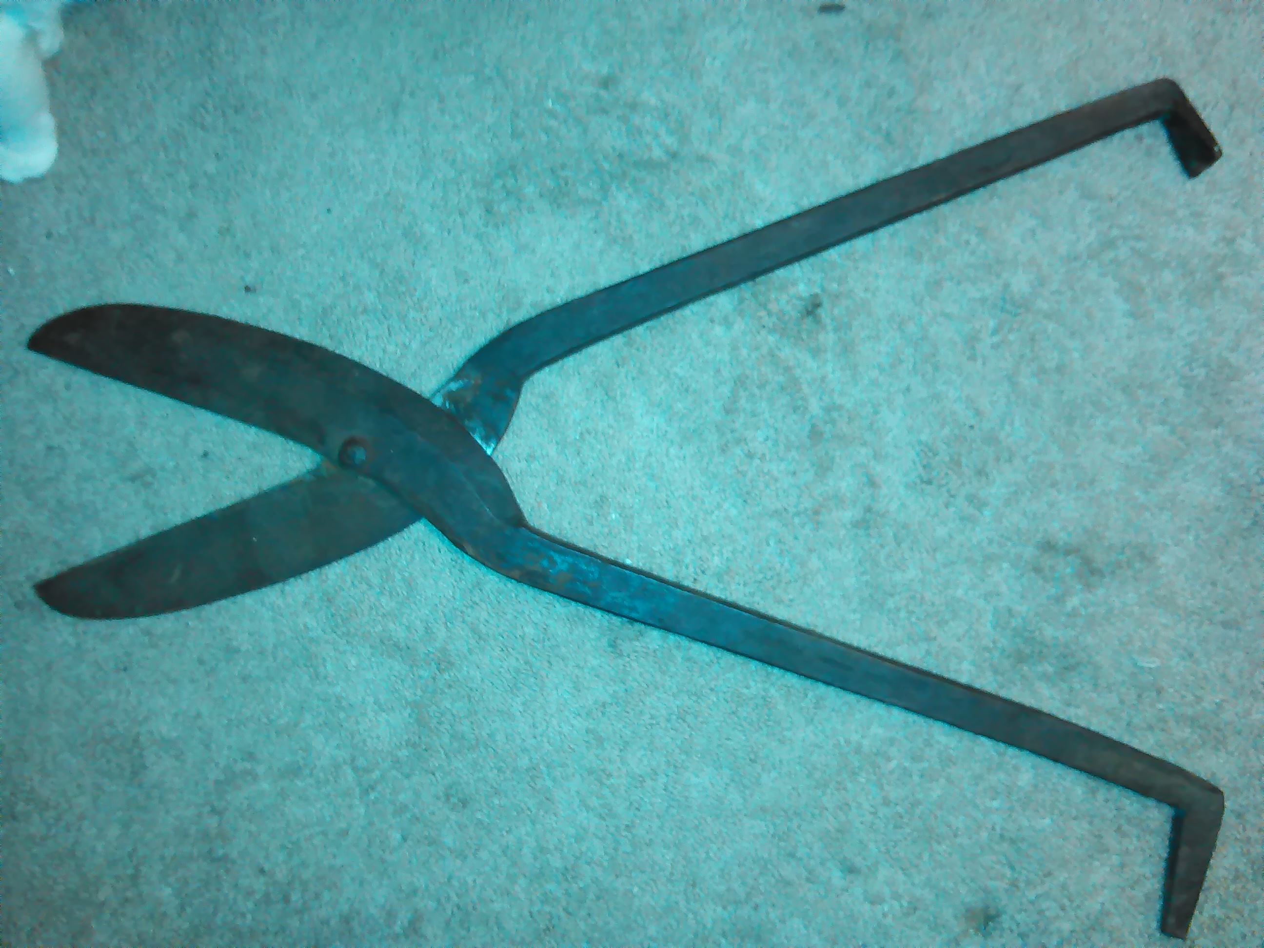 Very large and heavy shears 30 inches long 10 pounds heavy 7 inch cut length cast iron rounded tips hooks to attach to bench marked J. north cast steel patent number 4 in Roman letters this item is still dusty slight surface rust some black animal still there cutting-edge looks pristine never been used this item is still dusty slate surface rust some black animal still there cutting edge looks christine never been used