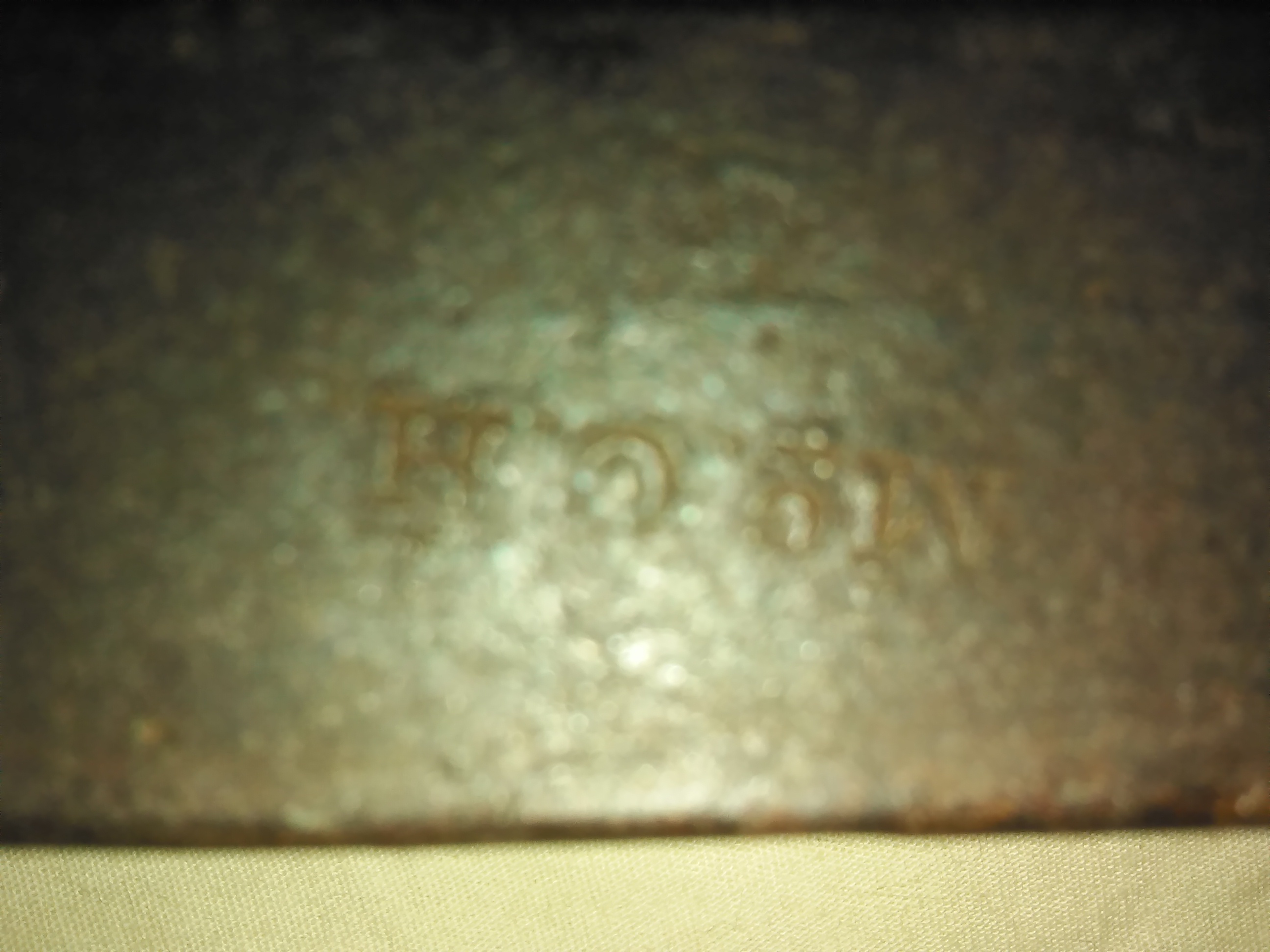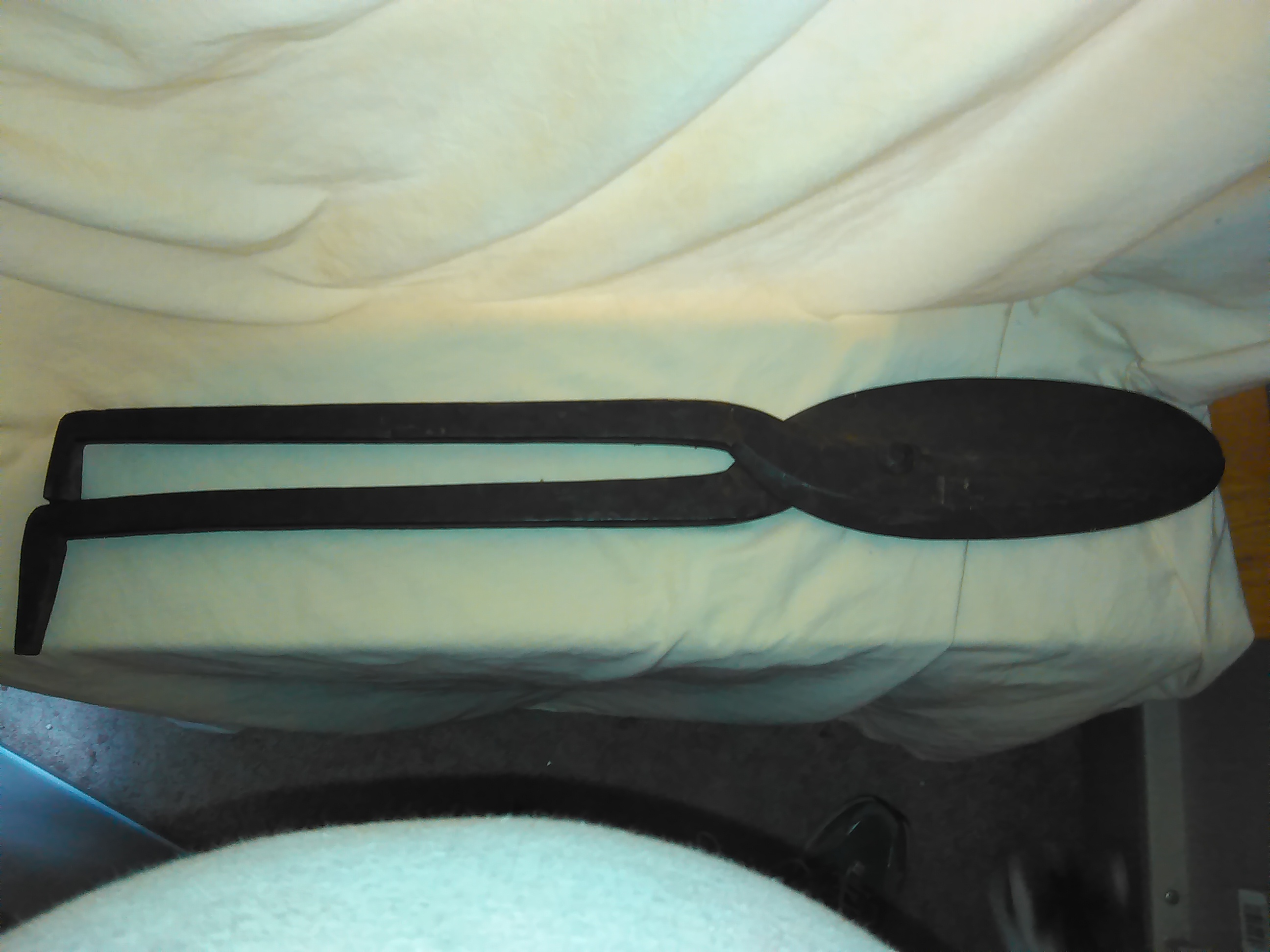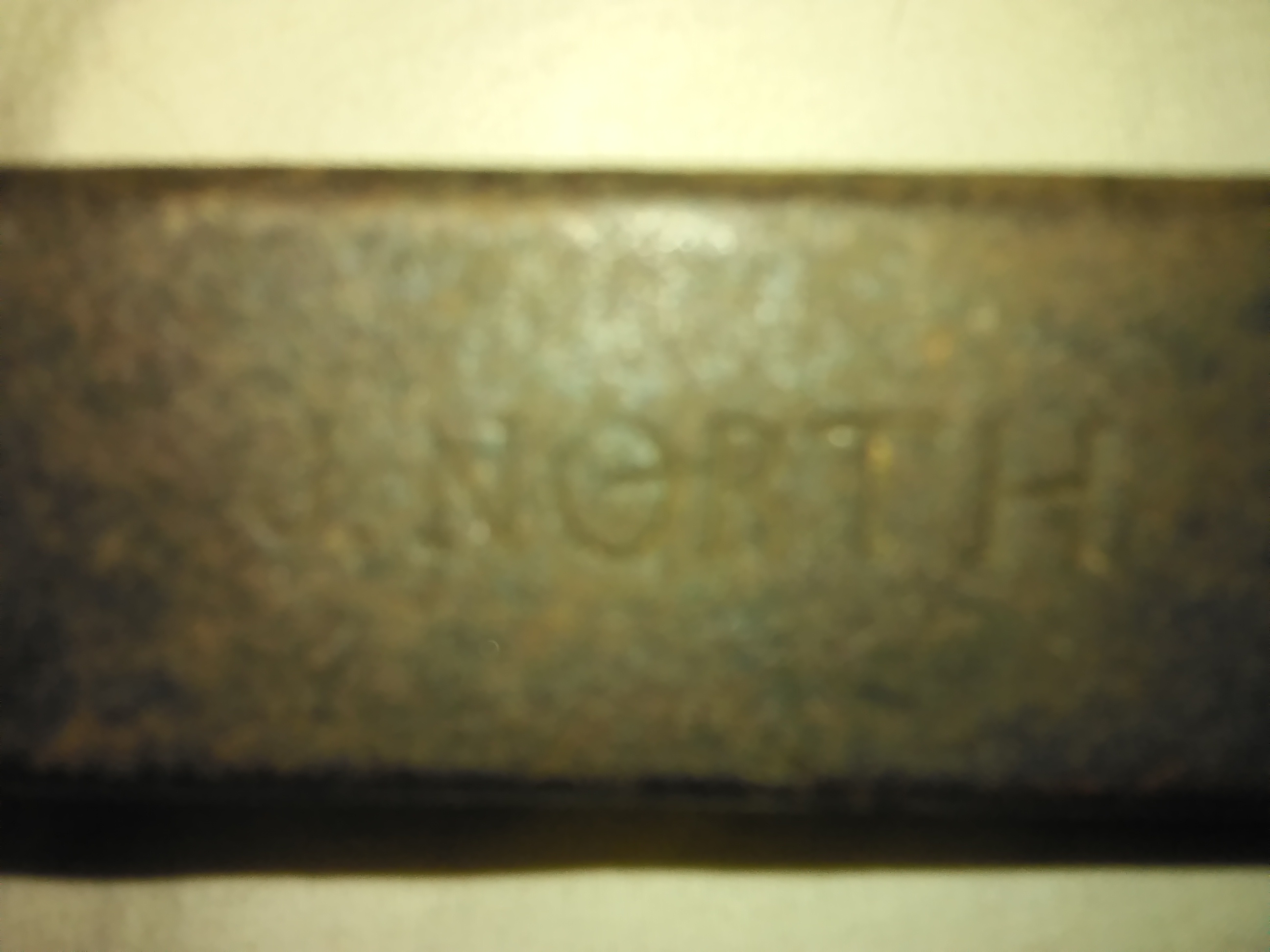 Very large and heavy shears 30 inches long 10 pounds heavy 7 inch cut length cast iron rounded tips hooks to attach to bench marked J. north cast steel patent number 4 in Roman letters this item is still dusty slight surface rust some black animal still there cutting-edge looks pristine never been used this item is still dusty slate surface rust some black animal still there cutting edge looks christine never been used