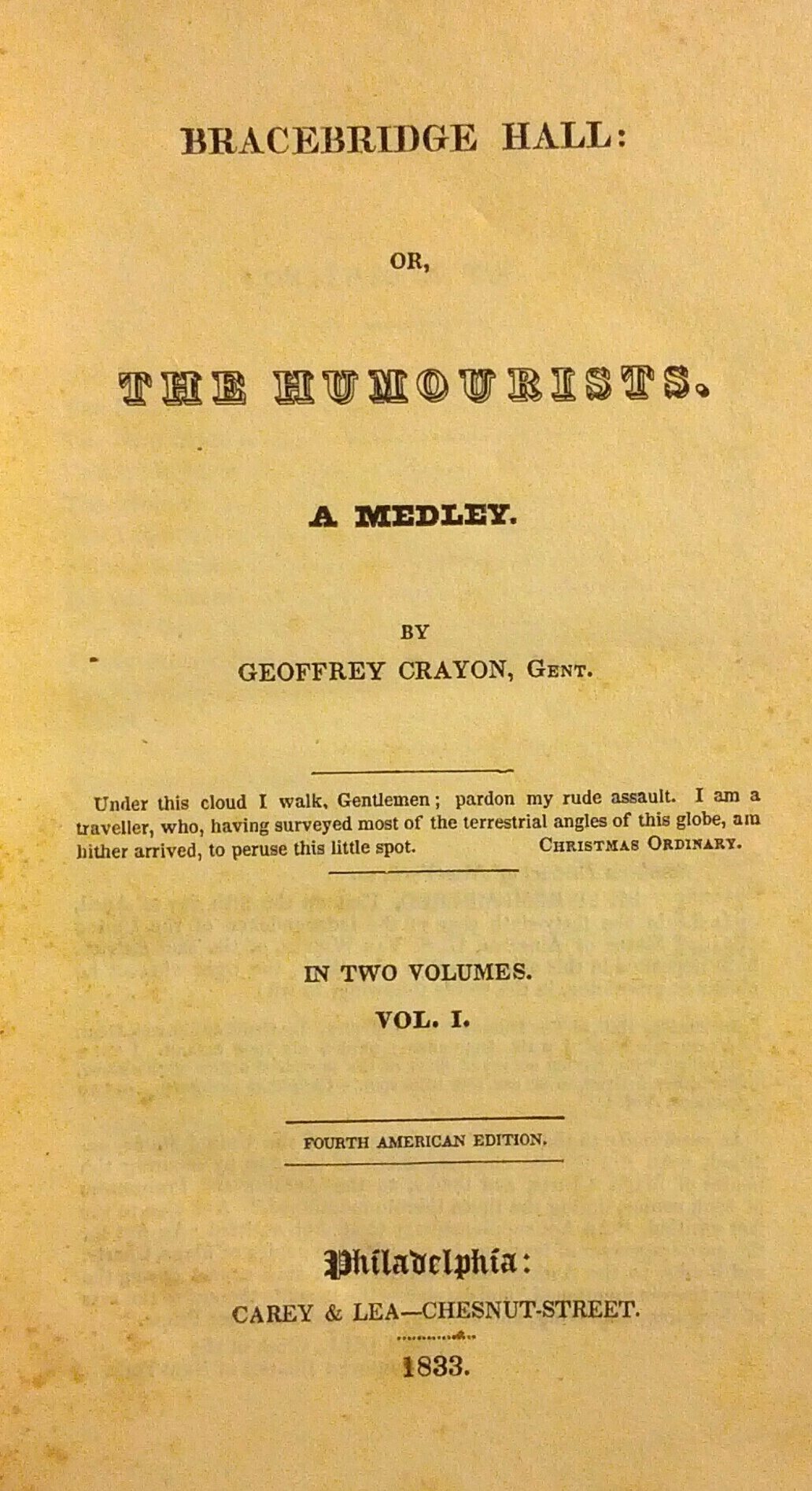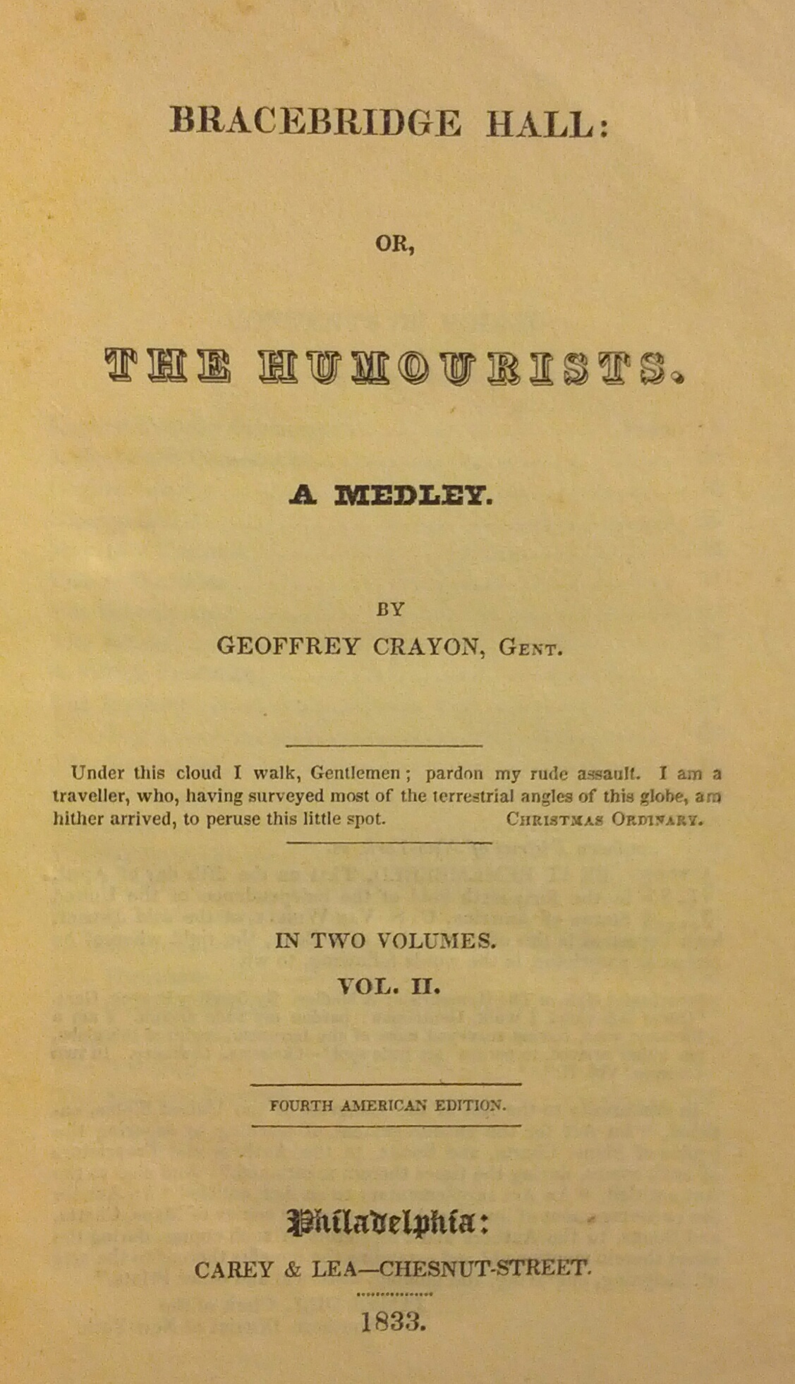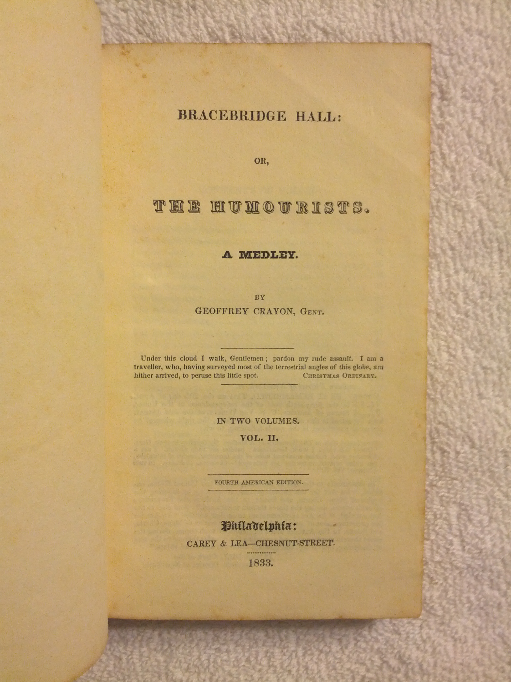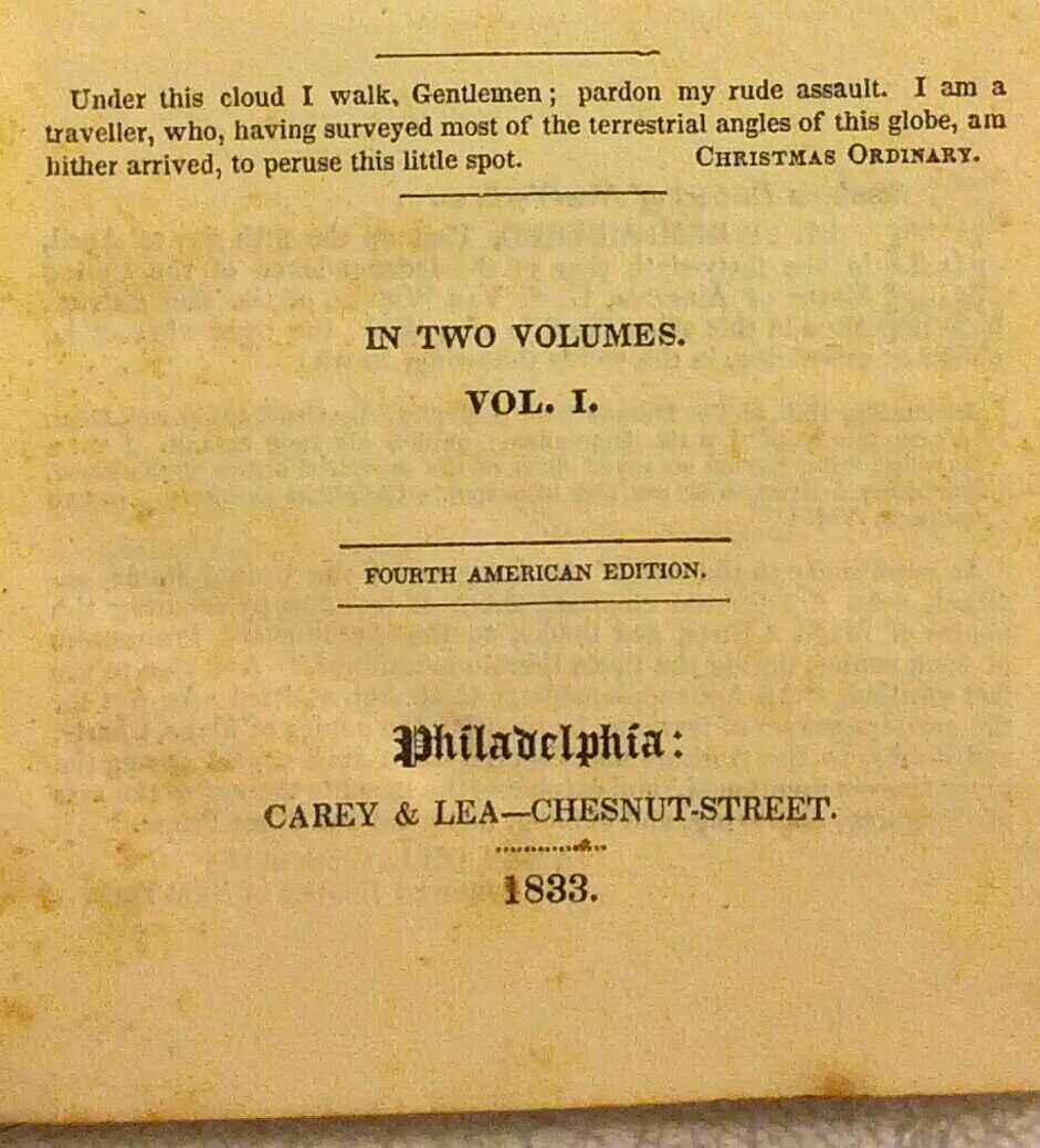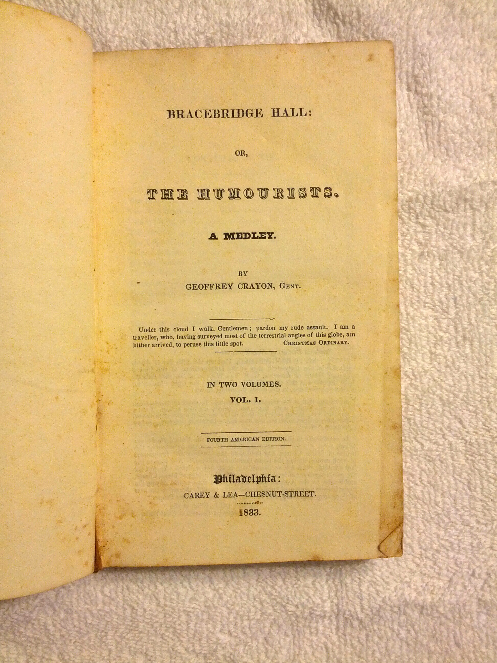 WAshington Irving 1833, The Humourists two volumes, The covers are not intact to the book, There are some foxing, no missing or torn pages, I am looking for more info on this 1833 edition, The book says By Geoffrey Crayon, Gent, instead of Washington Irvin, Does all his books have this kind of printing in them