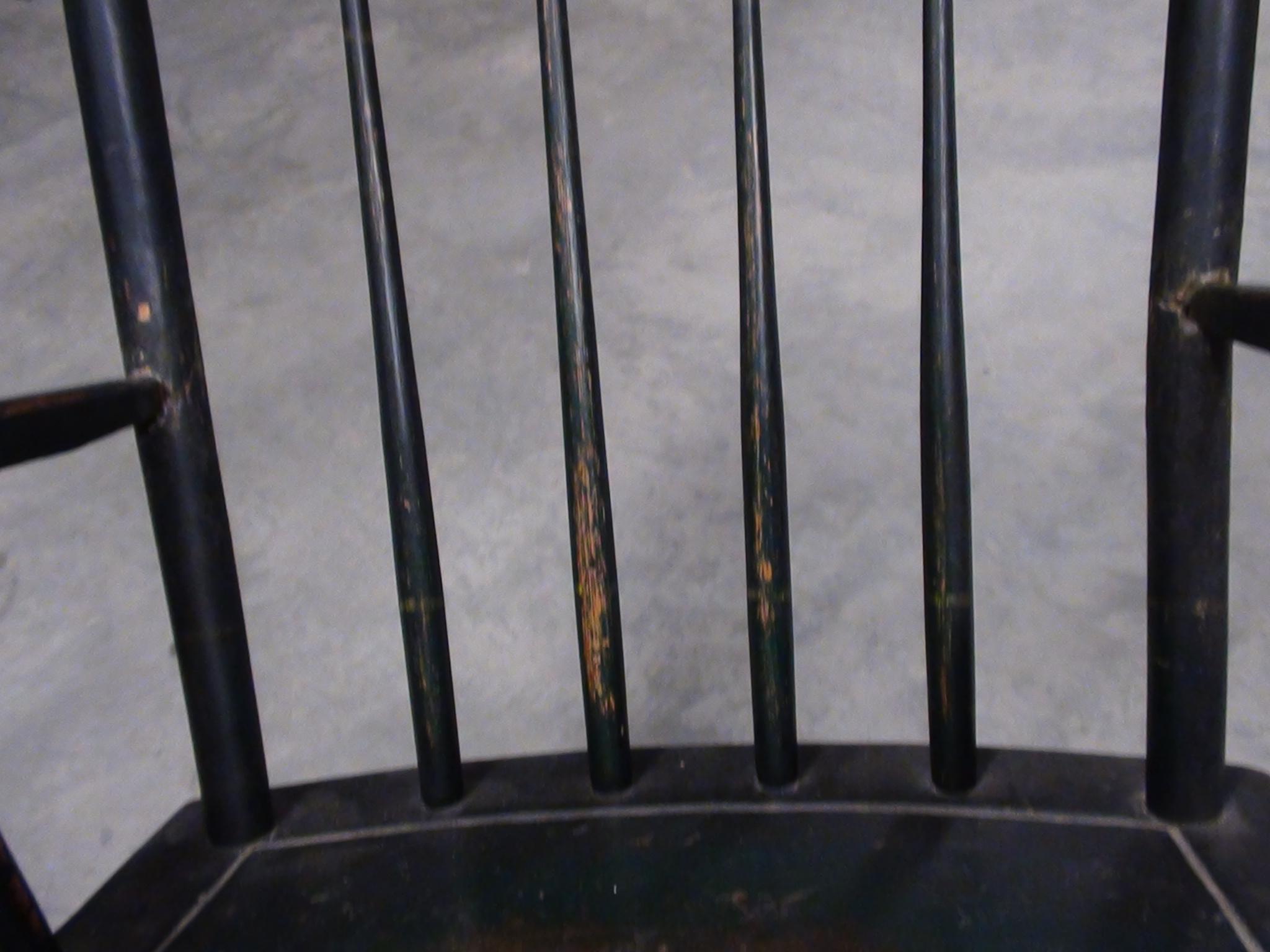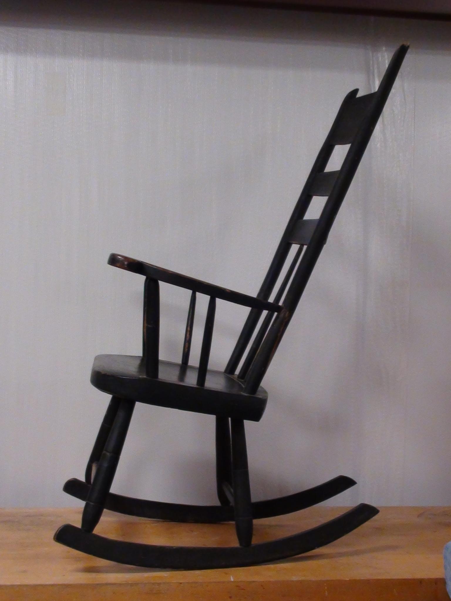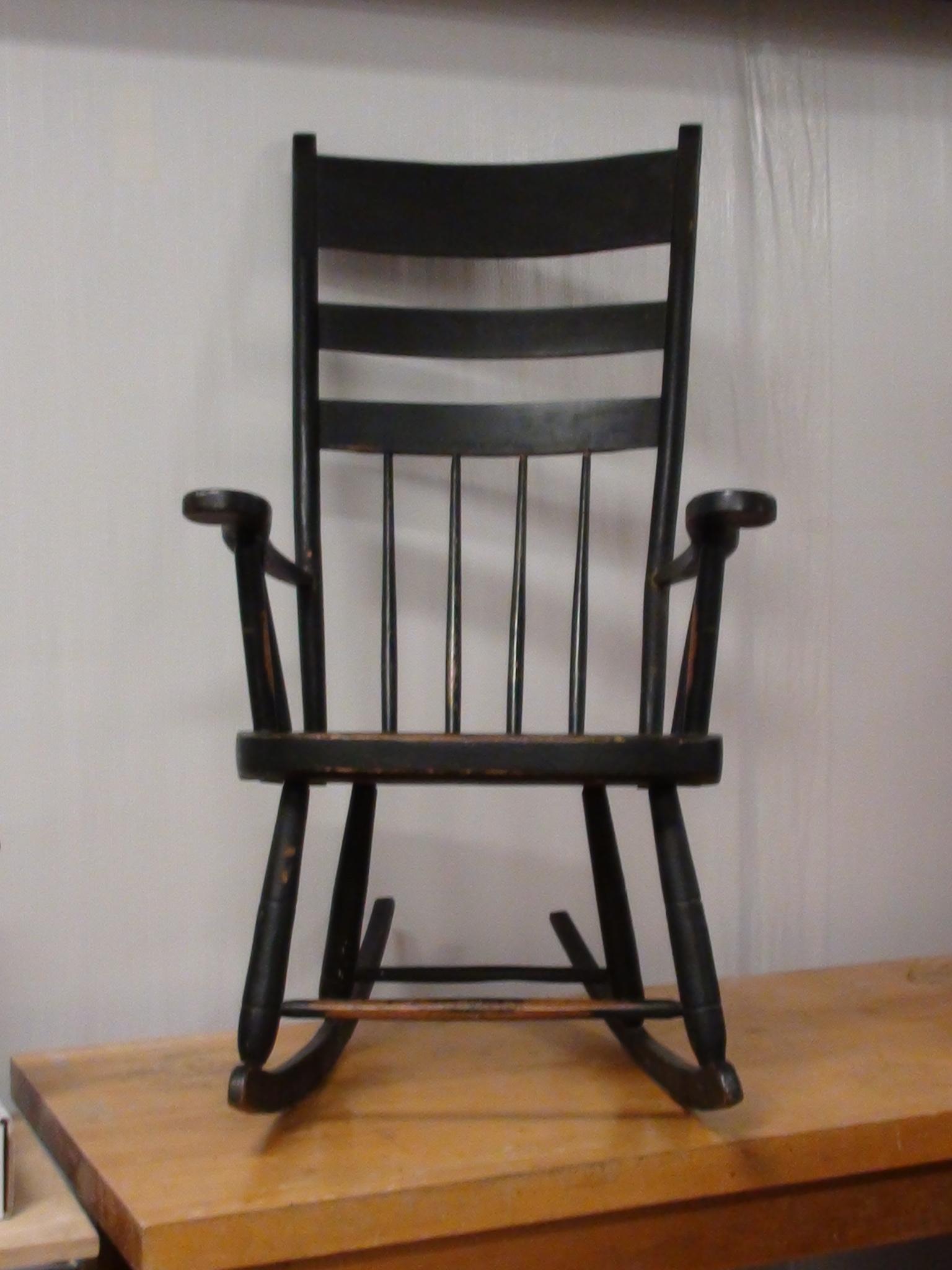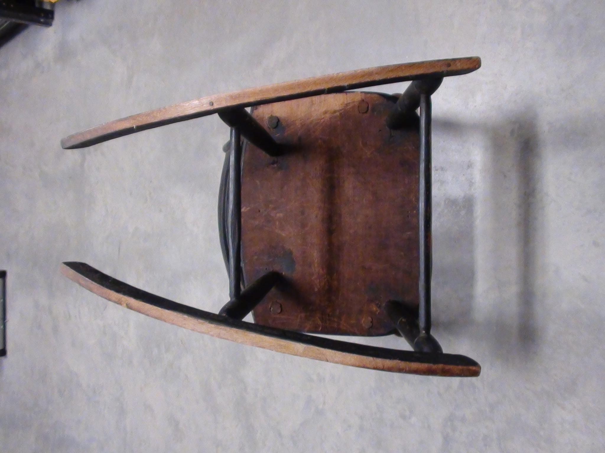 This old rocking chair has written on the bottom "Bought in Pontack 1835" The wood is aged and polished in spots from much use, has a lot of dull and dingy areas, and has an uneven dark coloring with a green cast. There are no modern fasteners used however there have been repairs made to the fractured spindles that had incorporated a few old tacks and such. Although the fractures are evident and not painted over, the repairs have held well and it is solid. The wood that is exposed in the polished areas appears to be Cherry wood. This rocker appears to be handmade and uses dowel and wedge to join the seat to the spindles. I don't know any history of this piece as I acquired it from an individual that was moving about 20 years ago. I have no idea of its value or worth.