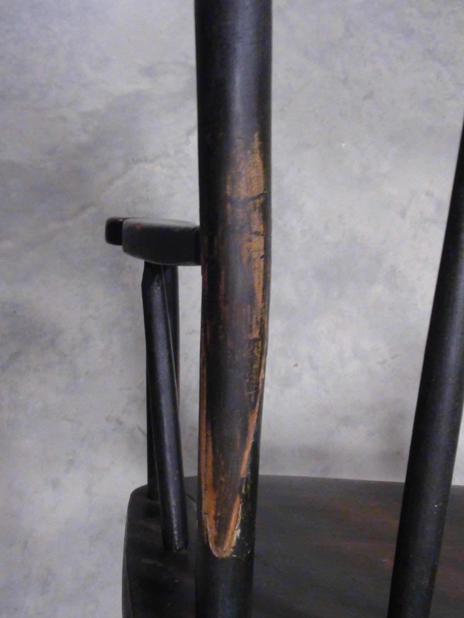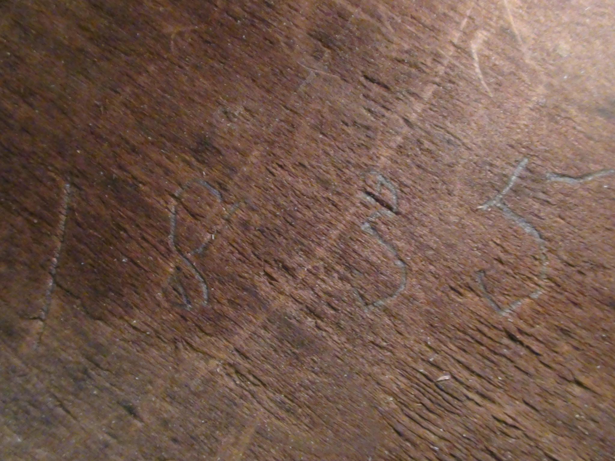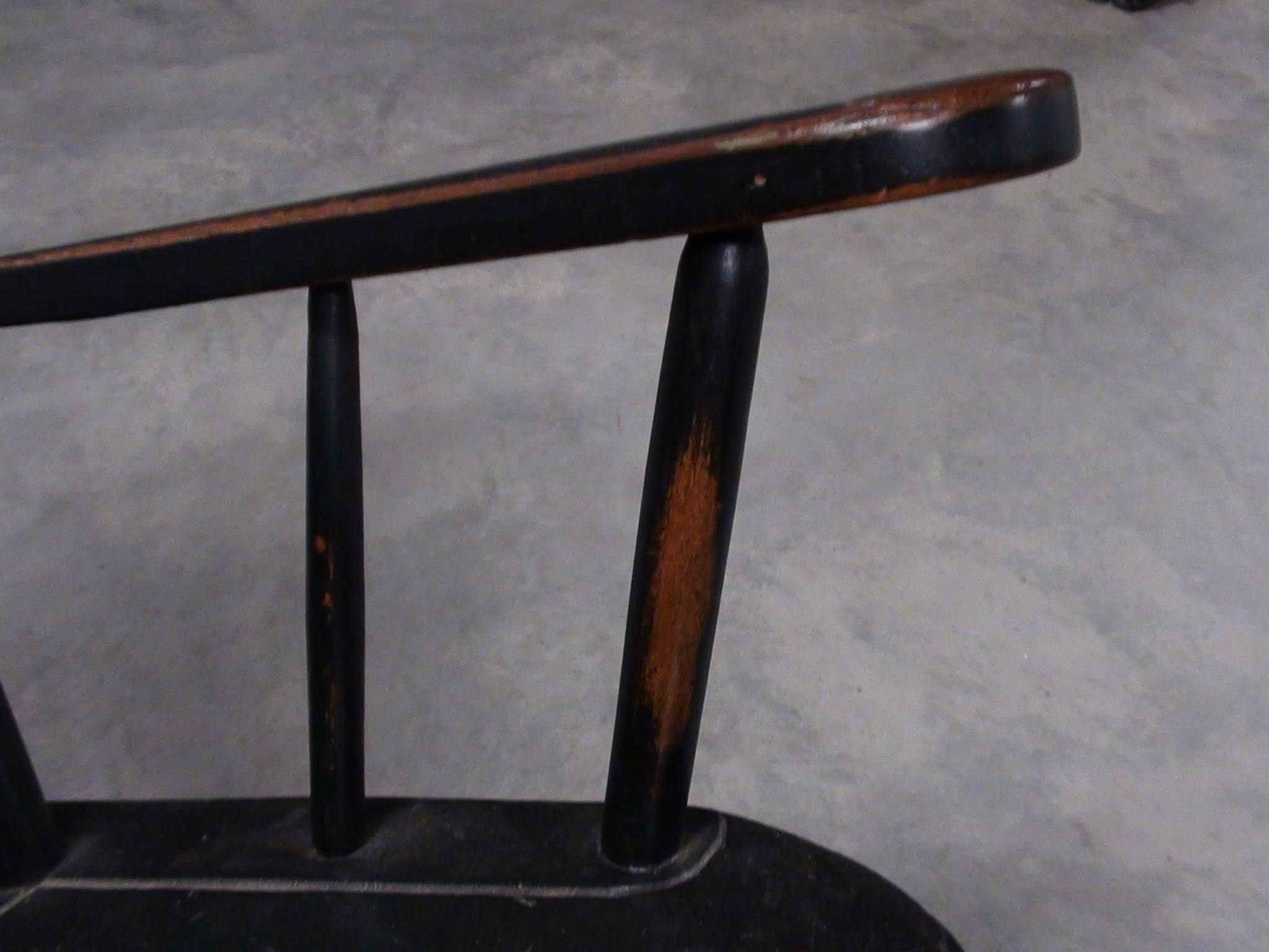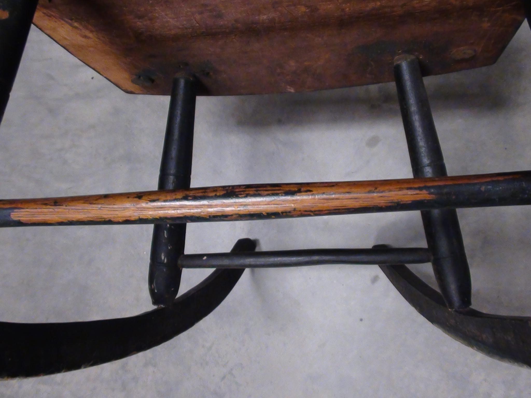 This old rocking chair has written on the bottom "Bought in Pontack 1835" The wood is aged and polished in spots from much use, has a lot of dull and dingy areas, and has an uneven dark coloring with a green cast. There are no modern fasteners used however there have been repairs made to the fractured spindles that had incorporated a few old tacks and such. Although the fractures are evident and not painted over, the repairs have held well and it is solid. The wood that is exposed in the polished areas appears to be Cherry wood. This rocker appears to be handmade and uses dowel and wedge to join the seat to the spindles. I don't know any history of this piece as I acquired it from an individual that was moving about 20 years ago. I have no idea of its value or worth.