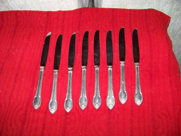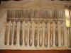 There are: 1 butterknife, 1 sugar spoon, 1 serving spoon, 8 knives, 8 dinner forks, 8 salad forks, 8 soup spoons, 14 teaspoons.