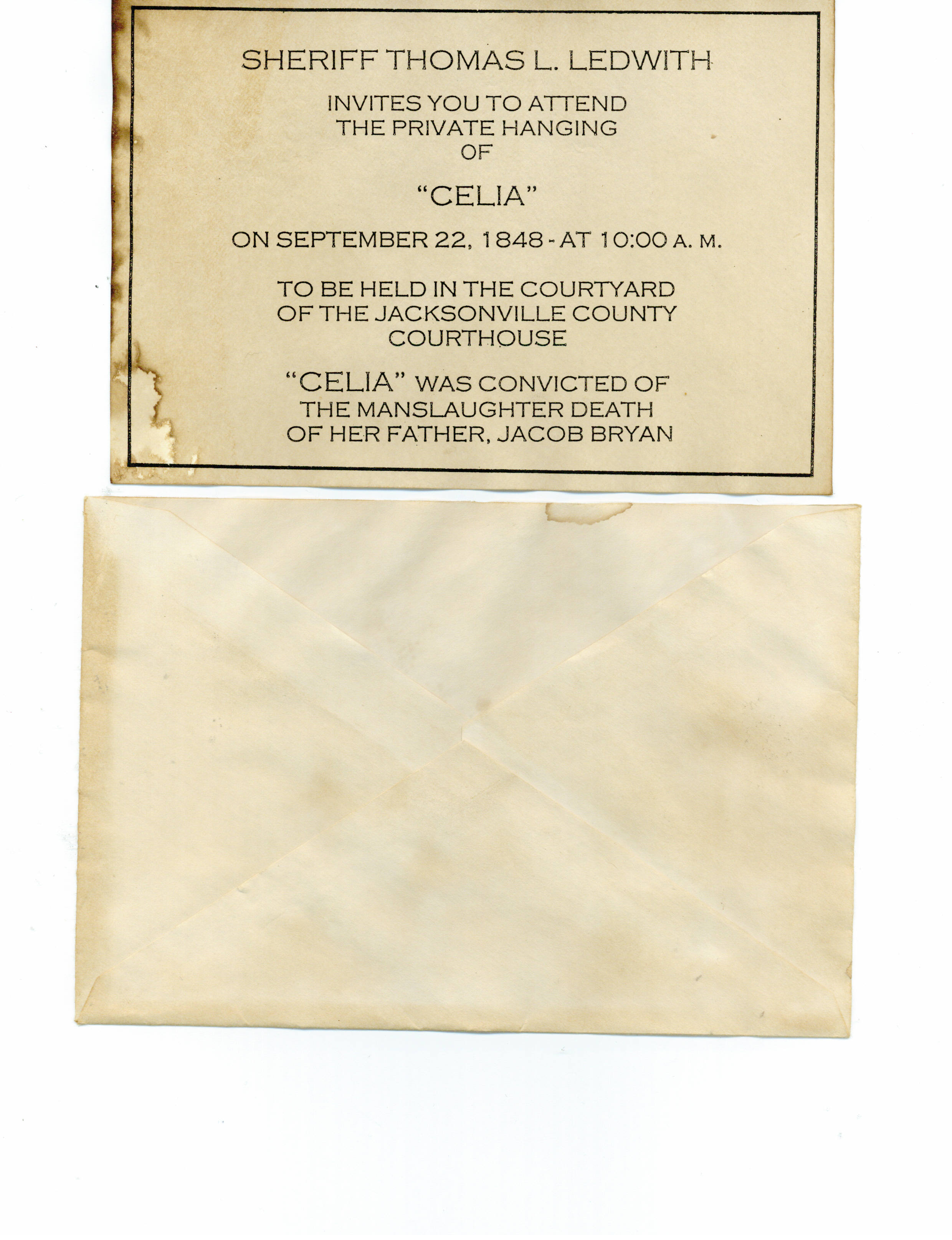 It is an invitation from a Sheriff Thomas L. Ledwith in Jacksonville County, to attend a Private Hanging of a person by the name of "Celia"
