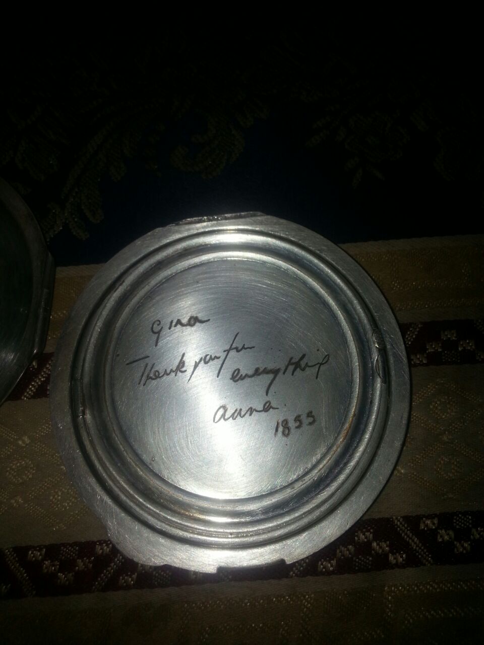 A beautiful silver Powder compact with inscription: Gina, Thank you for everthing, Anna 1855