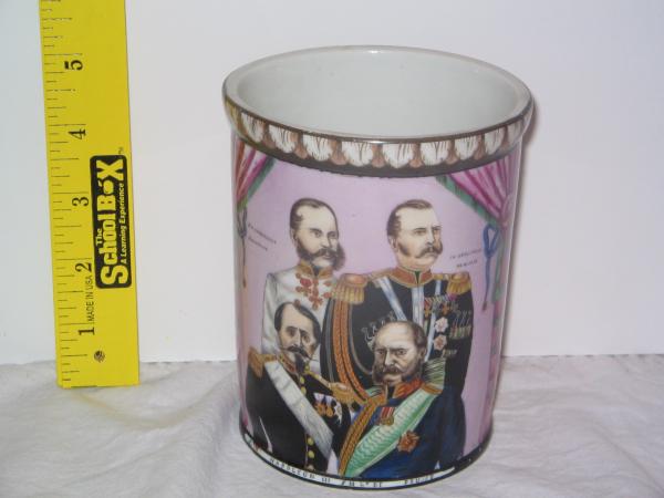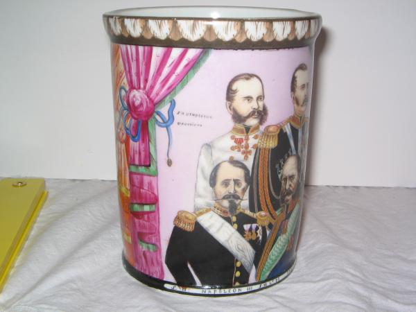 it is a vase that i believe commemerates the Treaty of Versailles. It has Four Emperors on it, the ruler of prussia, austria, russia, and Napoleon III of france. It has writing on the bottom rim i believe it is french with Napoleon III in big letters and the ruler of prussia. I cant make out the writing on the bottom of the vase. but it was handcrafted and painted. some of the paint is old but all in all it is in good condition