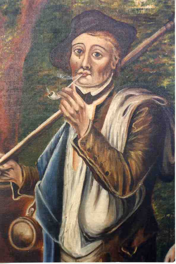 16"x20" oil on canvas by unknown artist. Stencil on canvas back is from Boston MS art store that opened in 1869. Patched on canvas back indicate that previous owner took care of painting. Notice the characters in the painting have BIG EYES.