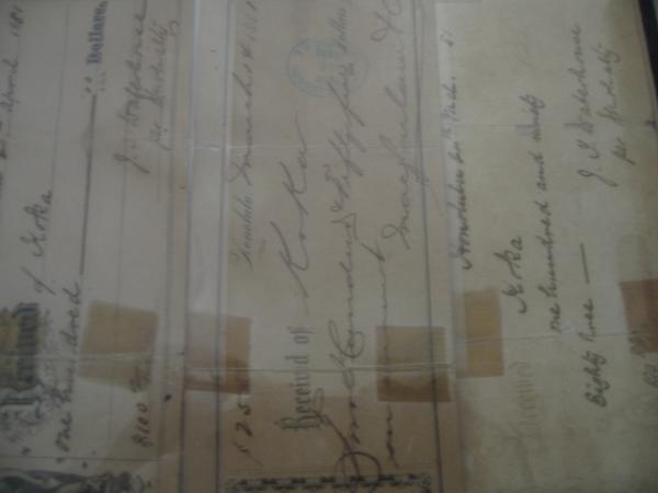 There are 3 checks dated 1881 for $100, $255, and $190.83. One of the checks has been stamped macfarlane and co. The other checks have names of J.Y Waterhouse per Shiok Ashly (I cannot read the name).